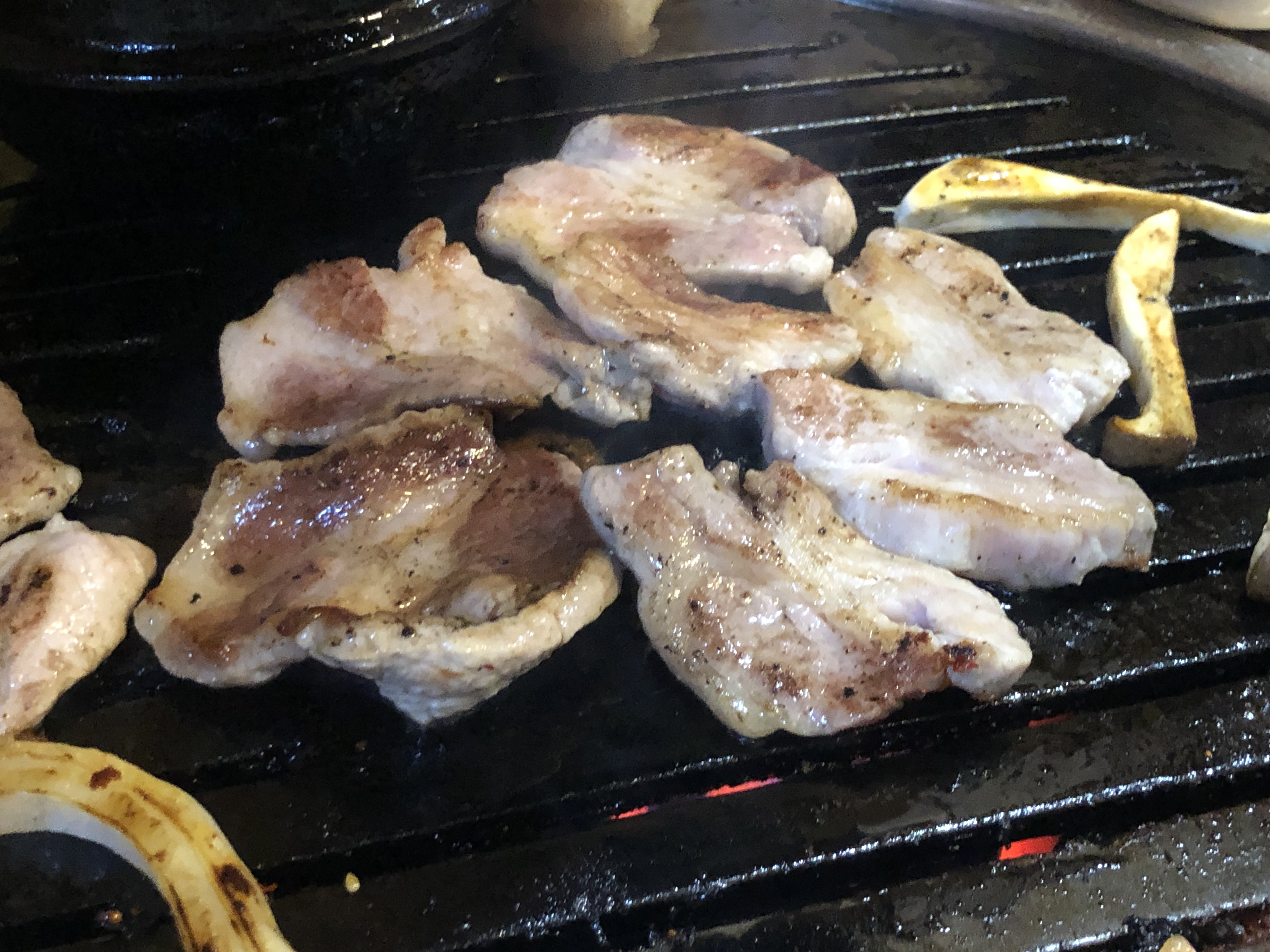 모듬에는 돼지껍데기도 함께 제공되는데 구울때 튈 수 있으니 조심히 구워줍니다.