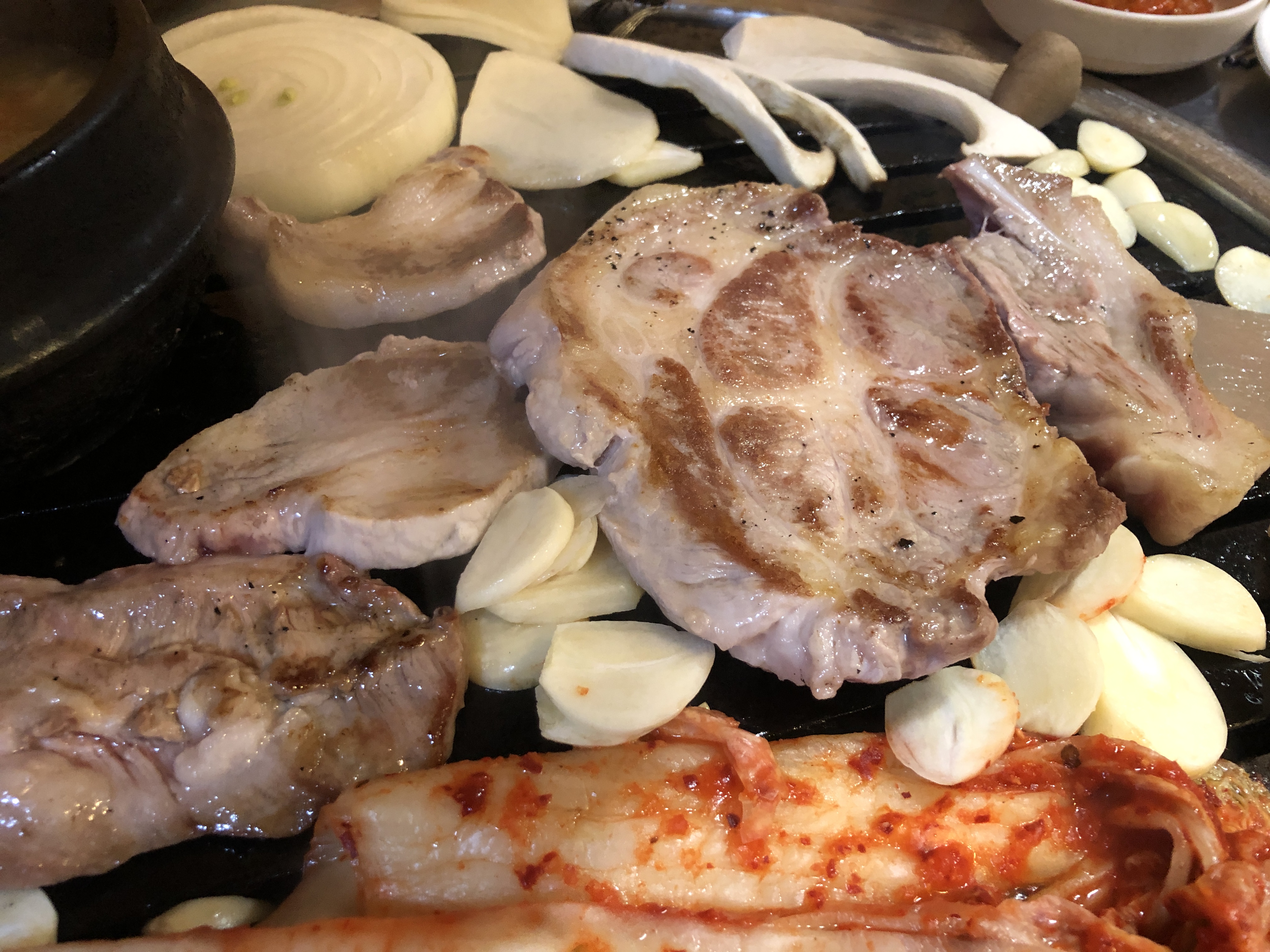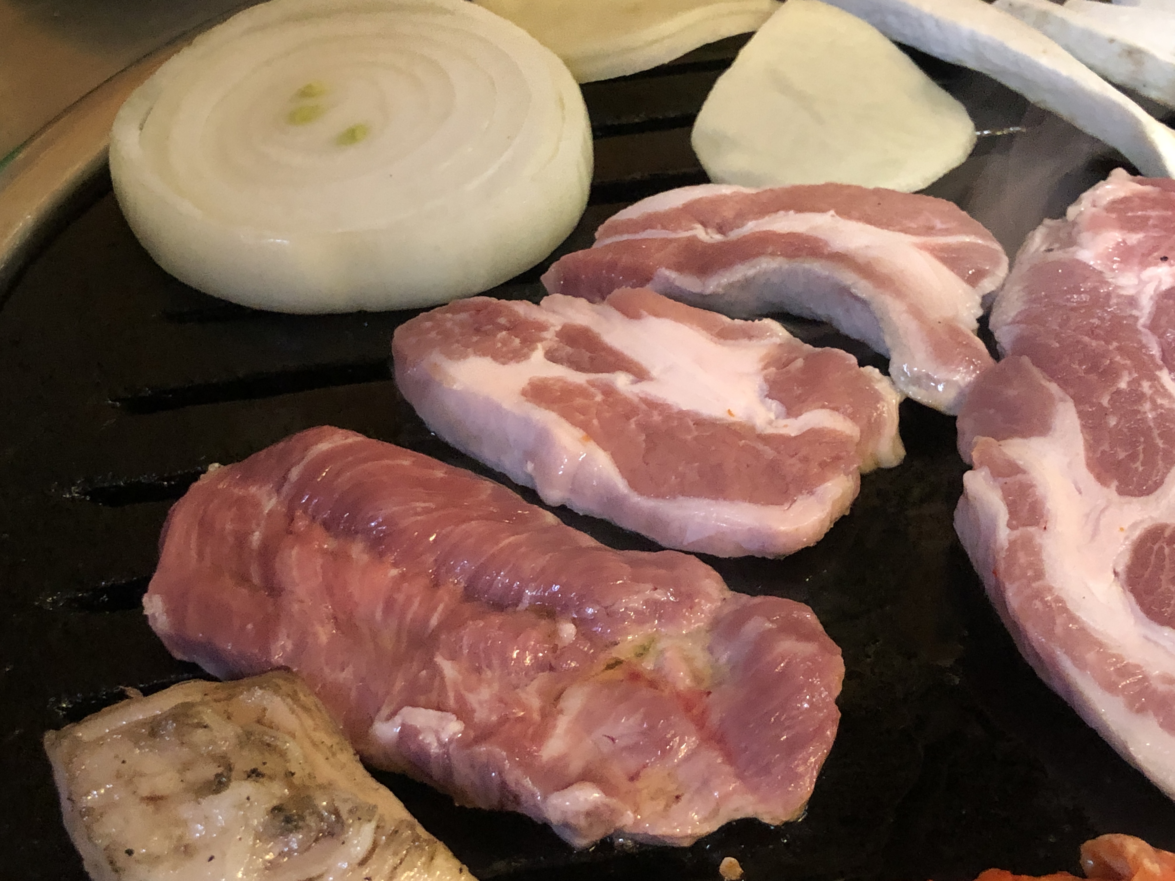 잘 달궈진 연탄불판 위에 부위별 고기를 올리고 김치도 함께 올려서 구워봅니다.