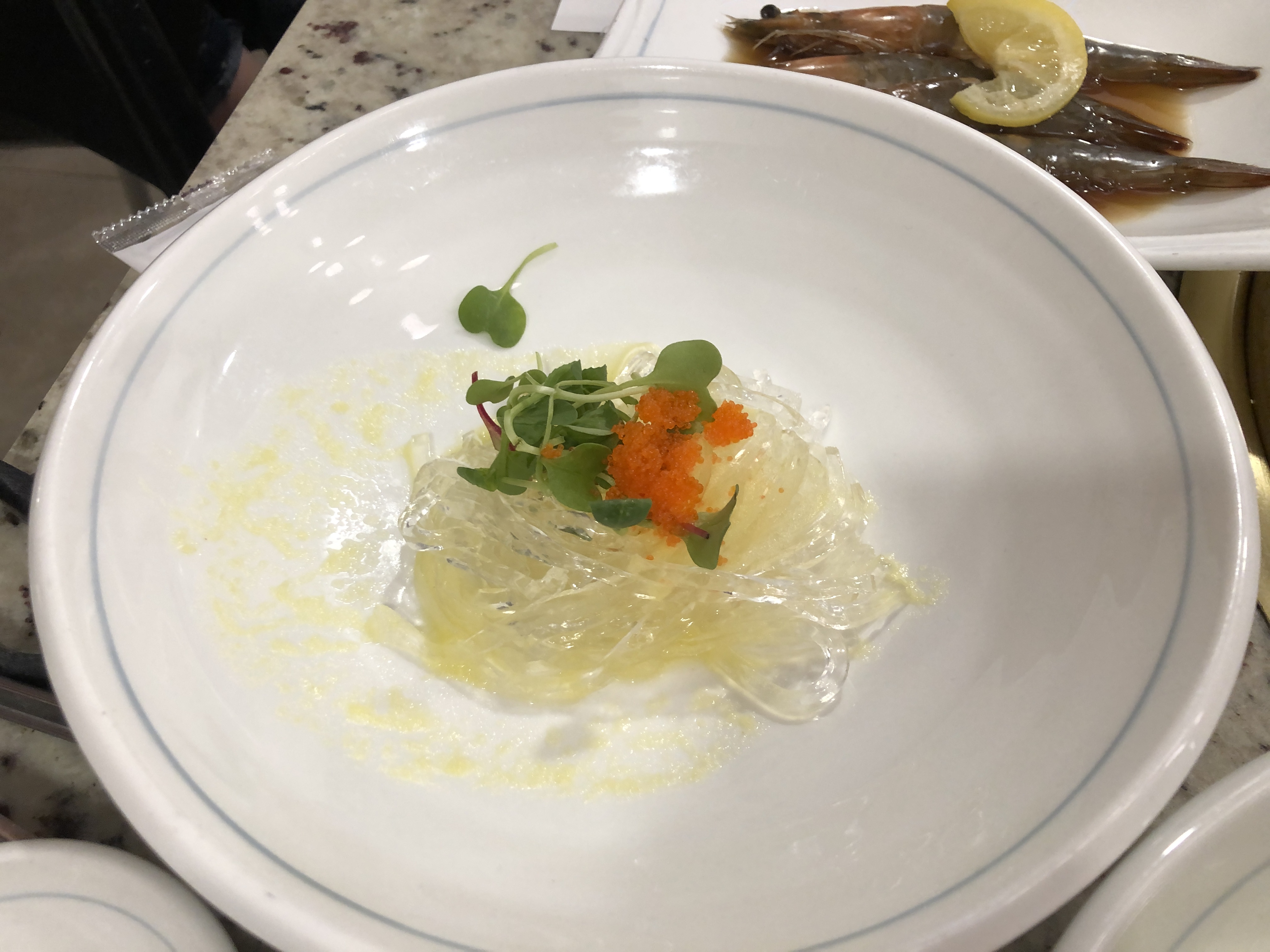 날치알이 데코된 우뭇가사리(같은 것과), 리코타 치즈가 뿌려진 샐러드,