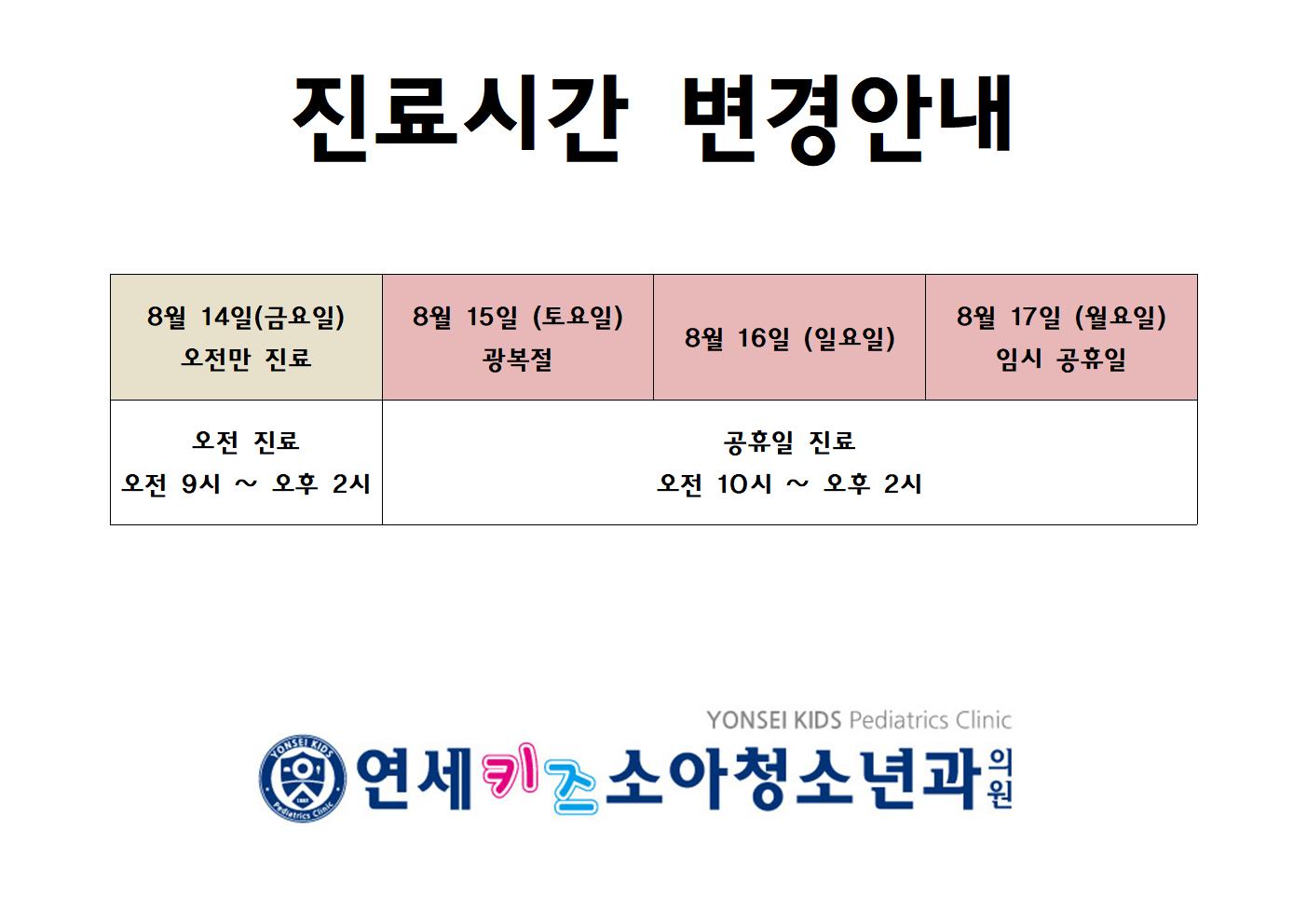 2020년 8월 14일(금) ~ 17일(월) 진료시간 변경