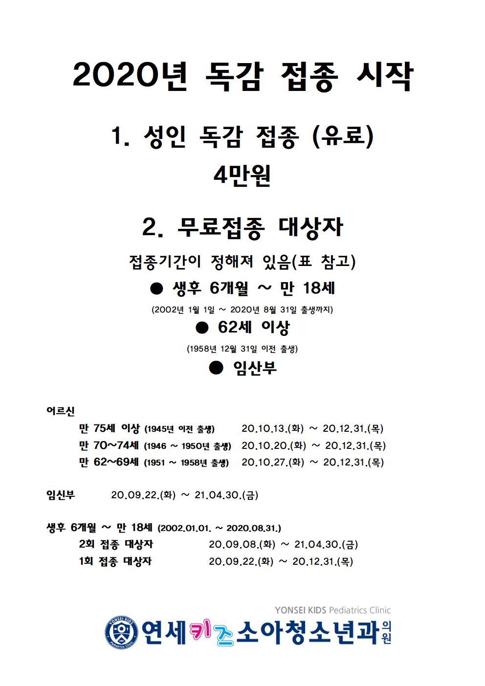 올해부터는 독감4가접종이 무료가 되었고 대상도 넓어졌습니다.