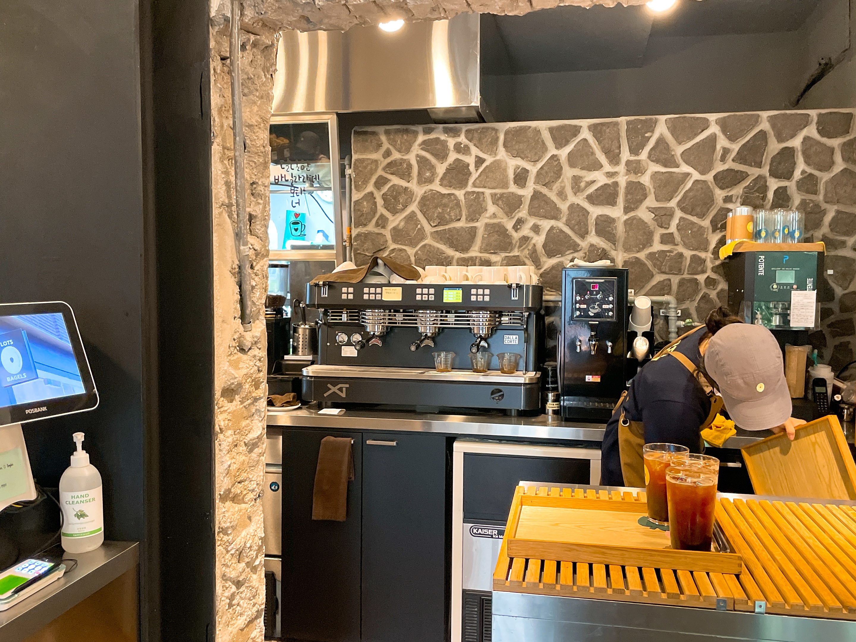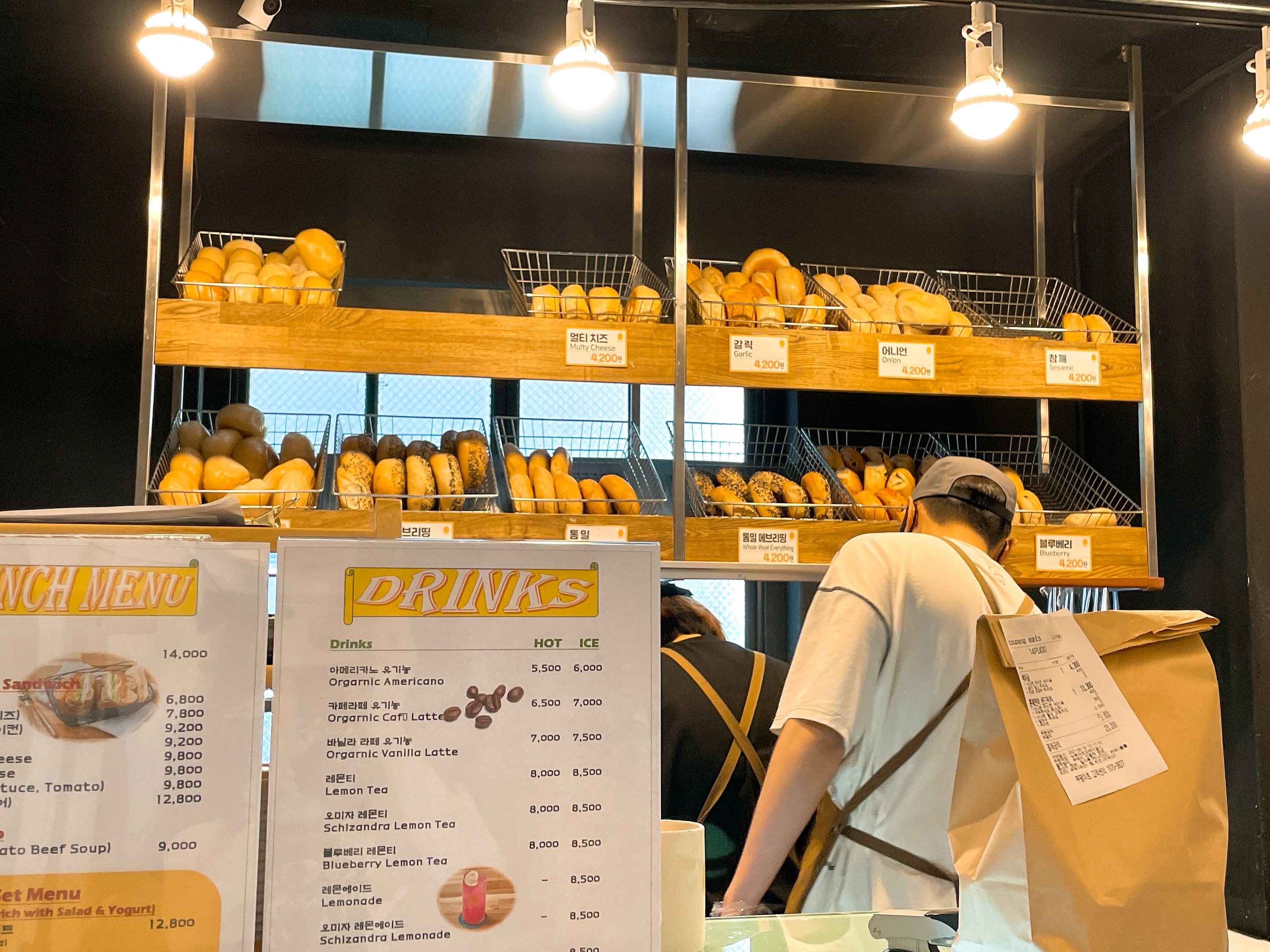 한쪽에는 베이글과 크림치즈를 만들고 다른 한쪽에선 커피를 만들고 있네요.
