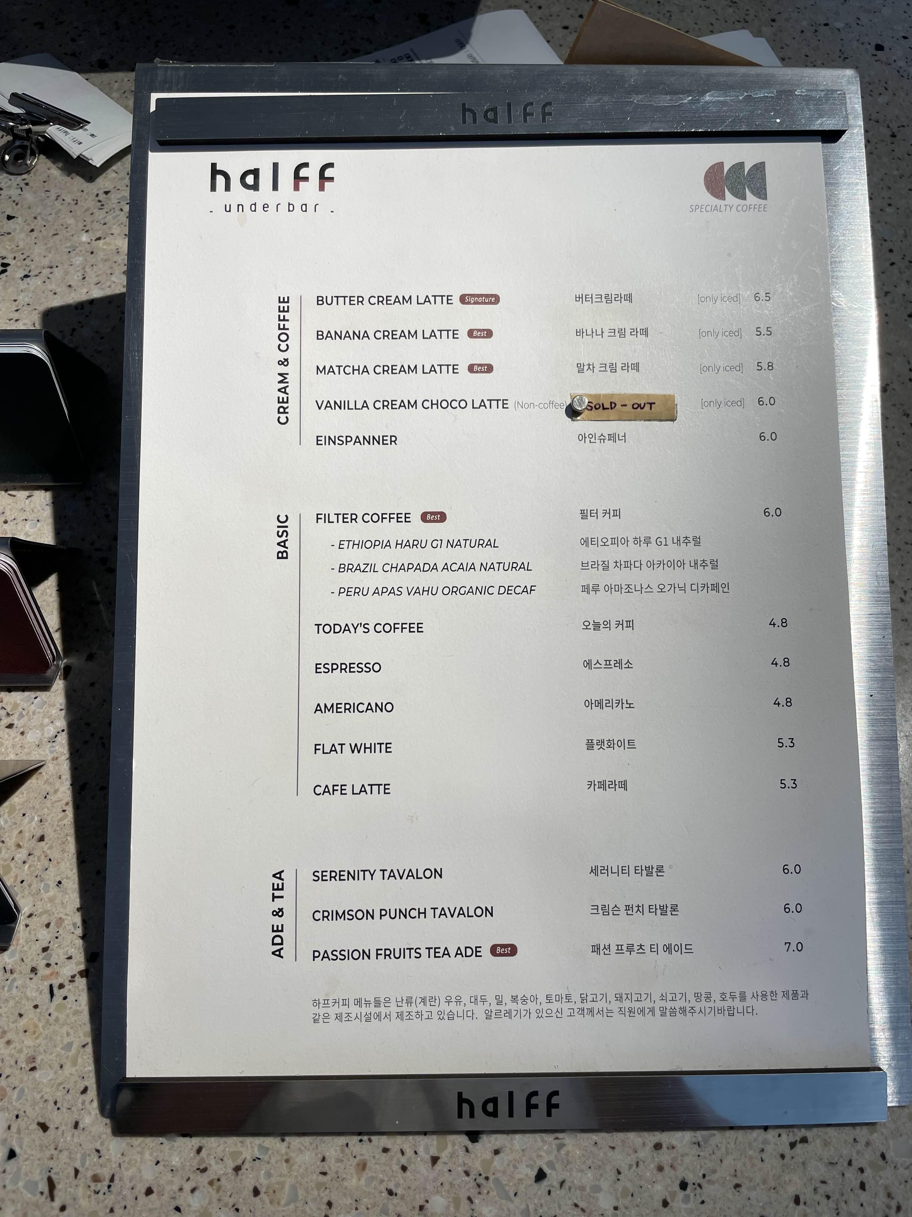 •정보: 하프 성수 플래그쉽 스토어인 '하프 언더바(halff underbar)'는 하프커피 아래의 바(bar), 공백을 채우는 기호 '_'언더바 두개의 중의적 의미를 내포하는 공간으로 커피와 베이커리, 와인과 간단한 푸드까지 다양한 음식과 문화를 즐길 수 있는 공간입니다.
