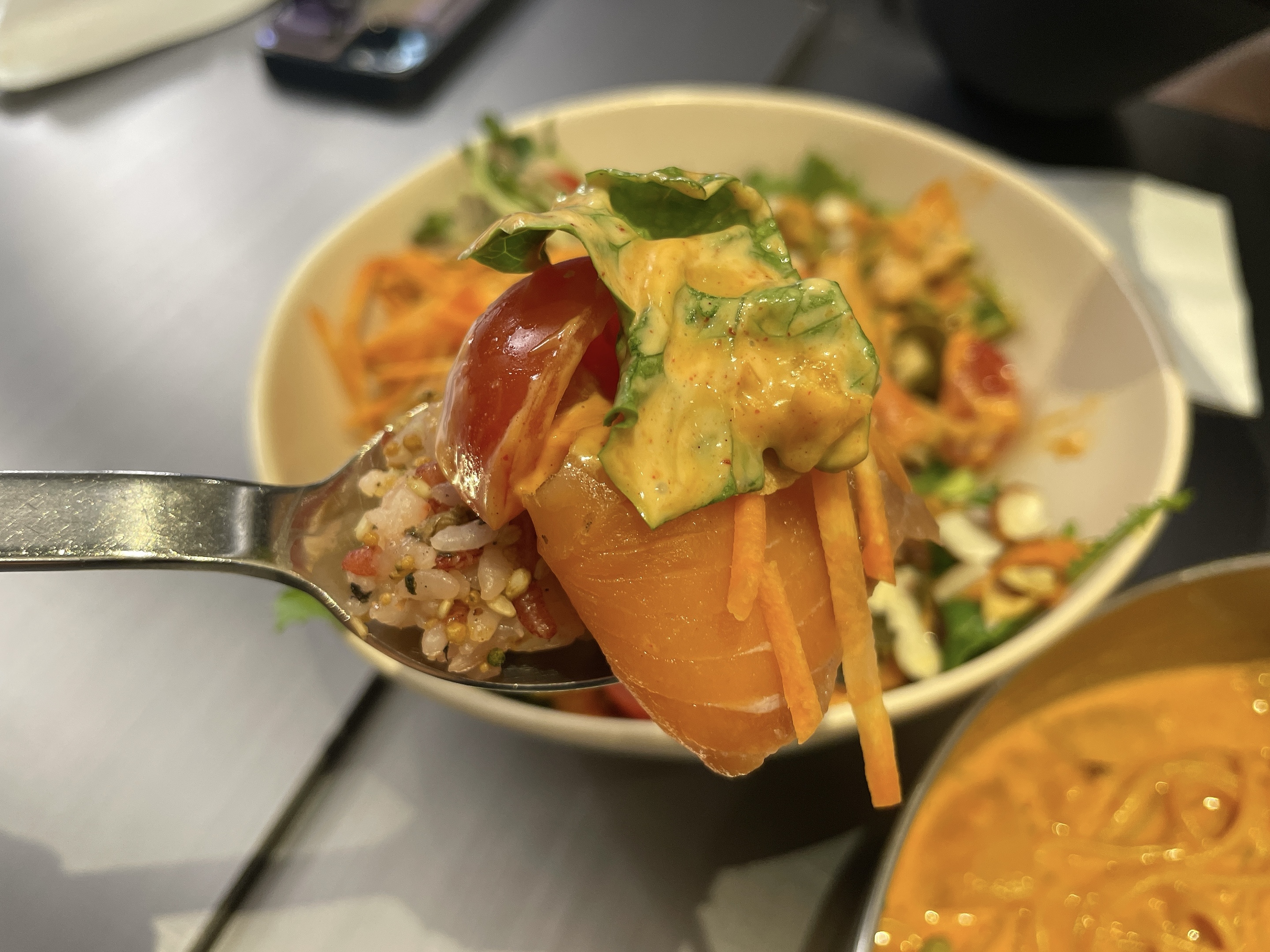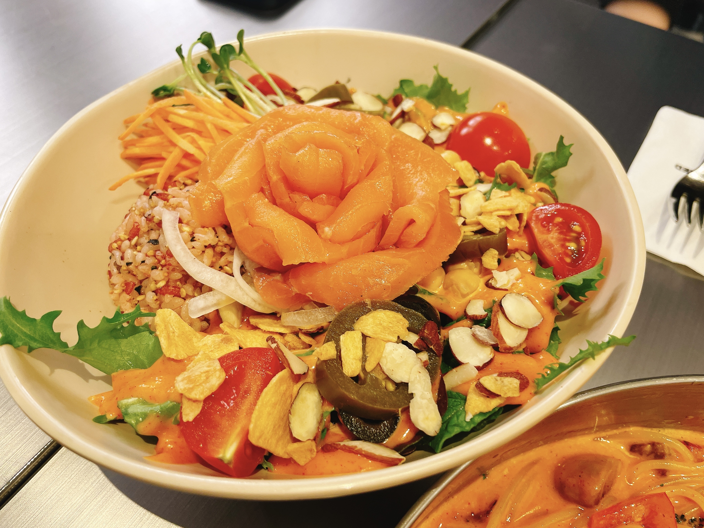 담백한 훈제연어를 한 잎씩 걷어먹는 재미가 있는 포케인데, 연어가 마치 장미꽃처럼 예쁘게 플레이팅 되어 있었습니다~