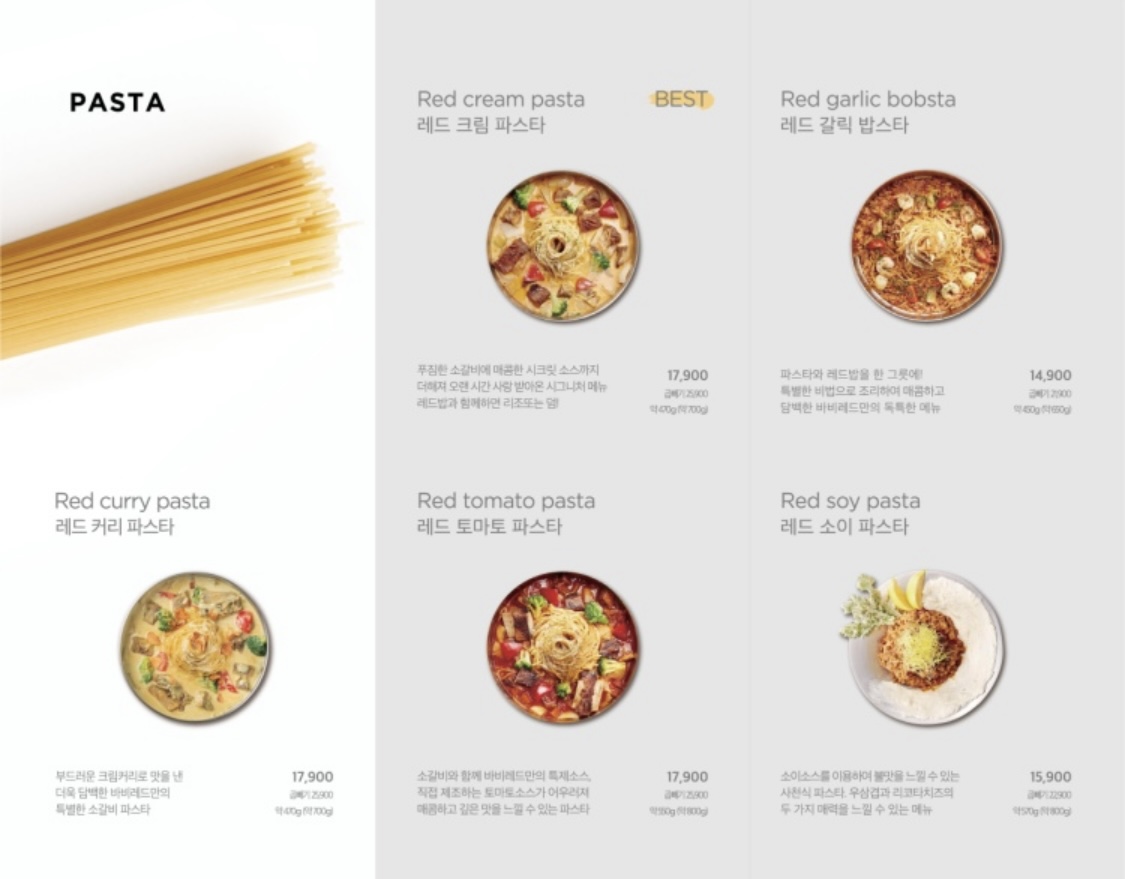 파스타는 레드 크림 파스타, 레드 토마토 파스타, 레드 갈릭 밥스타, 레드 소이 파스타, 레드 커리 파스타가 있다고 하네요.