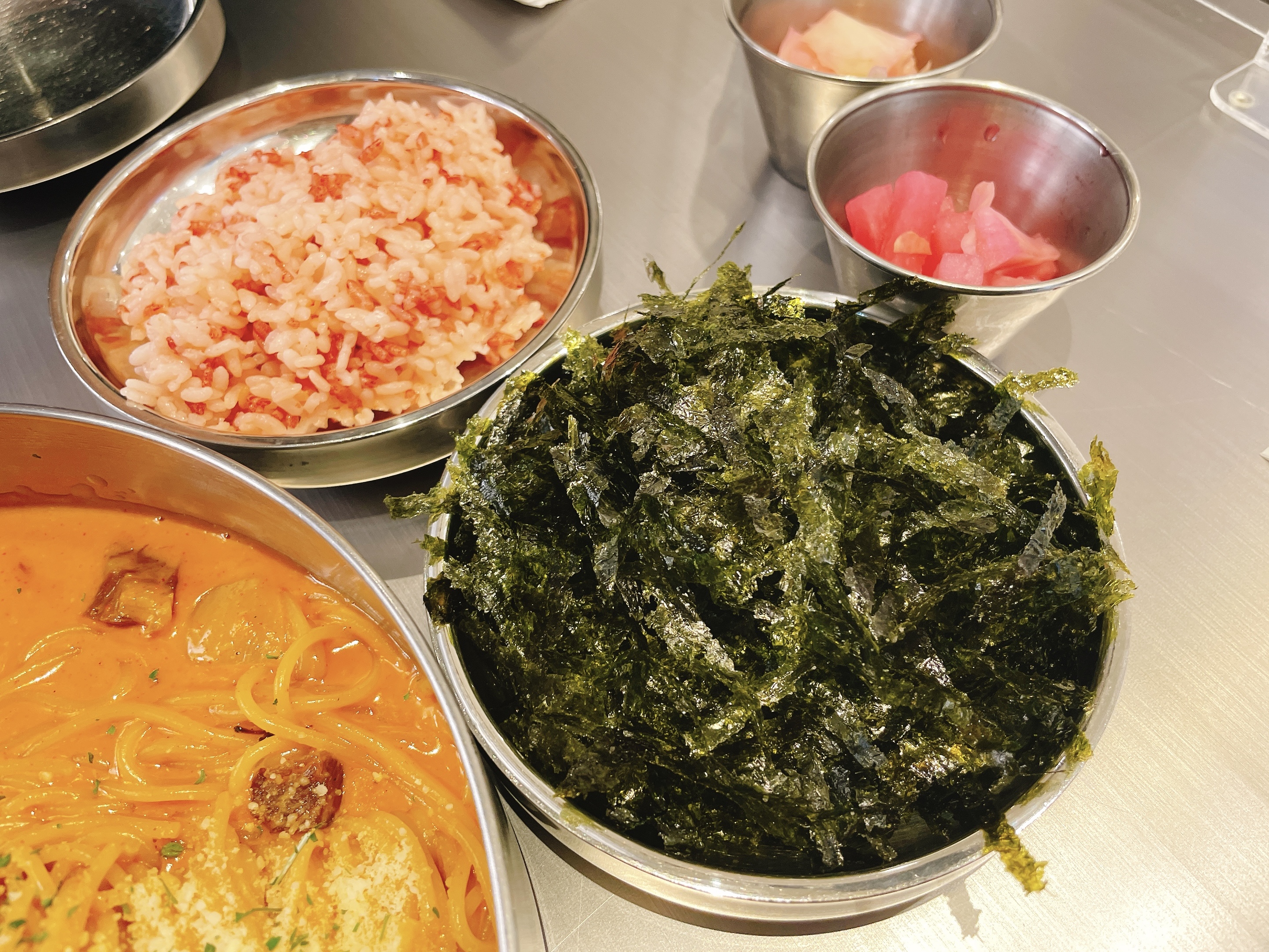 셀프코너가 있어서 파스타나 스테이크와 먹을 수 있는 밥이나 김가루, 피클류를 양껏 가져다 먹을 수 있습니다!