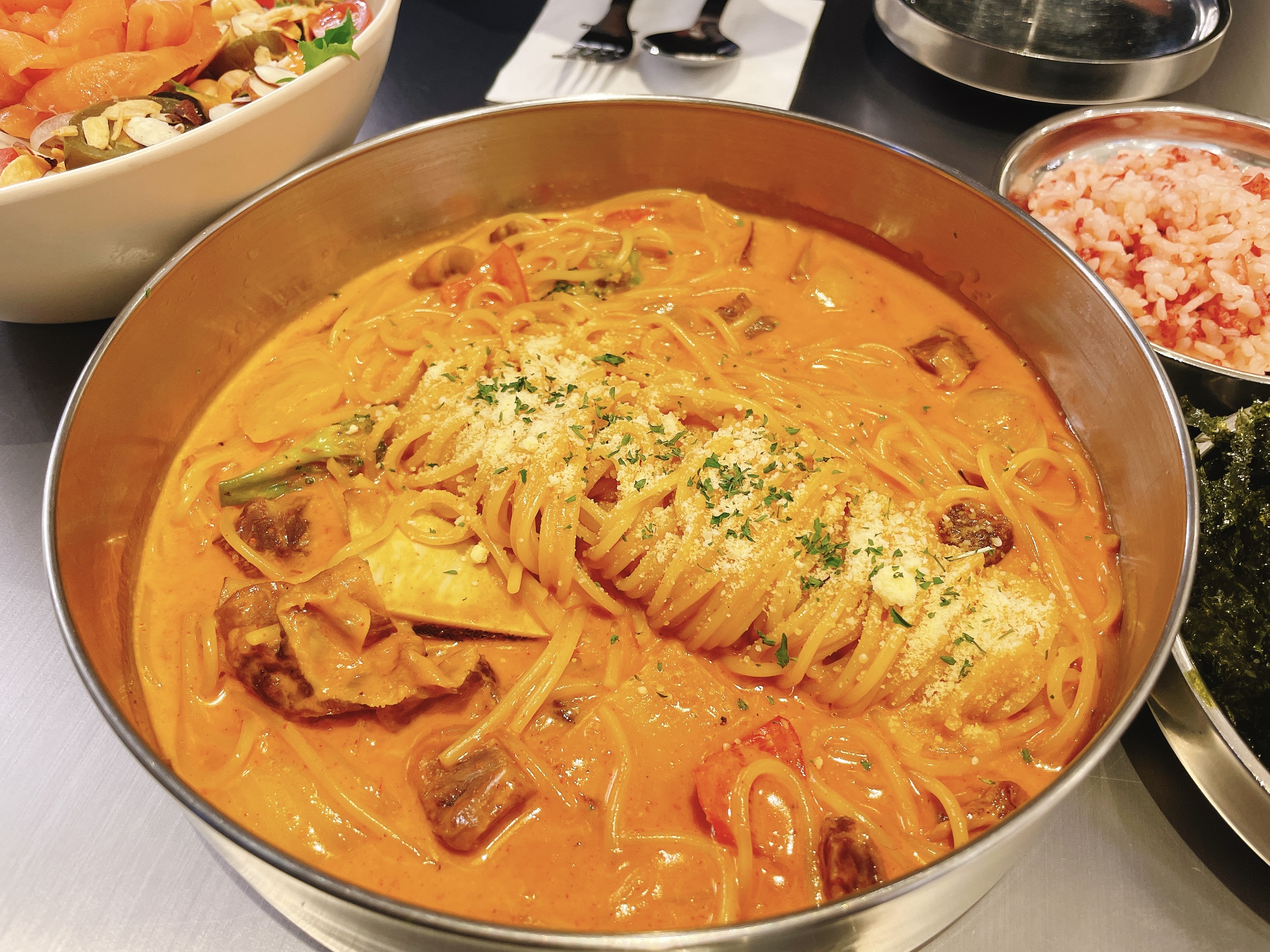 레드 크림 파스타는 푸짐한 소갈비에 매콤한 시크릿 소스가 일품인 메뉴였는데요, 셀프코너에 있는 레드밥과 함께 먹으면 리조또로도 즐길 수 있는 장점이 있는 메뉴였습니다!