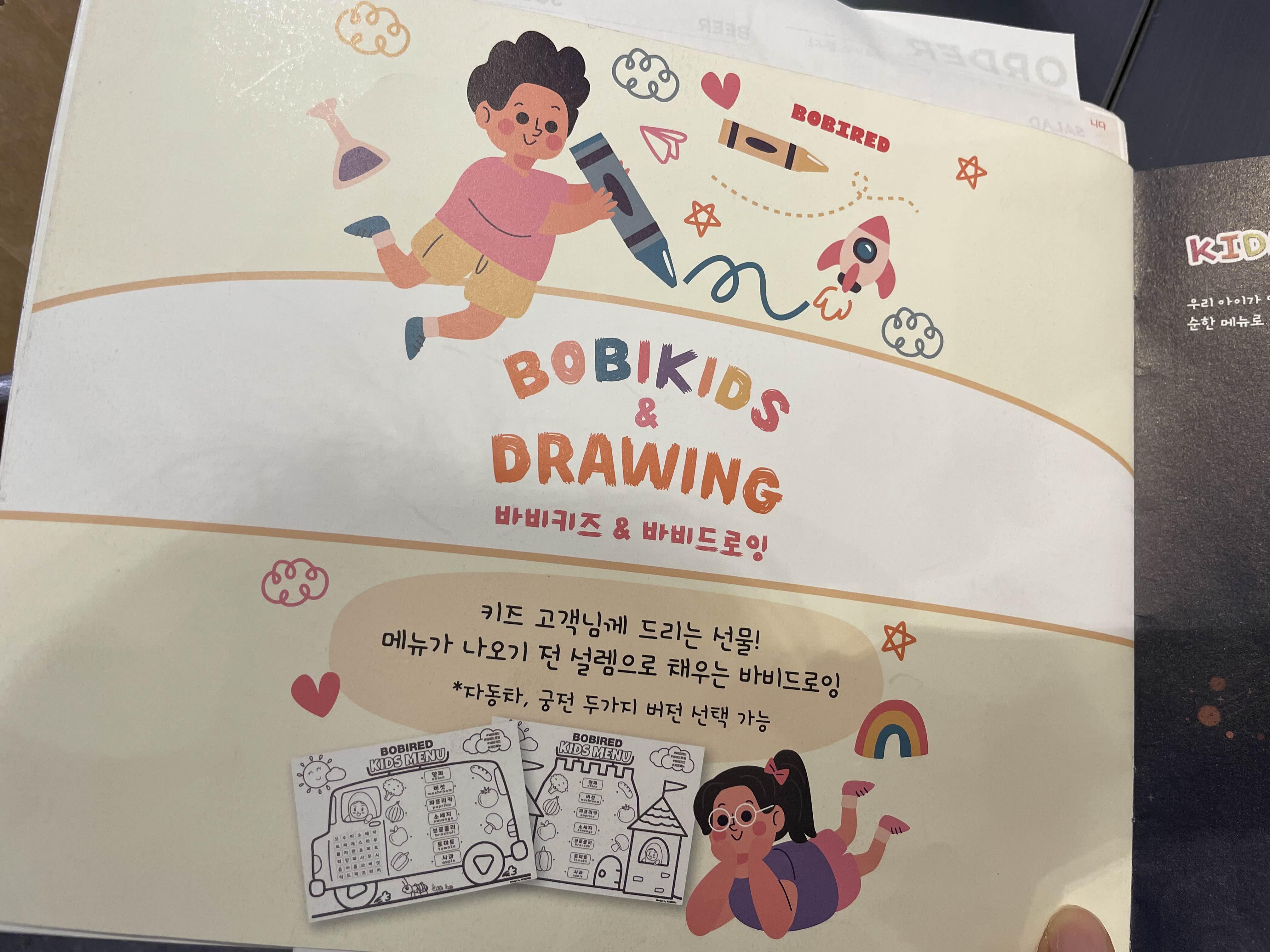 아이들이 음식을 기다리는 시간을 재미있게 보낼 수 있게 색칠놀이와 같은 것도 준비되어 있고,