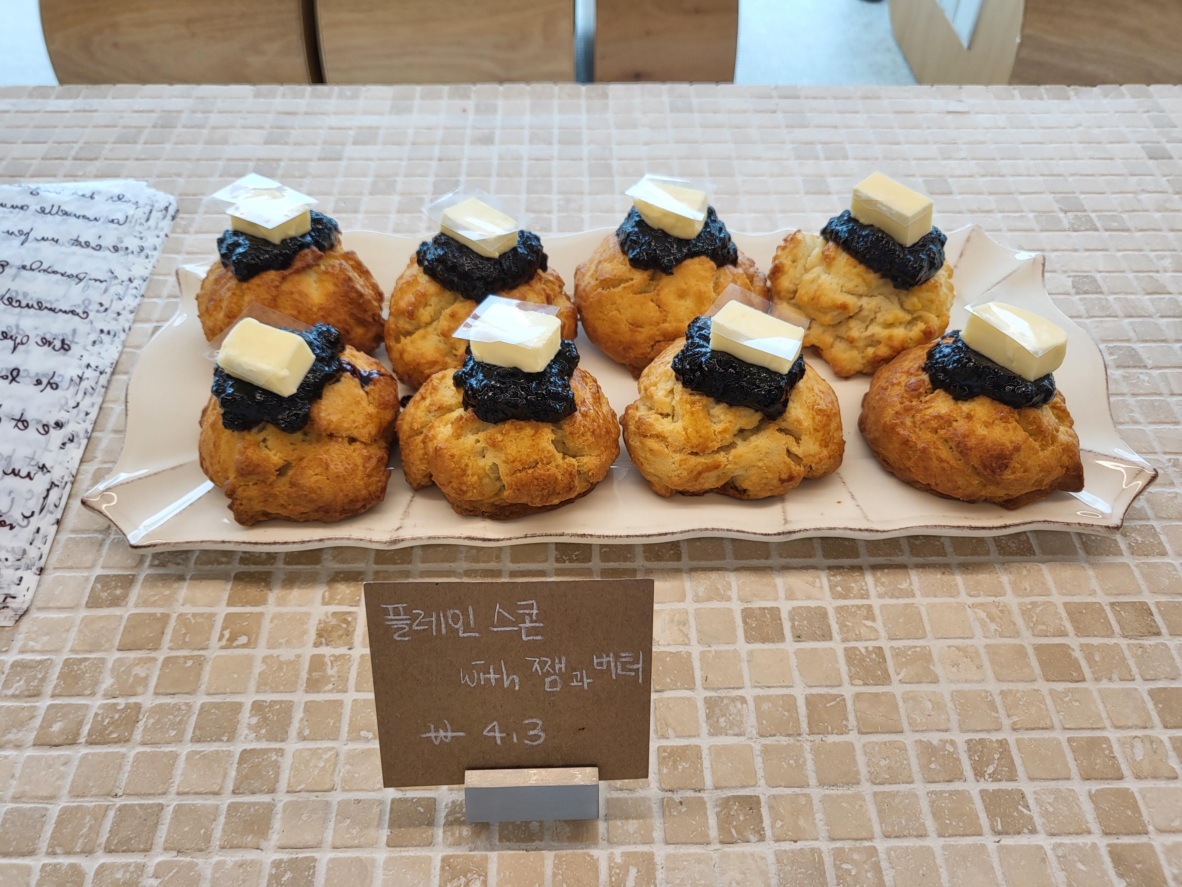 플레인 스콘에 쨈과 버터가 예쁘게 올라간 것도 있고, 단호박 크림치즈스콘도 있었습니다.