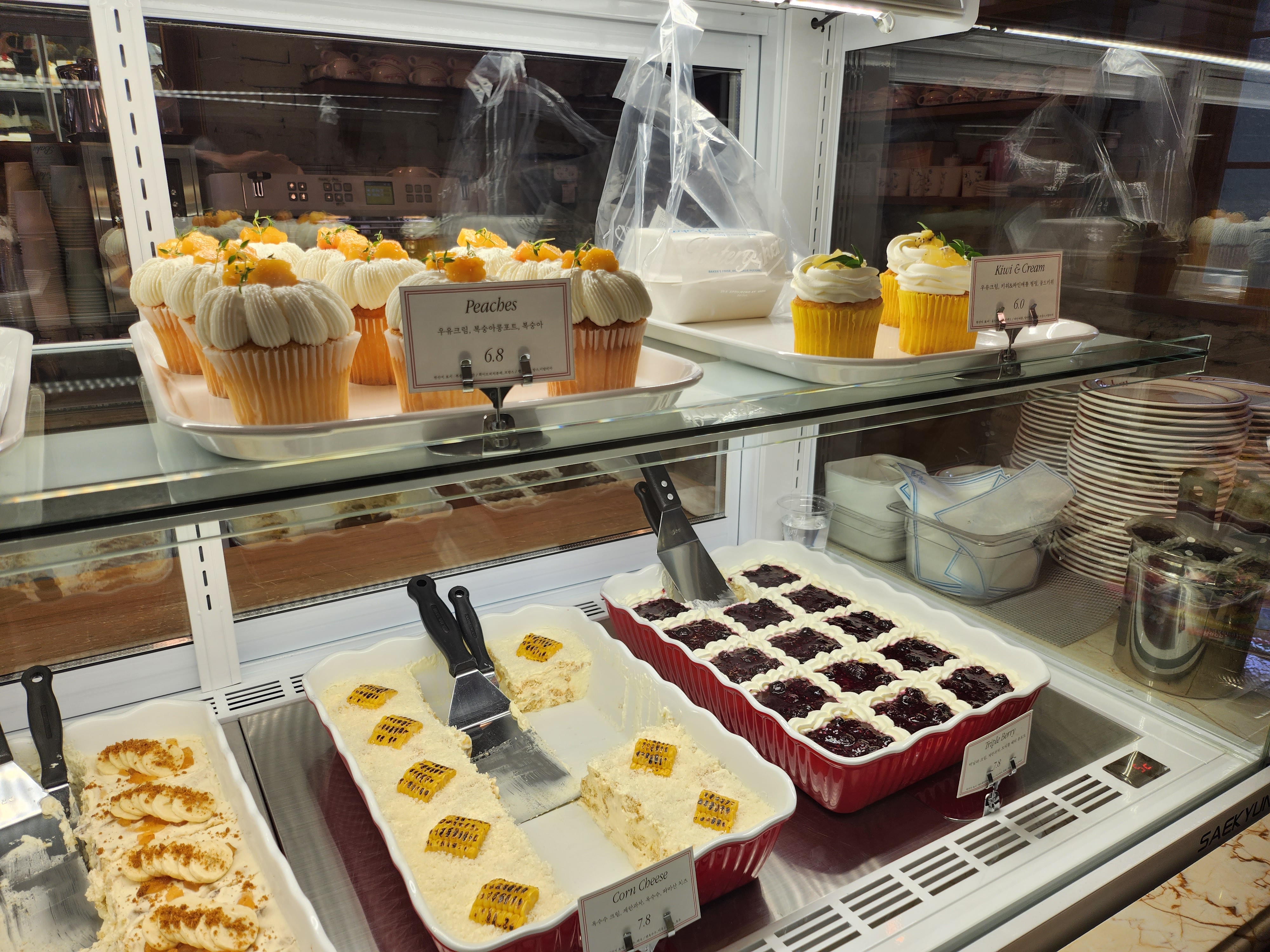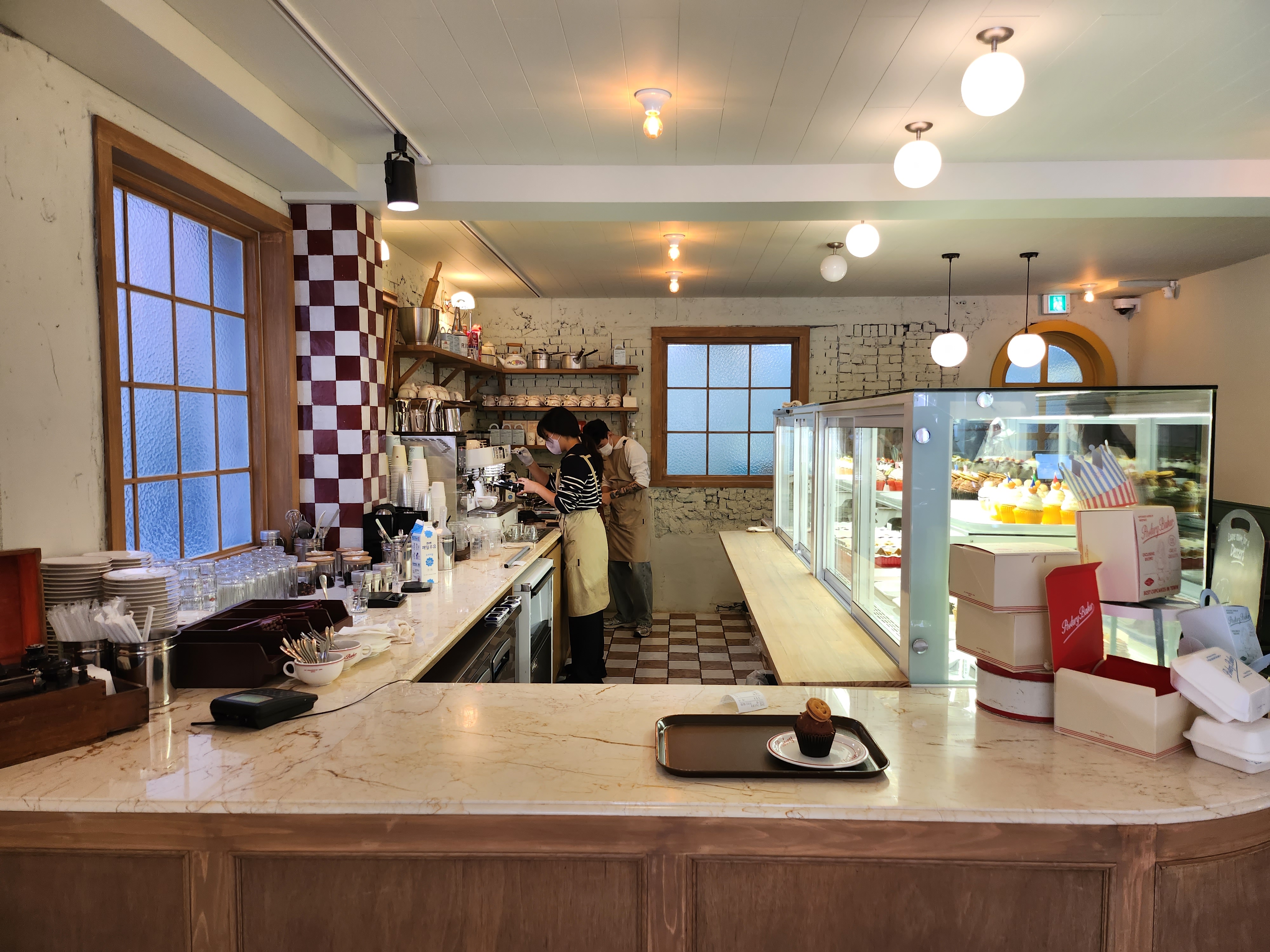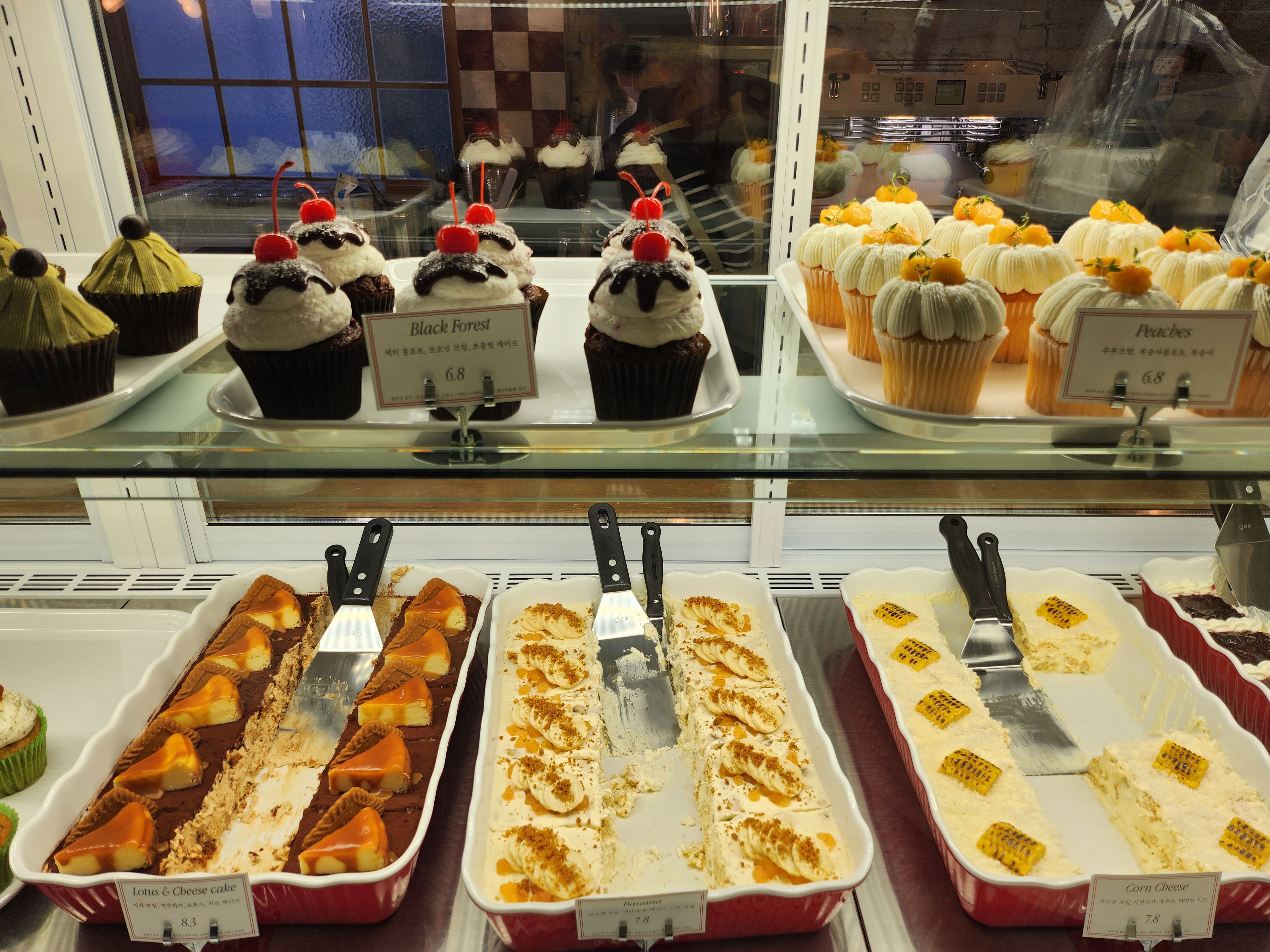 왼쪽편에는 예쁜 창가 자리와 케이크가 있는 쇼케이스 그리고 카운터가 있습니다.