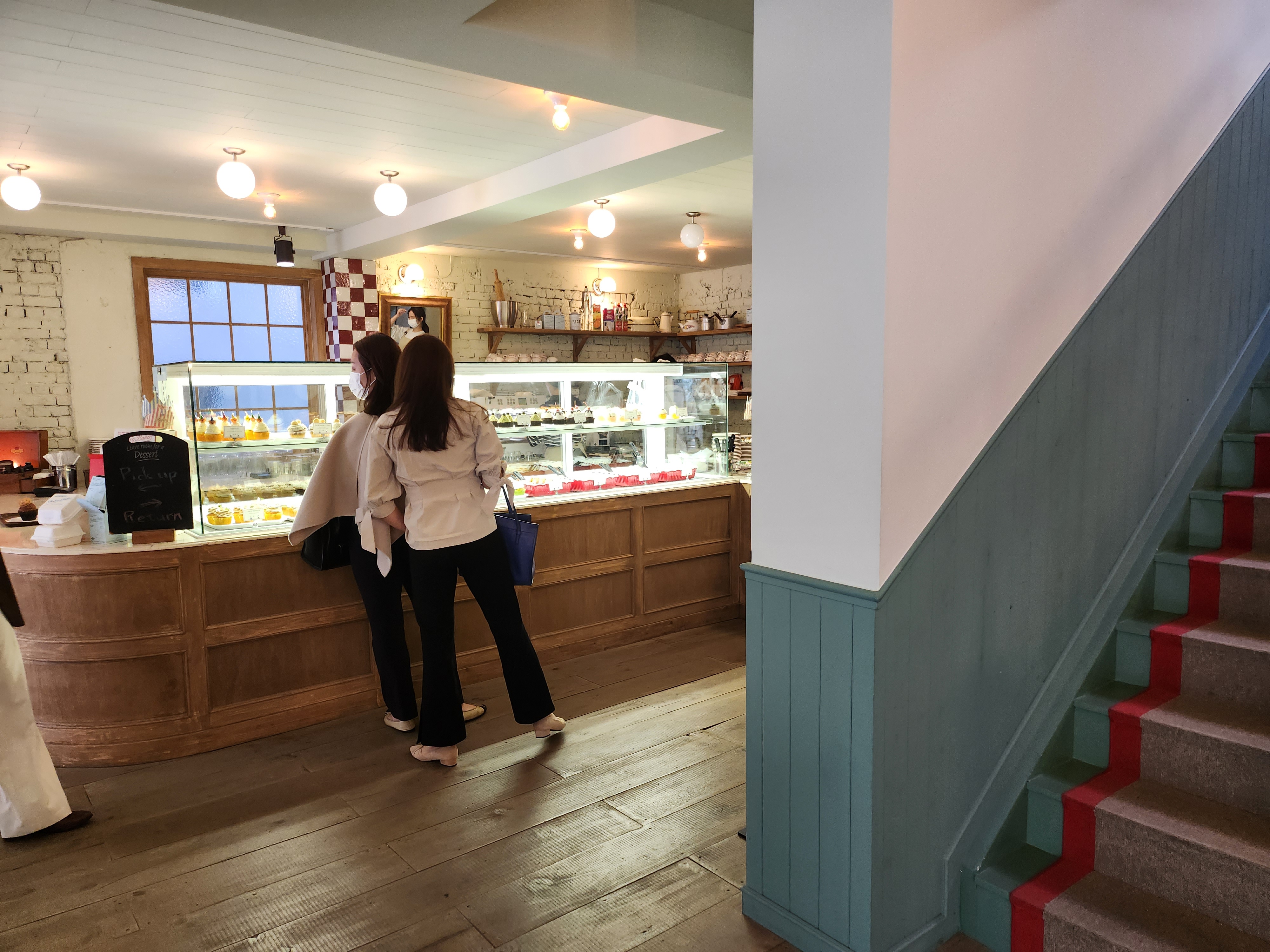 압구정 케이크 맛집 포스터리 베이커 내부는 민트 컬러에 우드톤이 더해져, 따뜻한 분위기가 느껴졌습니다.