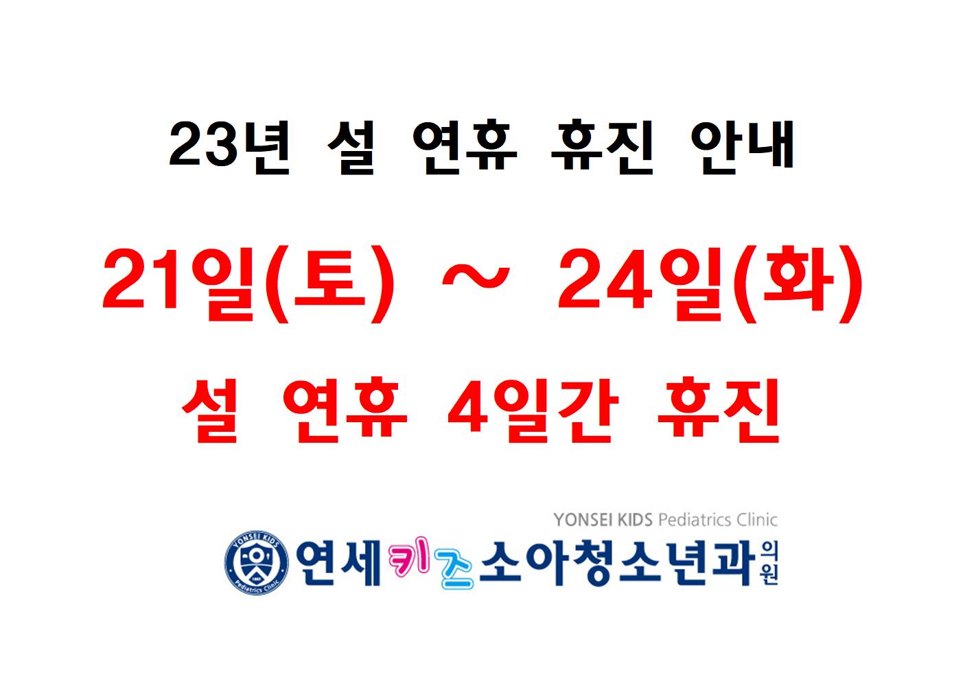 2023년 설 연휴인 1월21일(토)부터 24일(화)까지 휴진 합니다.