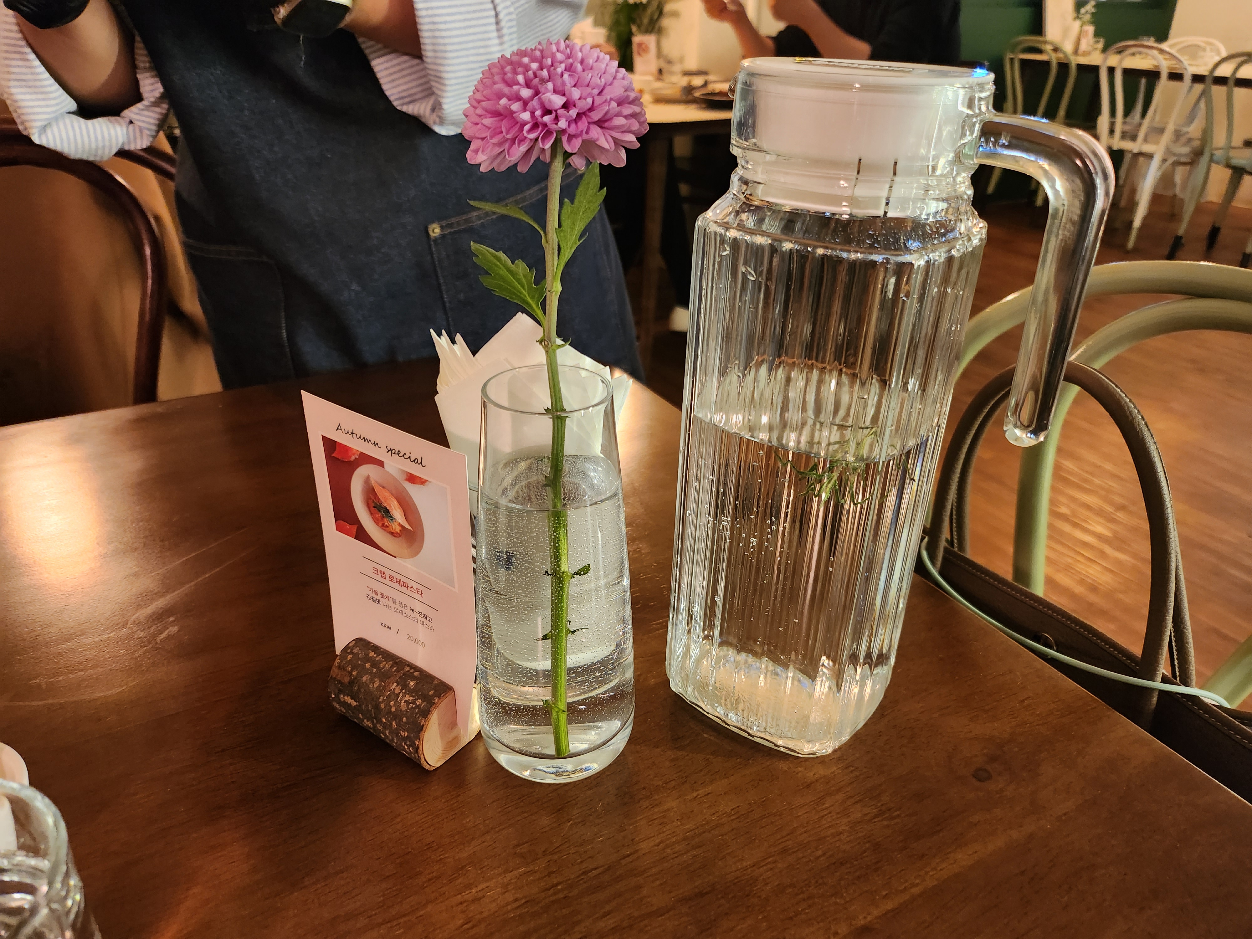 테이블에는 예쁜 꽃 한송이가 꽂혀있네요~