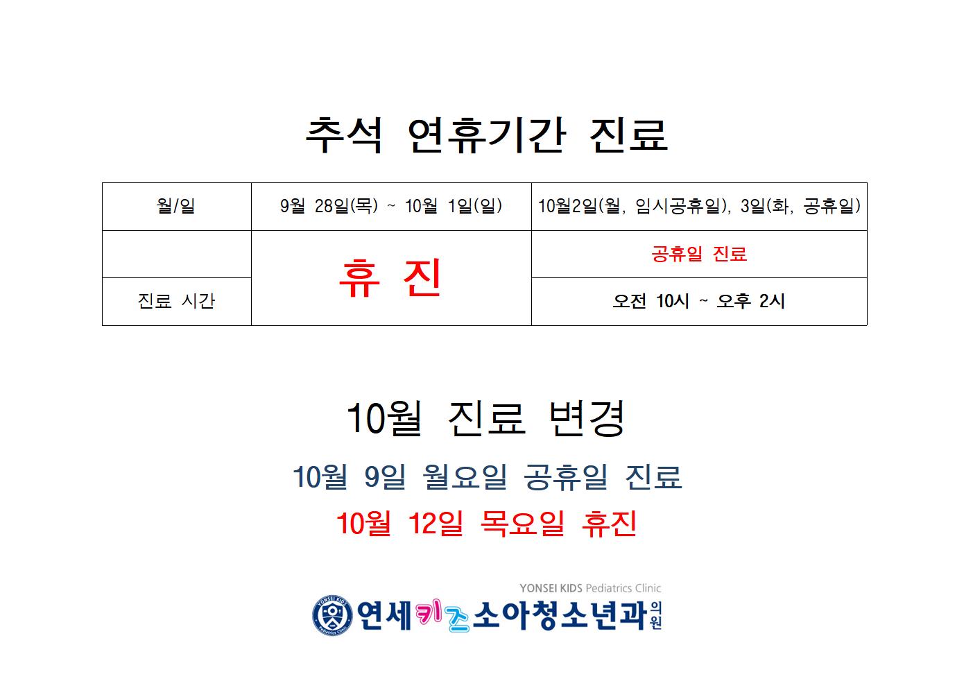 추석연휴 휴진일정과 10월 휴진이 있어 공지합니다.