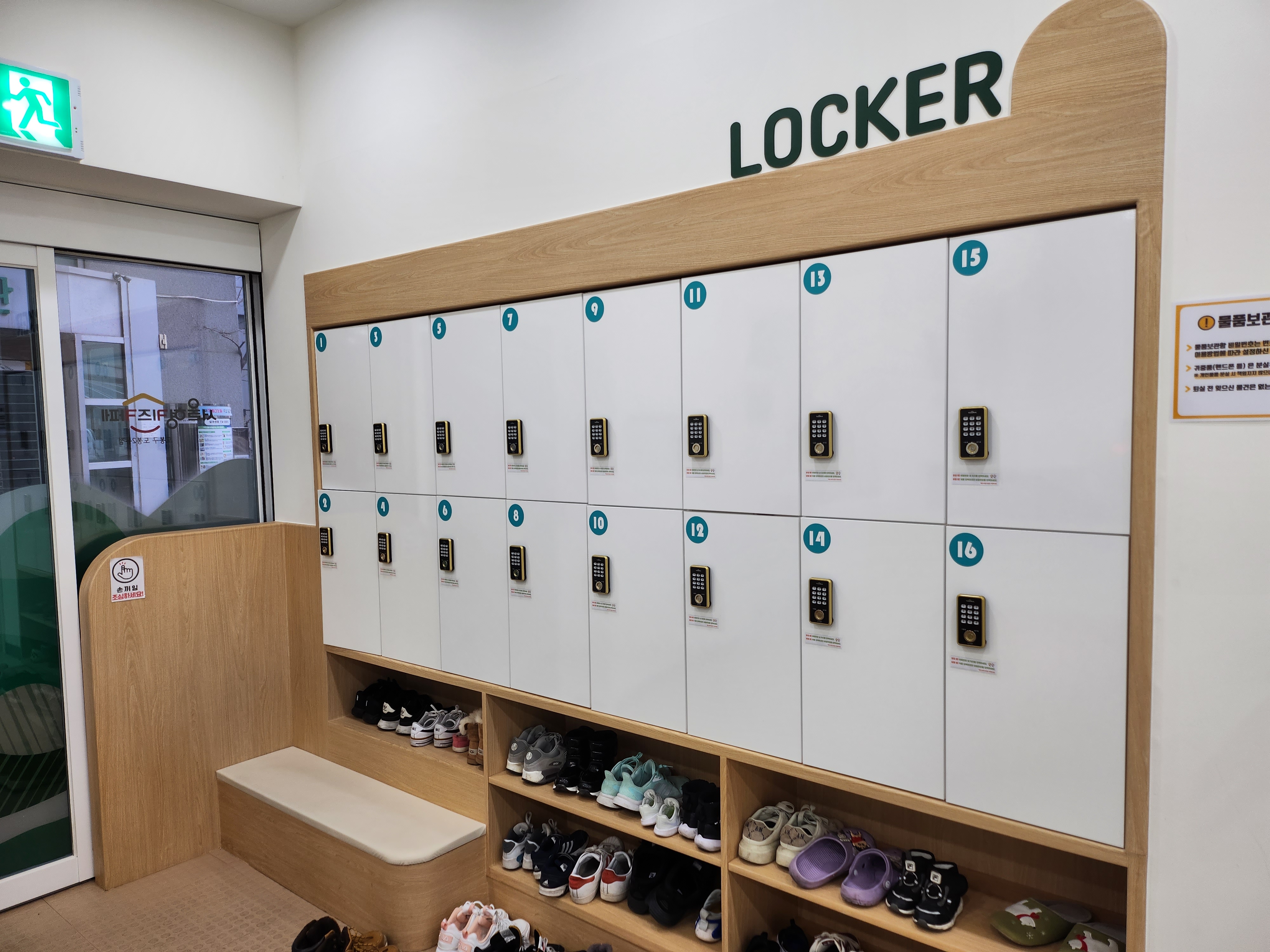그리고 입구에 마련된 사물함에 개인물품을 보관하면 되고, 신발은 신발장에 잘 보관하면 됩니다!