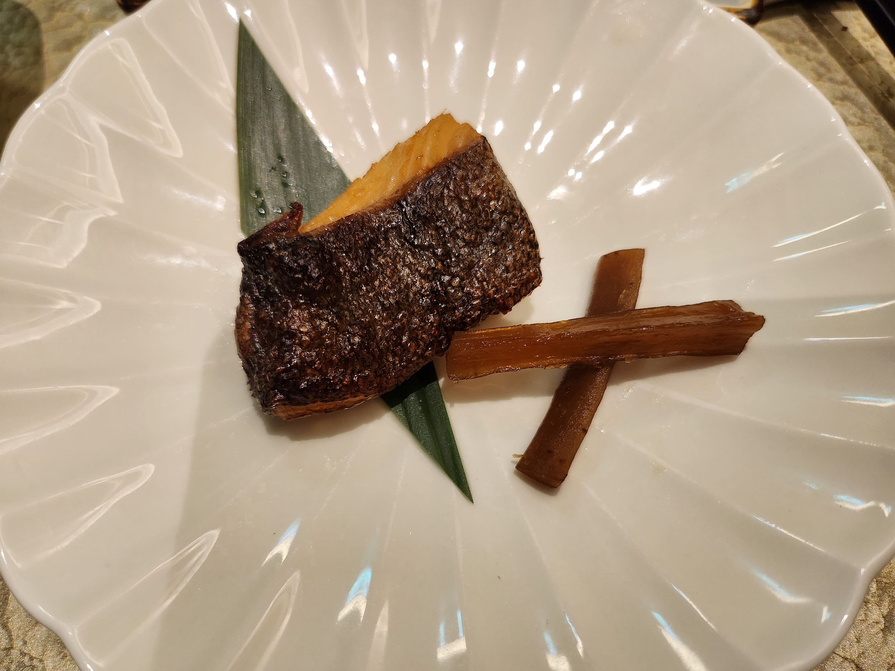 우엉과 함께 예쁘게 데코되어 나온 즉석생선구이입니다.