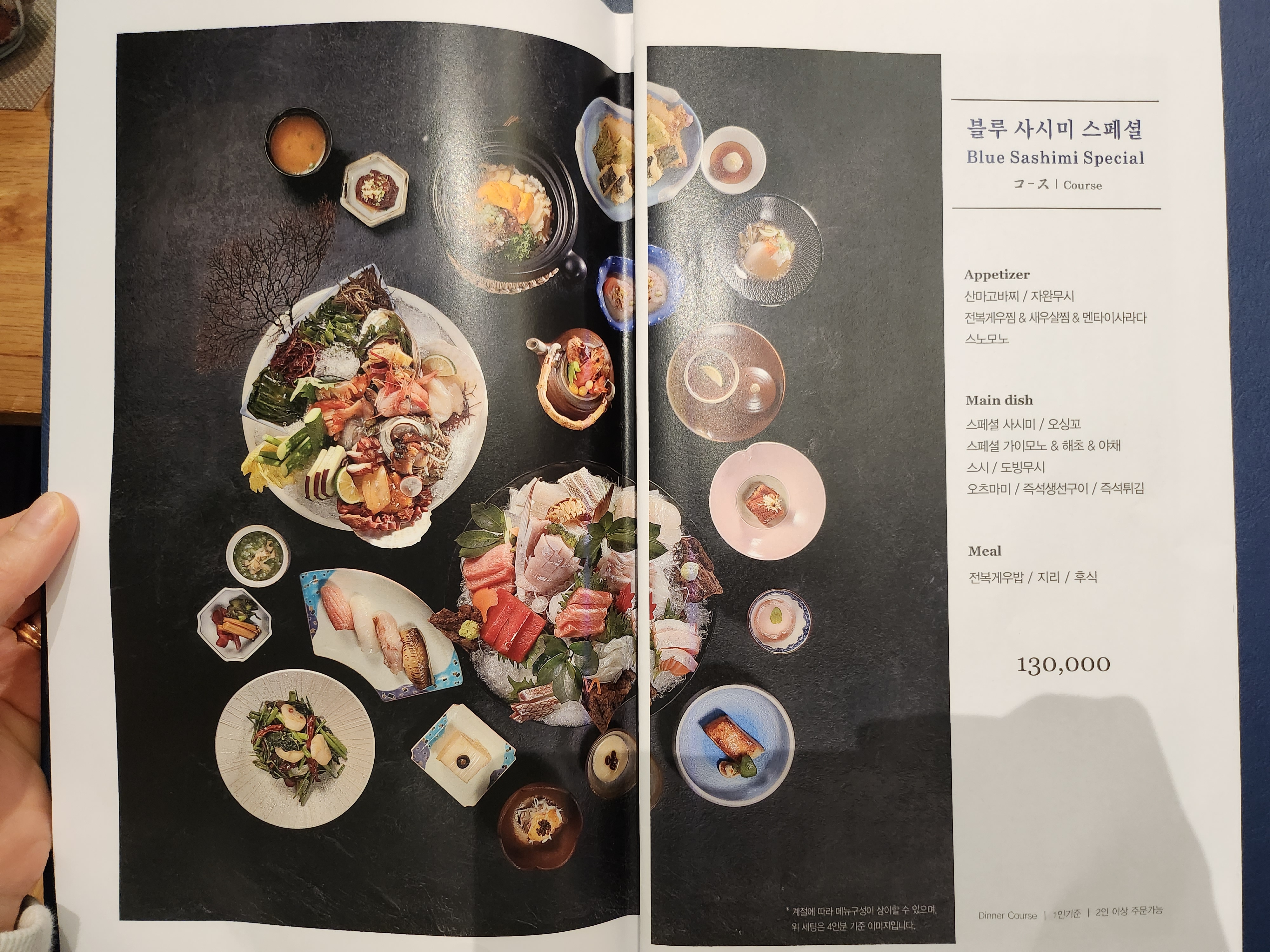청담동 가족모임 하기 좋은 룸식당 긴자 청담블루점의 메뉴판입니다.