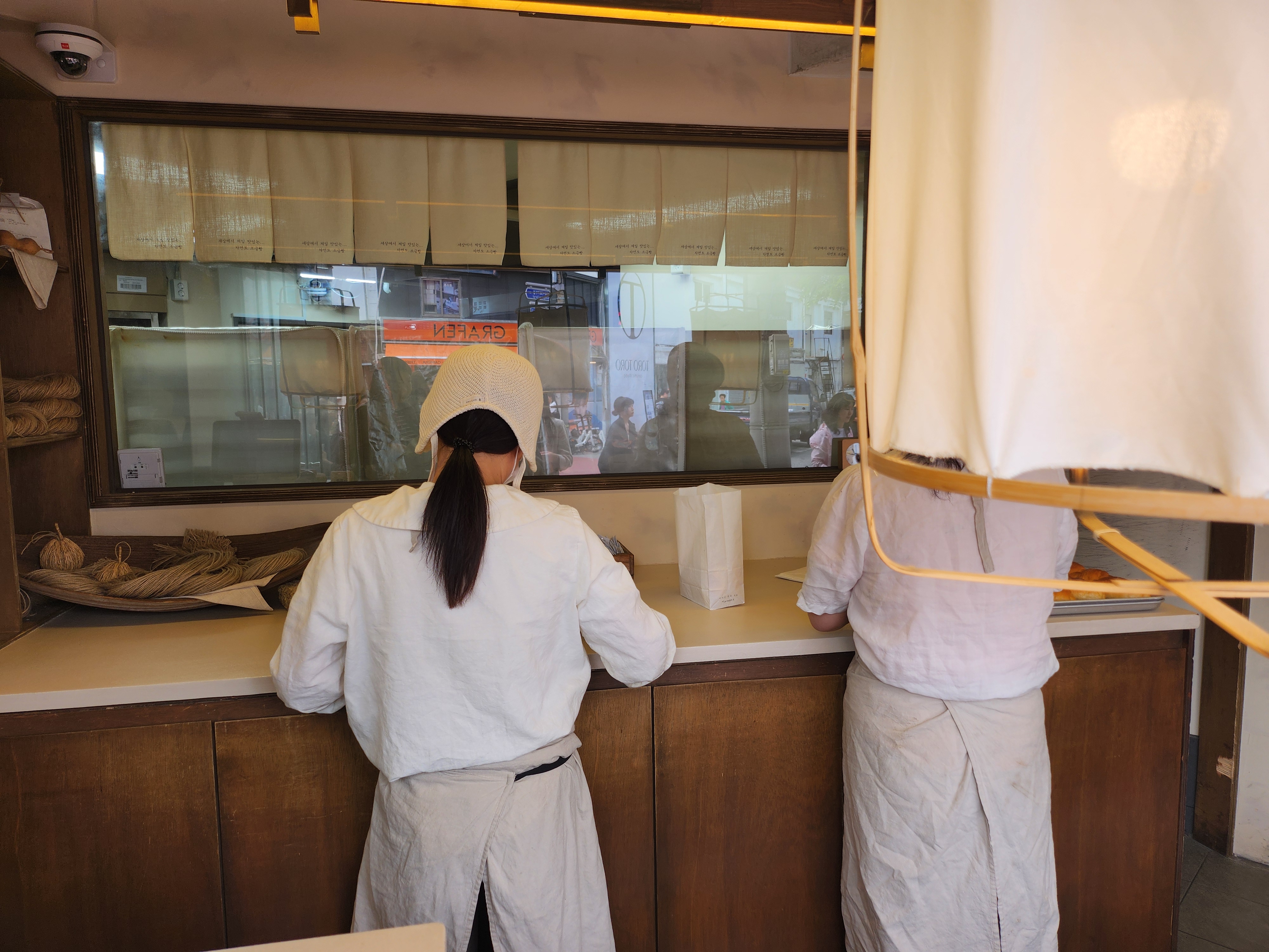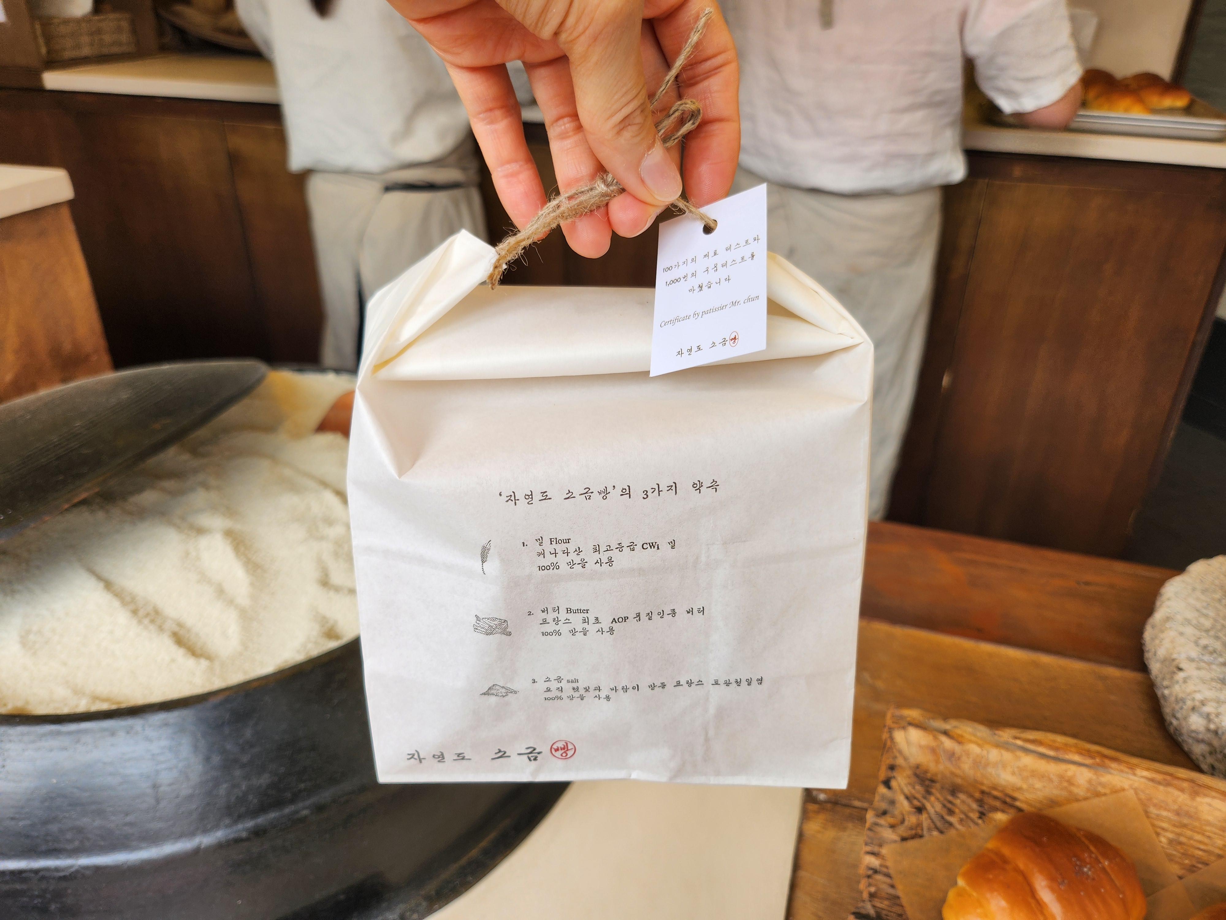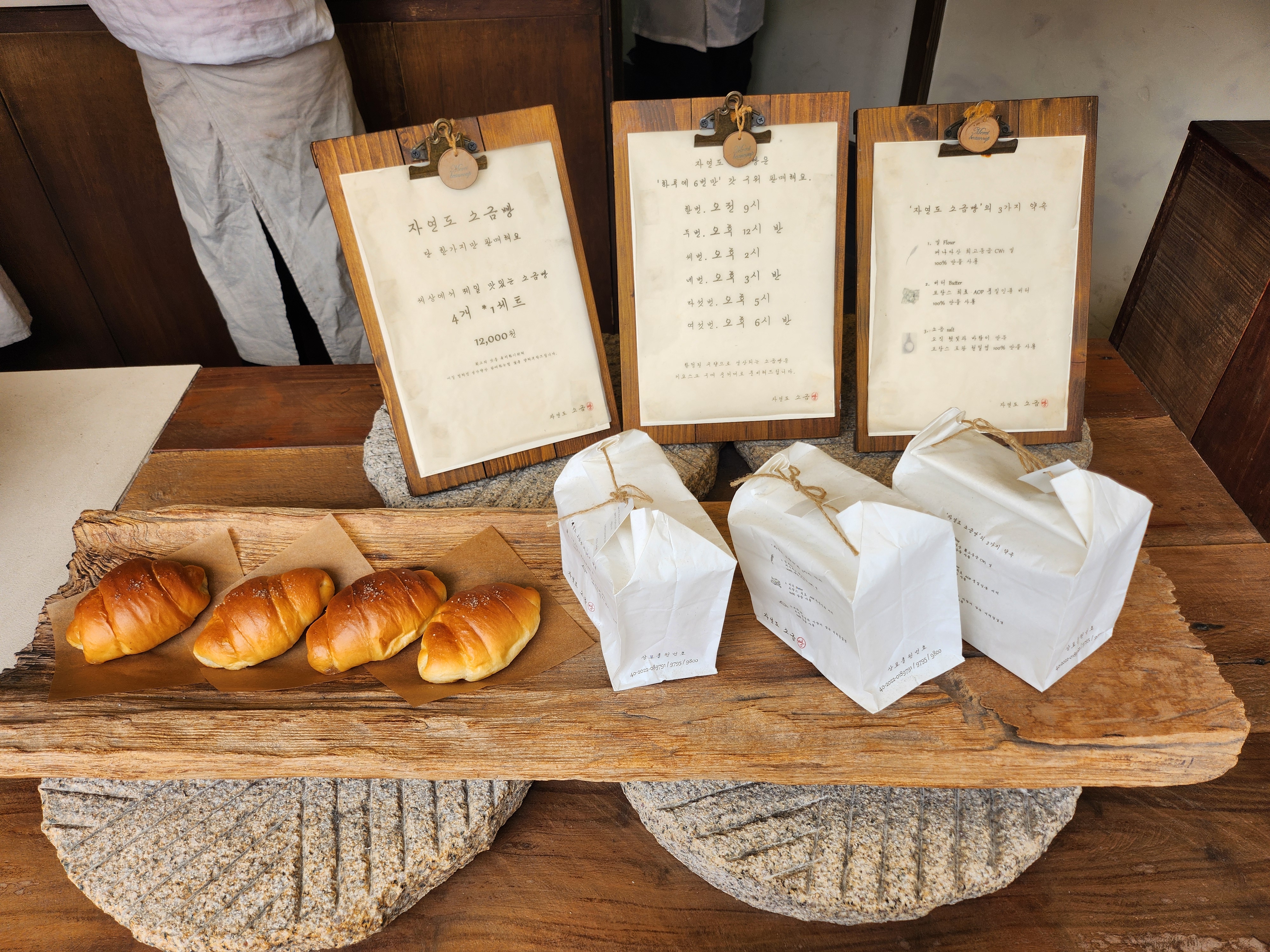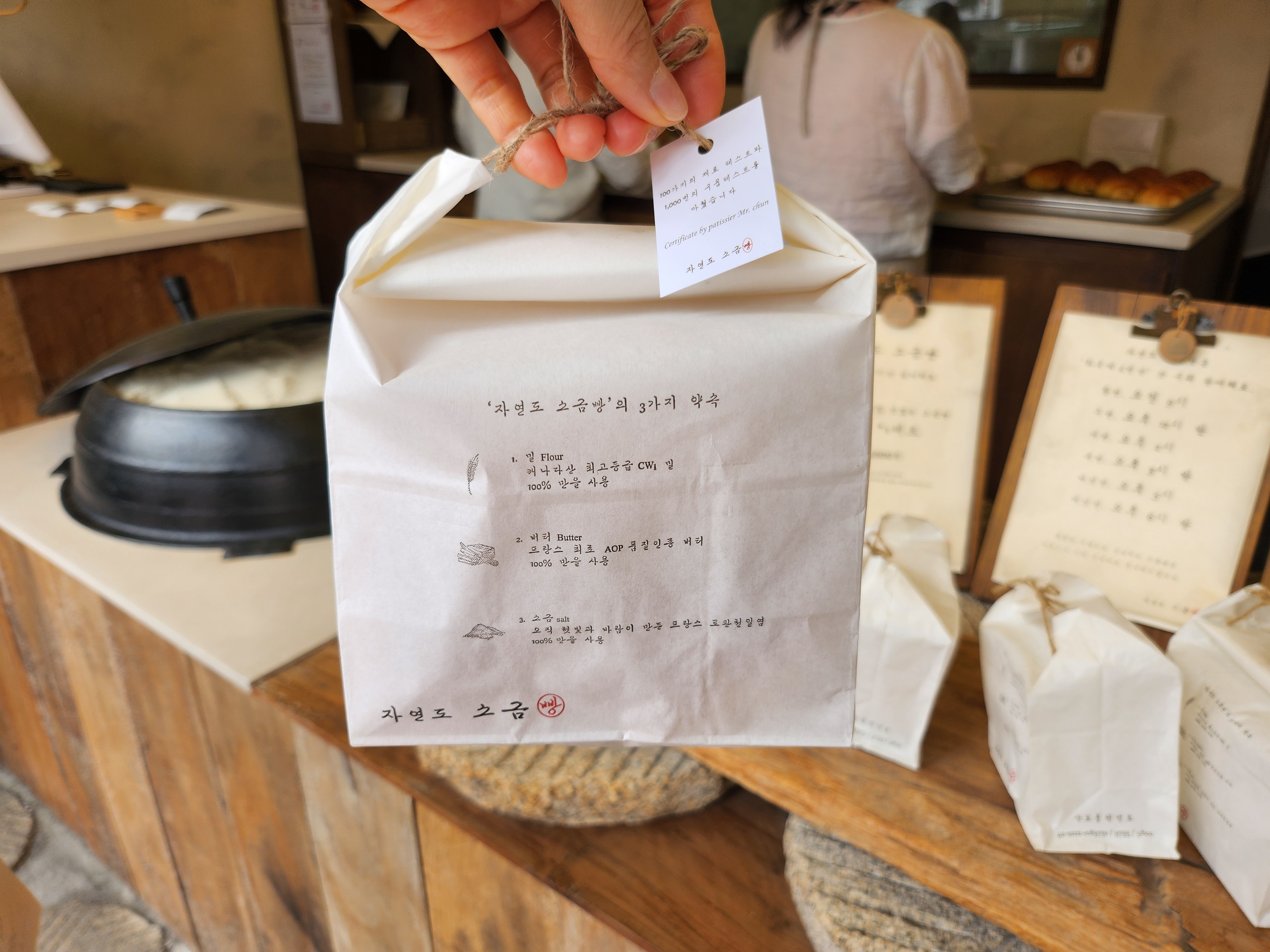 안쪽 주방에서는 끊임없이 소금빵을 구워내고 있었고 카운터에서는 빵을 예쁘게 포장해서 주십니다.