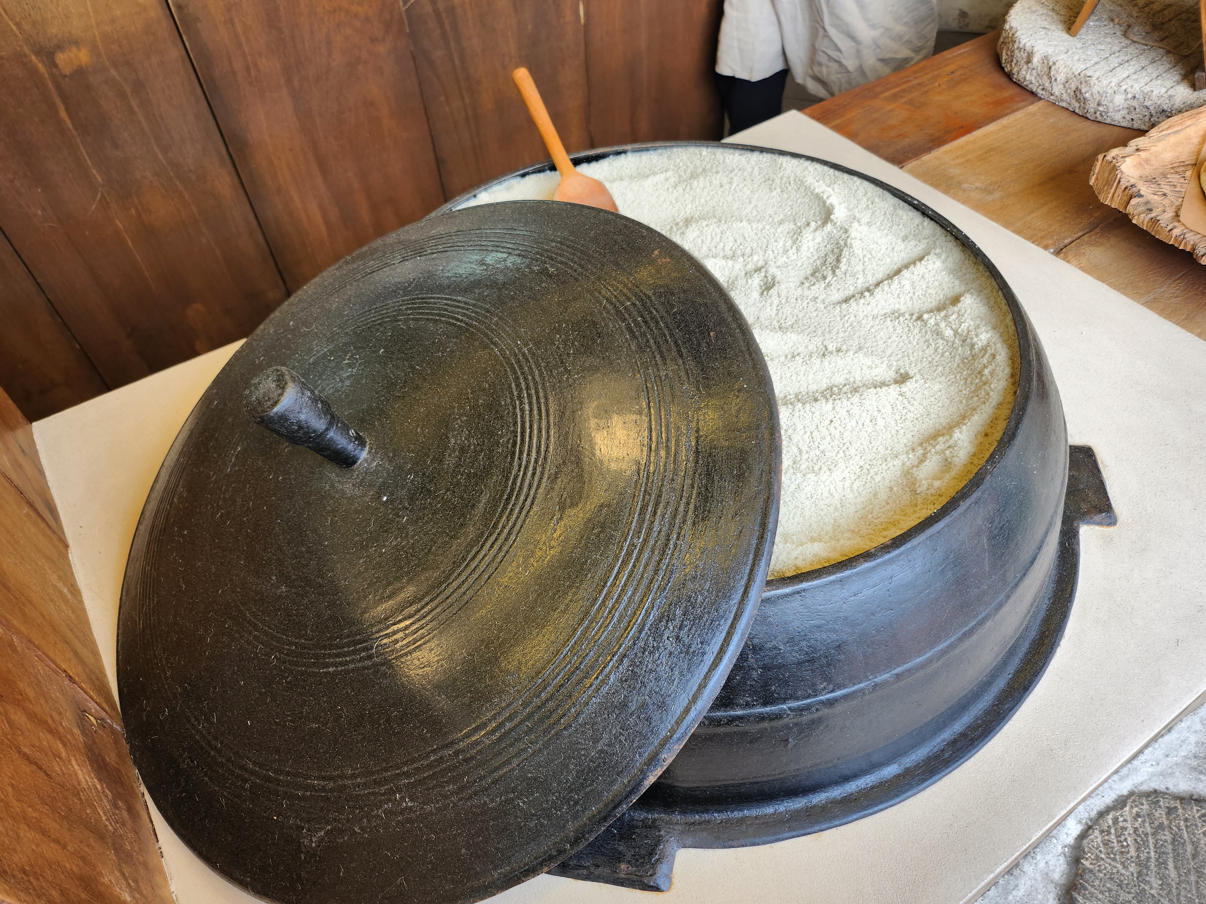 가마솥에 한가득 담긴 소금과 맷돌과 나무 트레이에 디피된 소금빵과 패키지가 서정적인 분위기를 자아냈습니다.