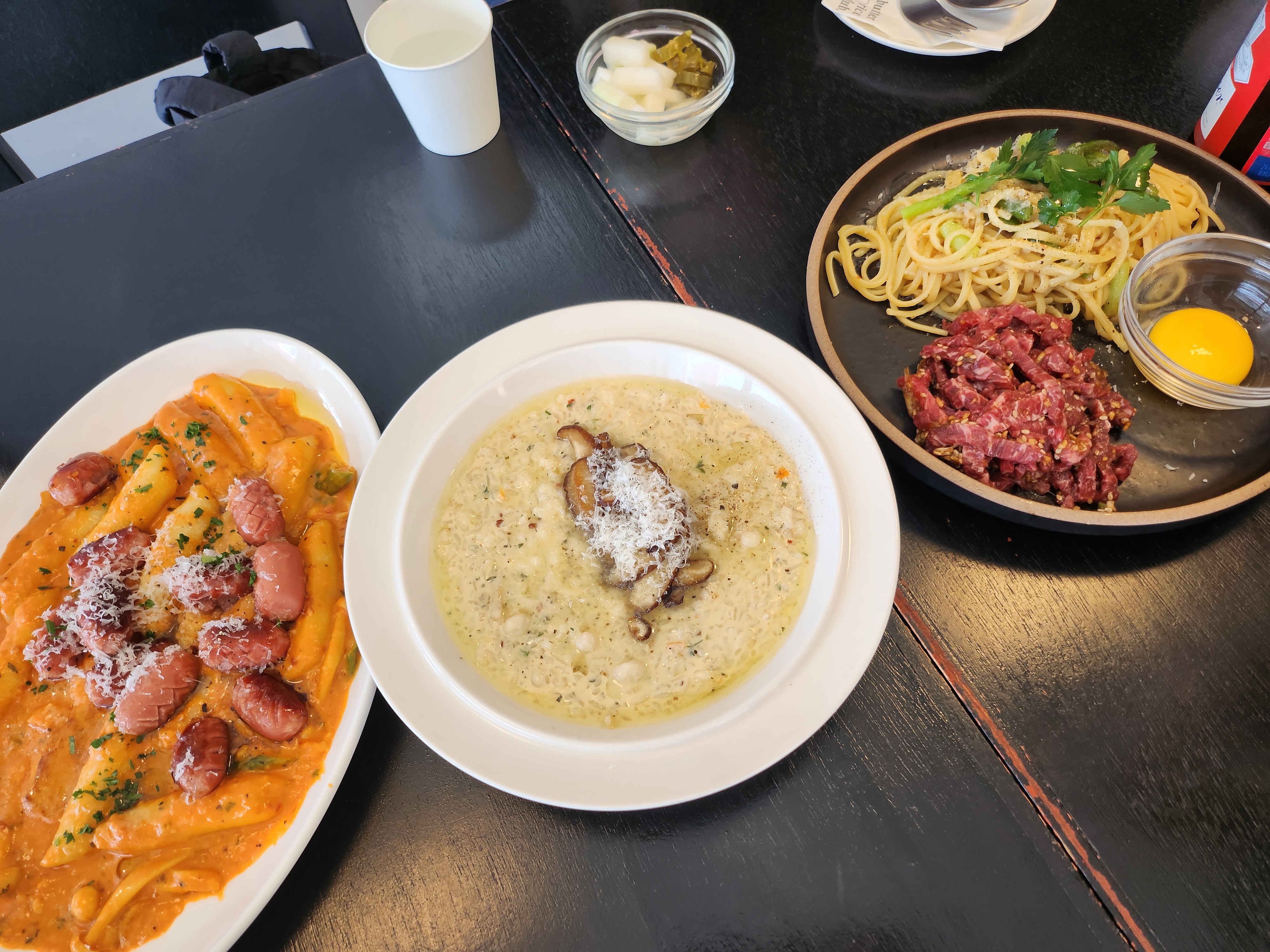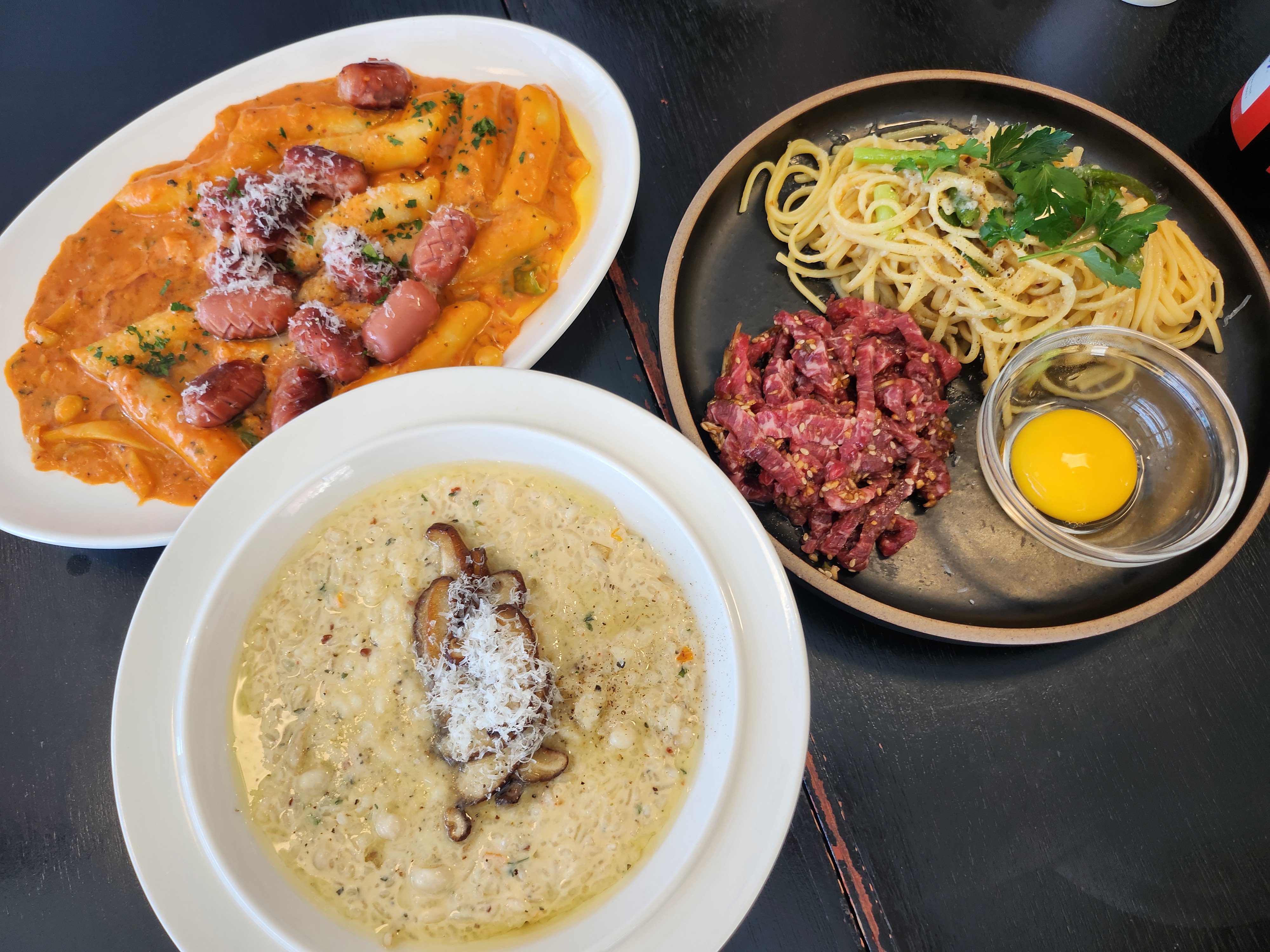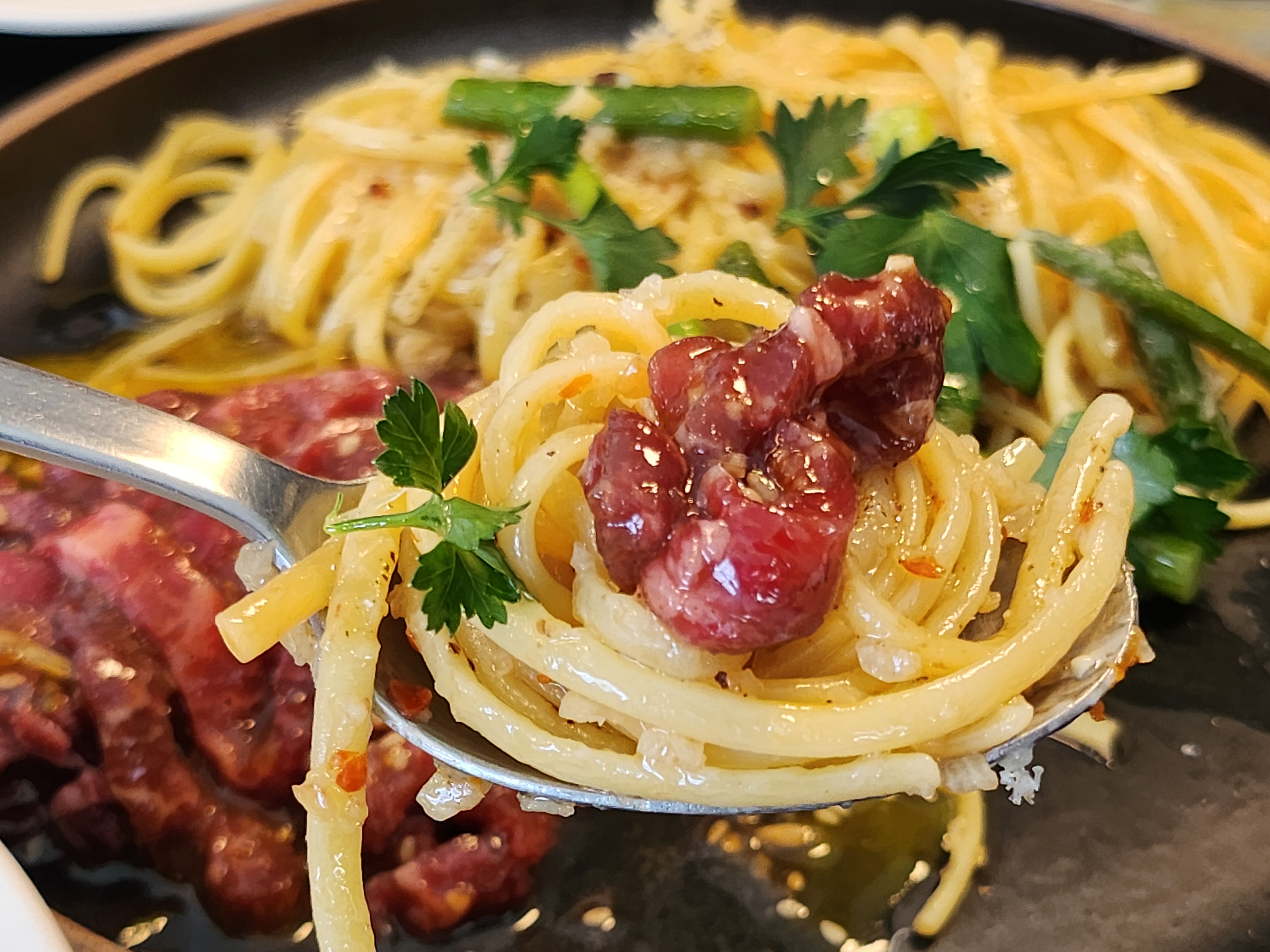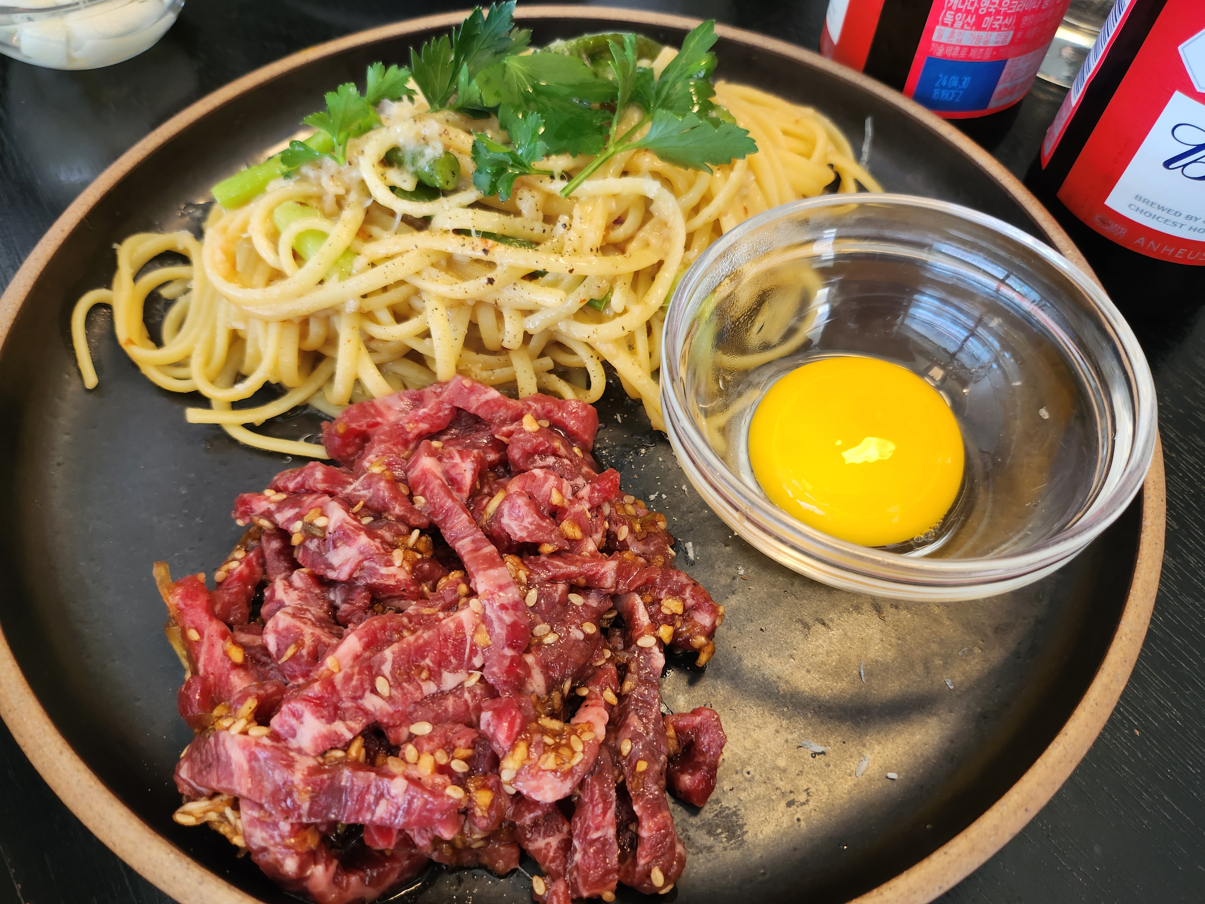 한우 육회는 육회대로 맛이 좋고, 오일 파스타와 한우육회가 잘 어울릴 수 있구나 하며 맛있게 먹었던 메뉴입니다.