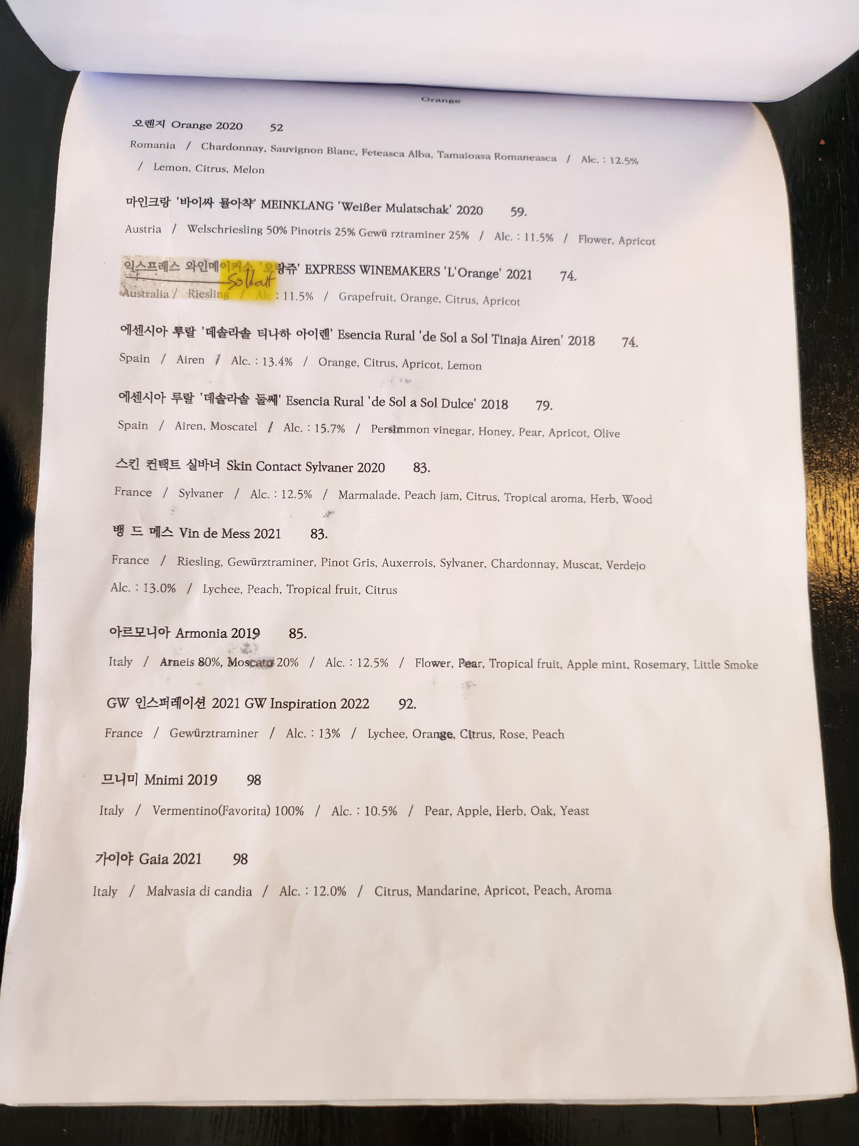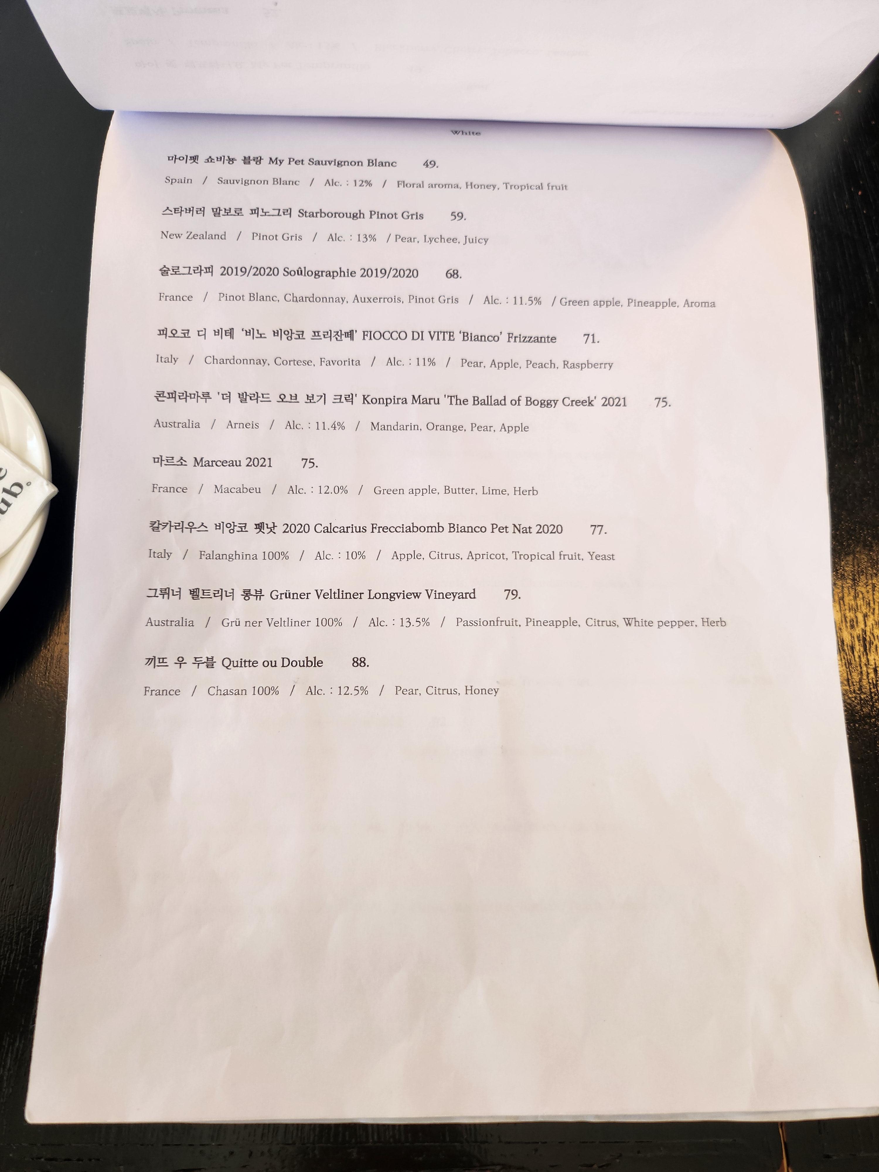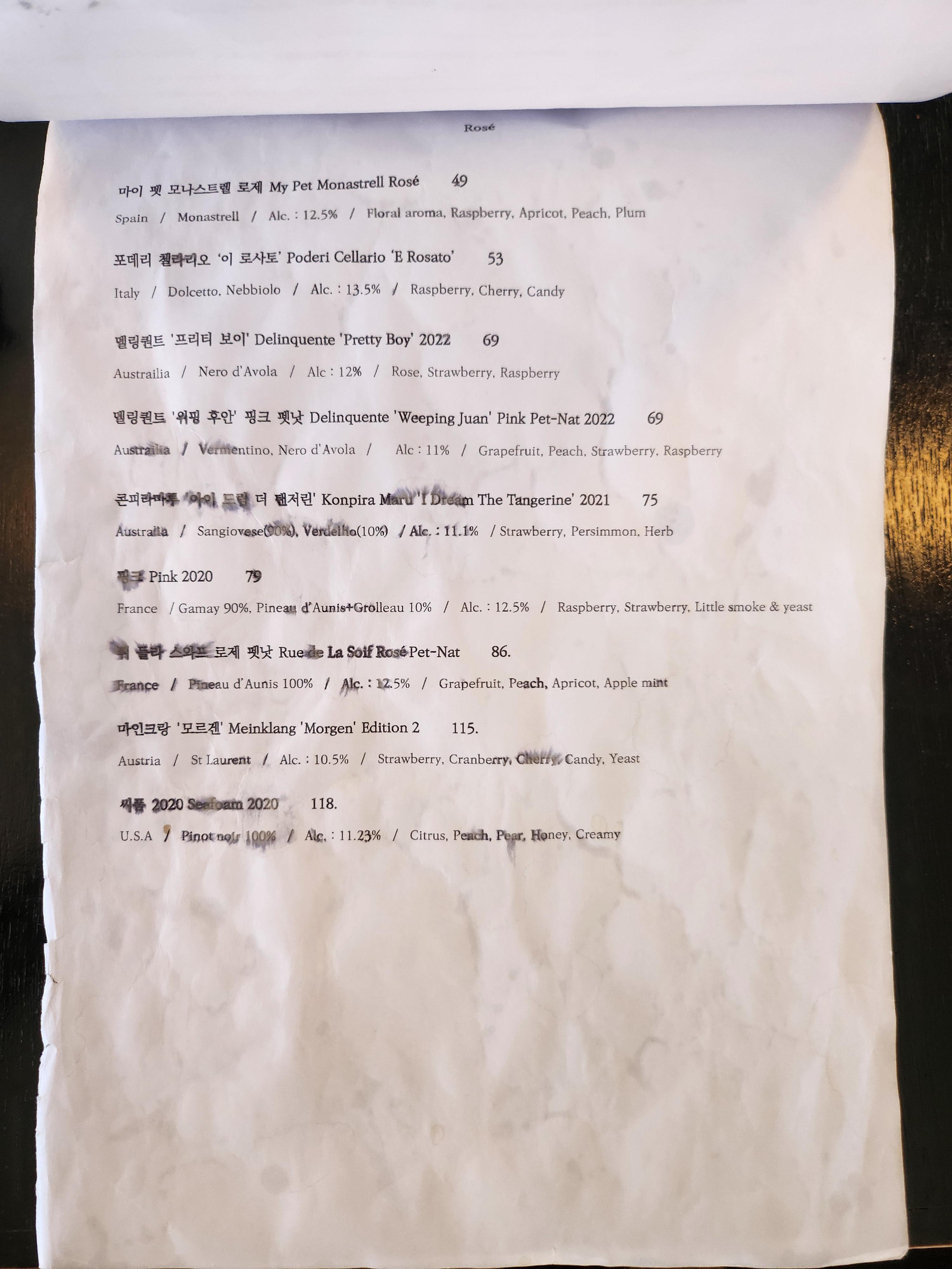 주류는 레드, 화이트, 오렌지, 로제 와인으로 이루어져 있습니다.