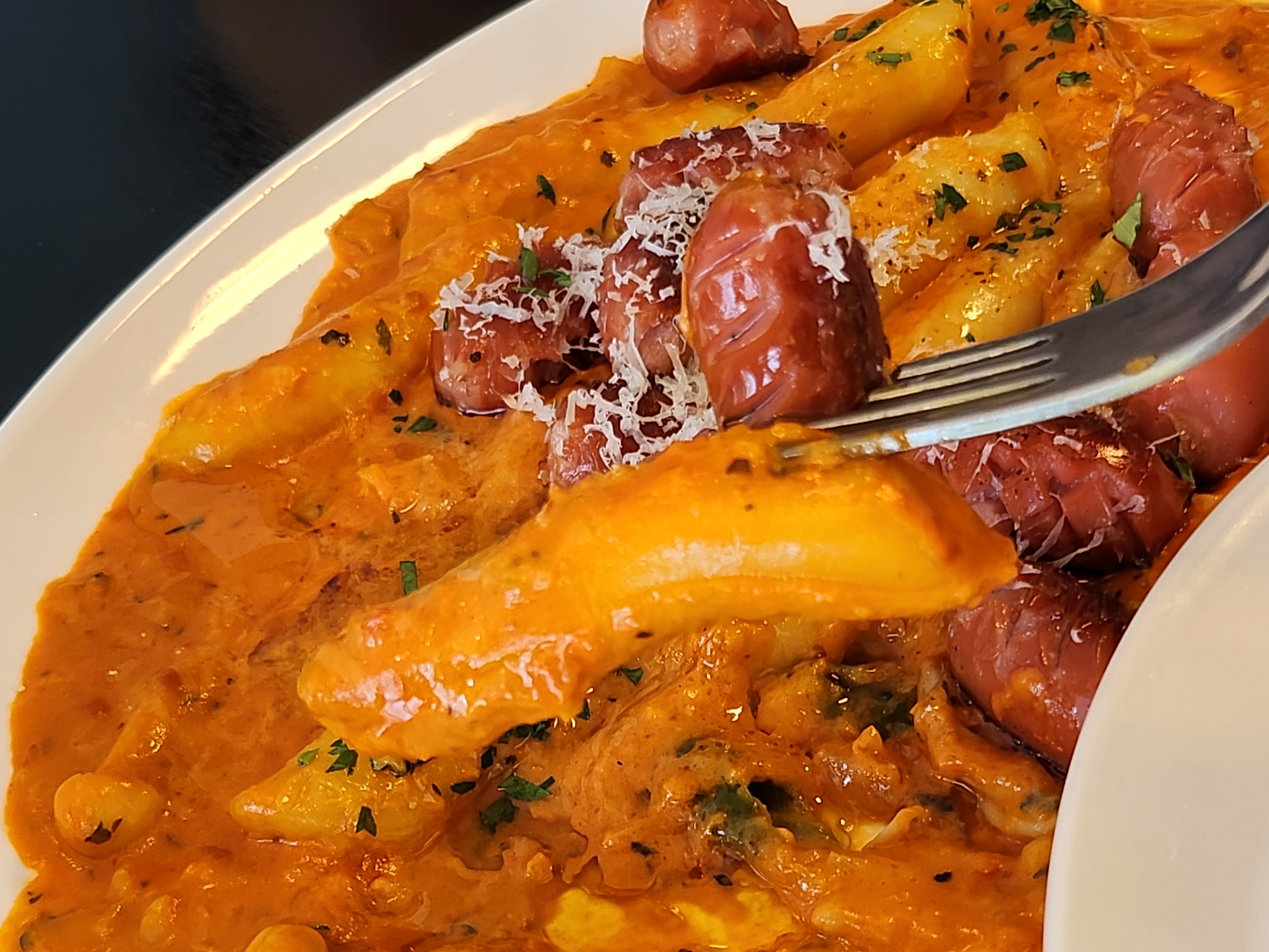 칼집을 내어 잘 구워낸 비엔나 소세지가 듬뿍 올라간 로제 떡볶이입니다.