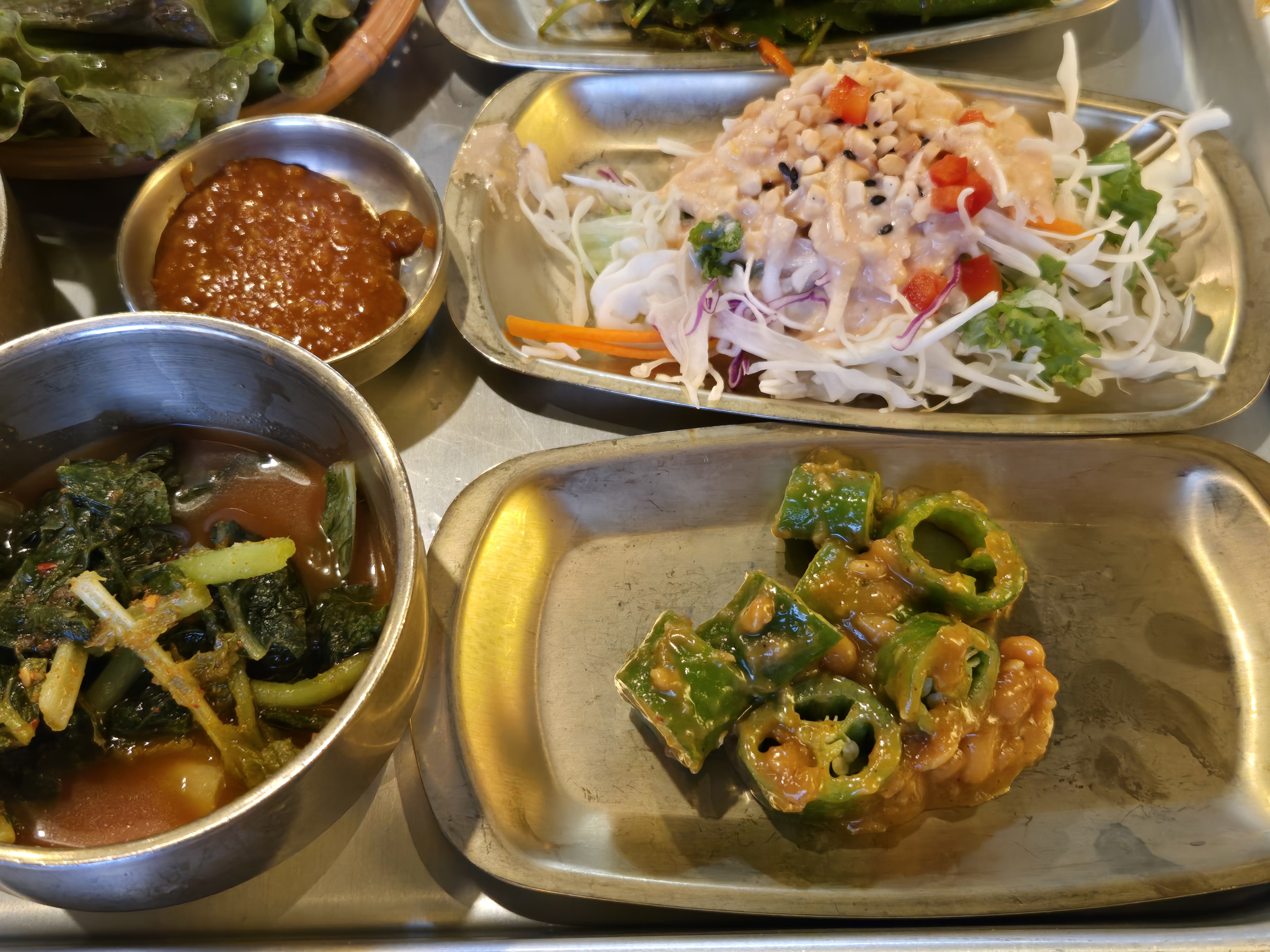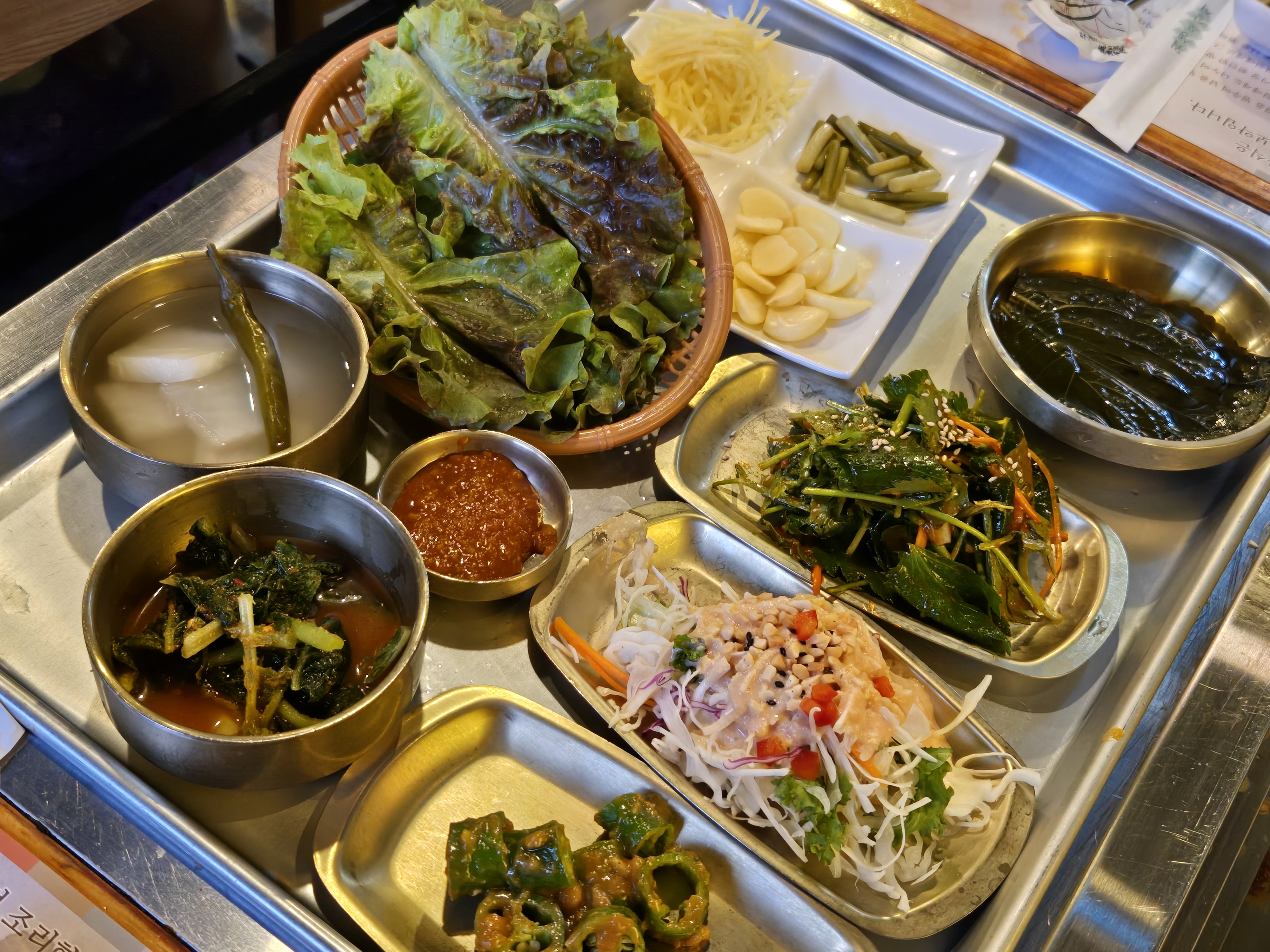 야채쌈과 쌈장, 동치미, 나물무침, 깻잎장아찌, 생강과 마늘 등이었습니다.