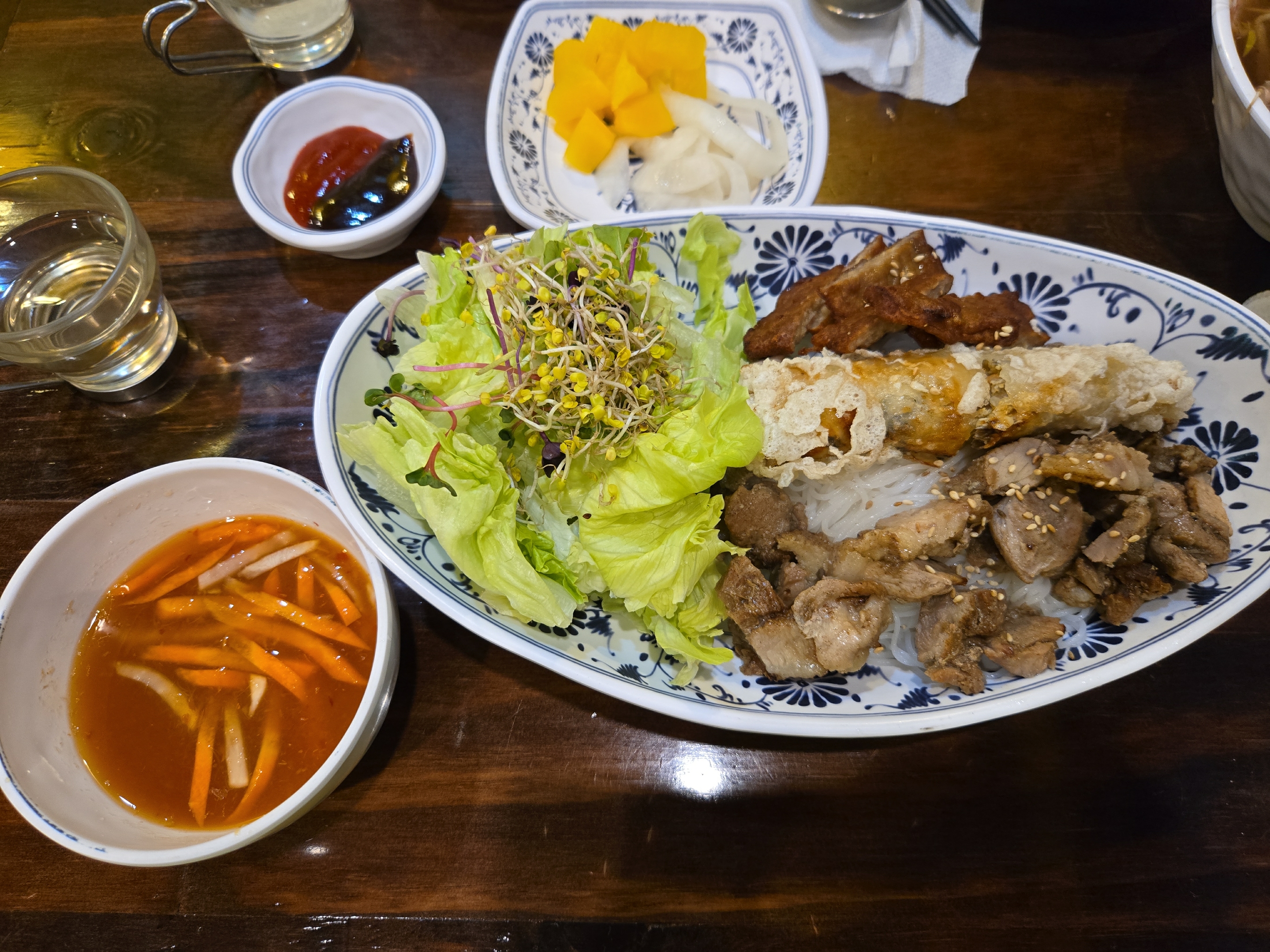 신선한 야채도 듬뿍 나오고 고기와 짜조가 가득 올라가 있습니다.