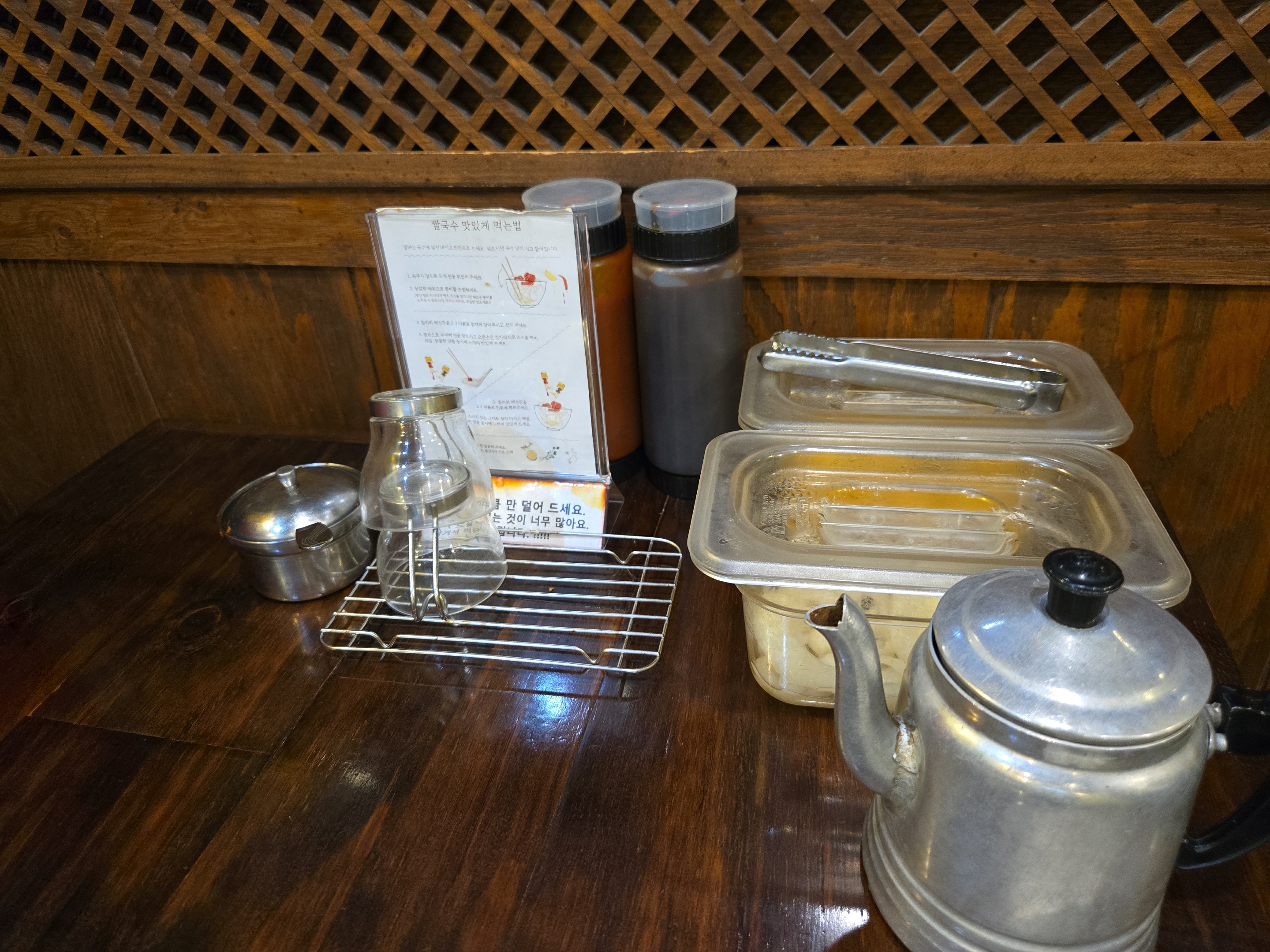 행당역 맛집 하노이 별 테이블에는 차와 컵, 단무지와 양파절임 그리고 쌀국수용 소스 2가지가 있습니다.