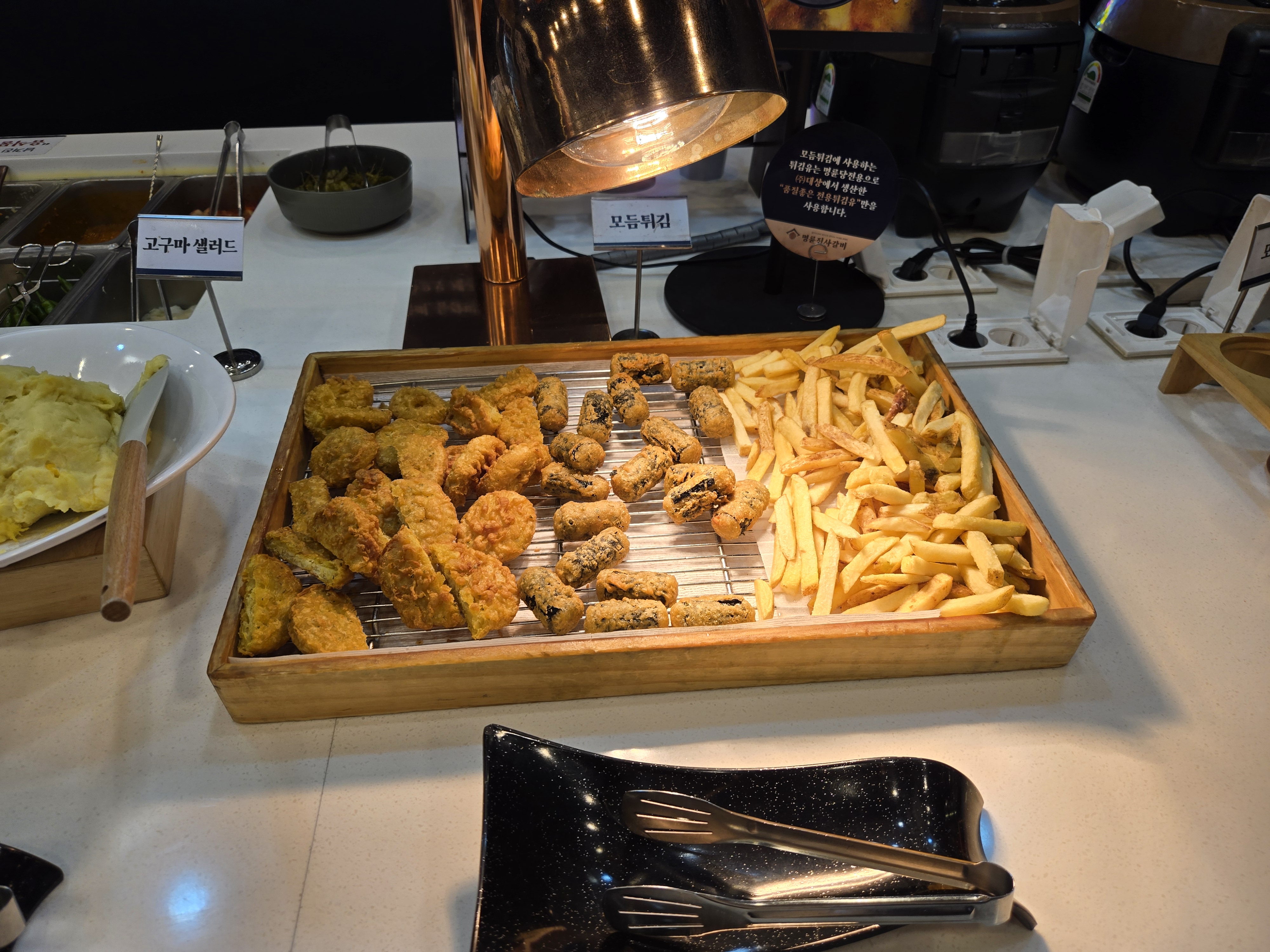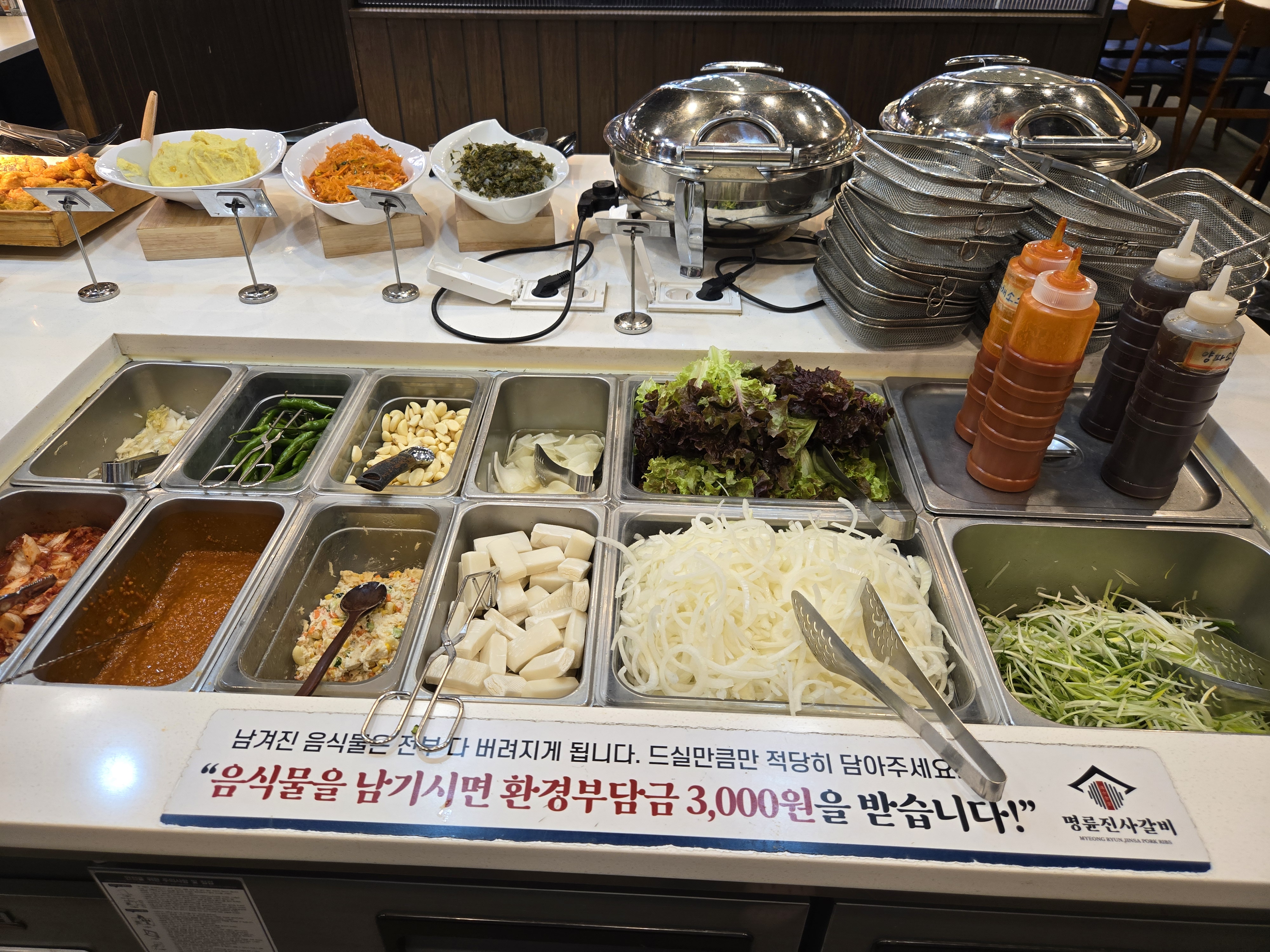 다양한 종류의 고기 외에도 무한리필 셀프바에는 떡볶이, 잡채, 청포묵무침, 비빔 천사채 샐러드, 고구마 샐러드,