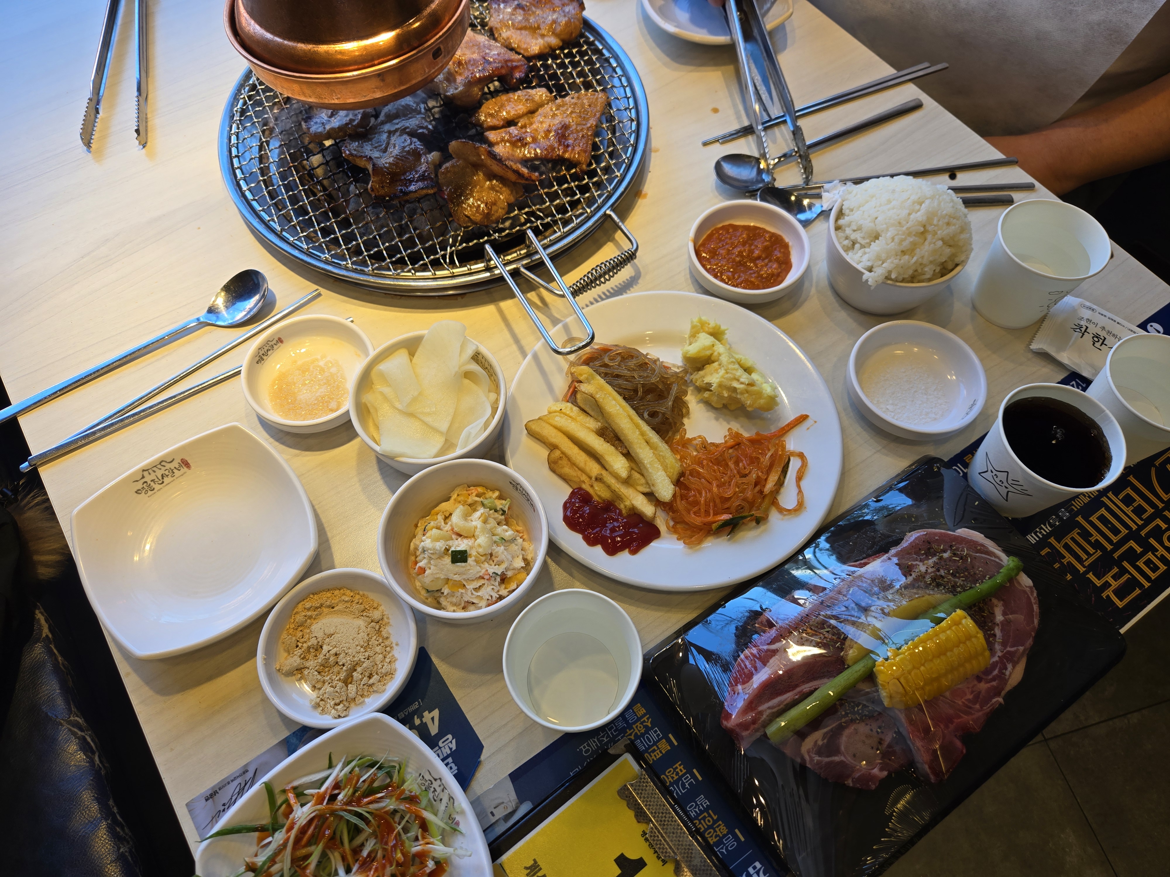 다양한 종류의 고기 외에도 무한리필 셀프바에는 떡볶이, 잡채, 청포묵무침, 비빔 천사채 샐러드, 고구마 샐러드,