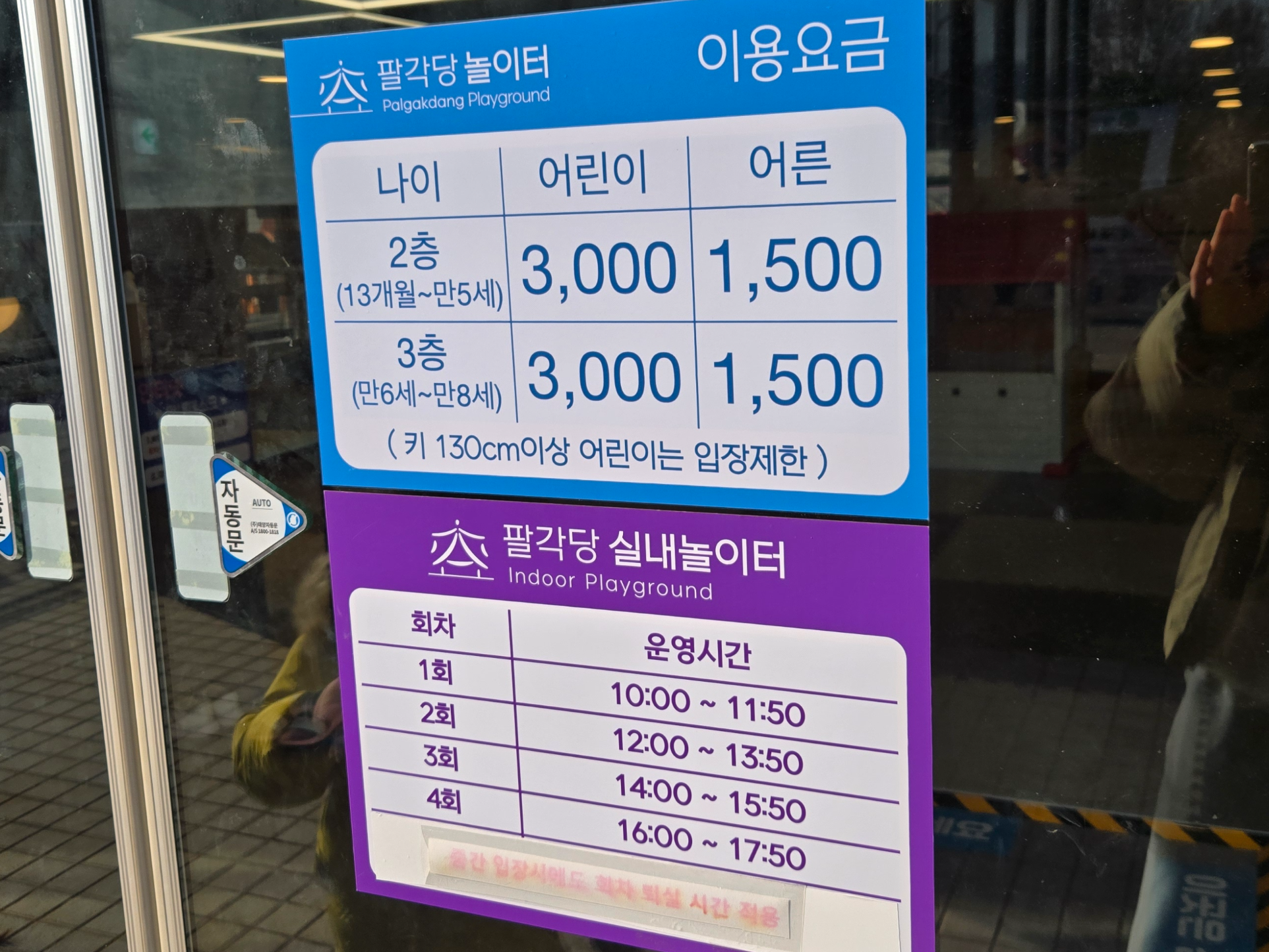 서울 저렴한 팔각당 실내놀이터의 이용요금은 2시간 기준으로 어린이 3,000원 어른 1,500원이었습니다!