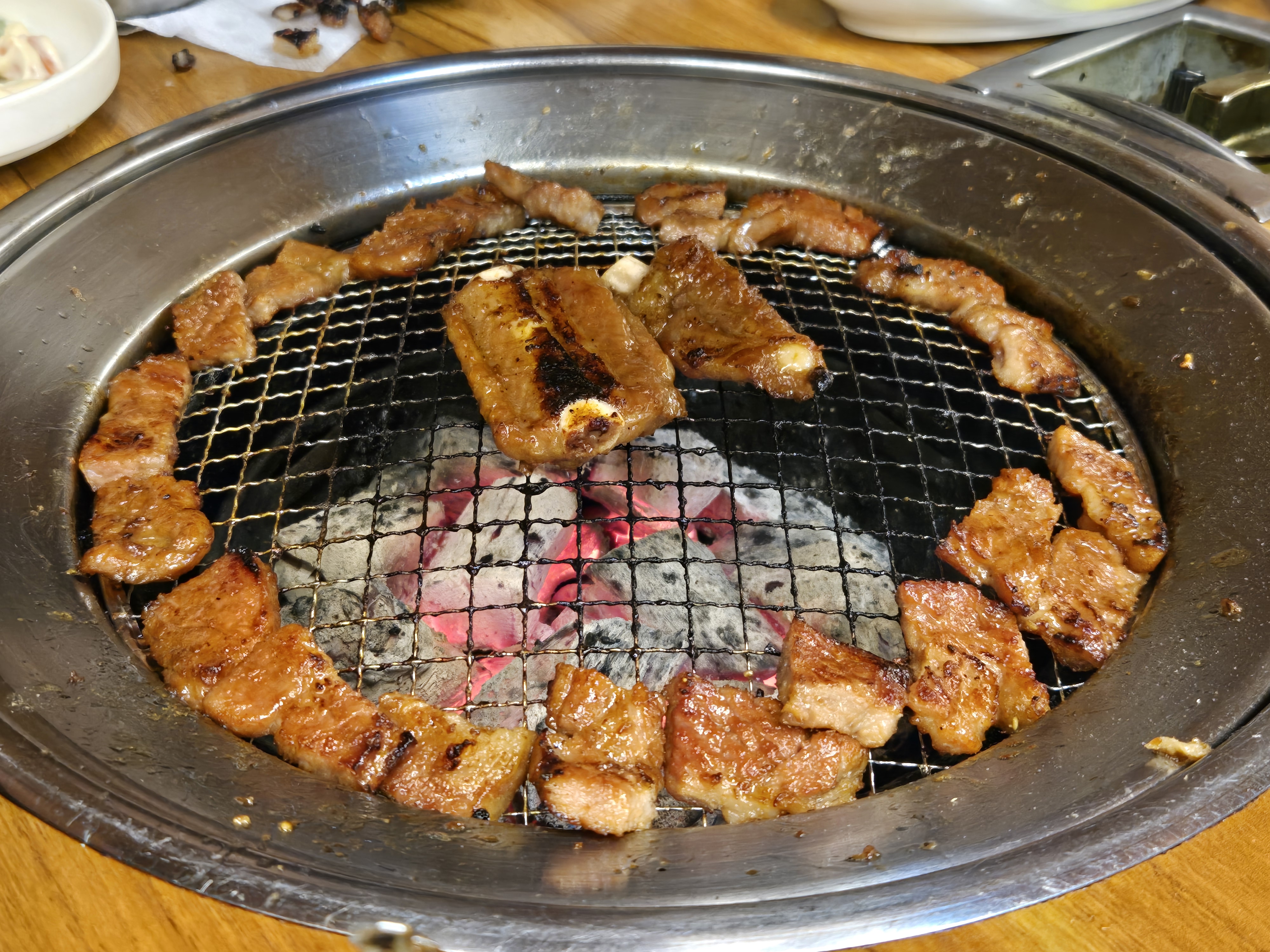 태릉맥갈비 직원분이 판이 타기 전에 금방 갈아주셔서, 자칫하면 잘 타는 양념갈비를 안 태우고 잘 구울 수 있었네요.