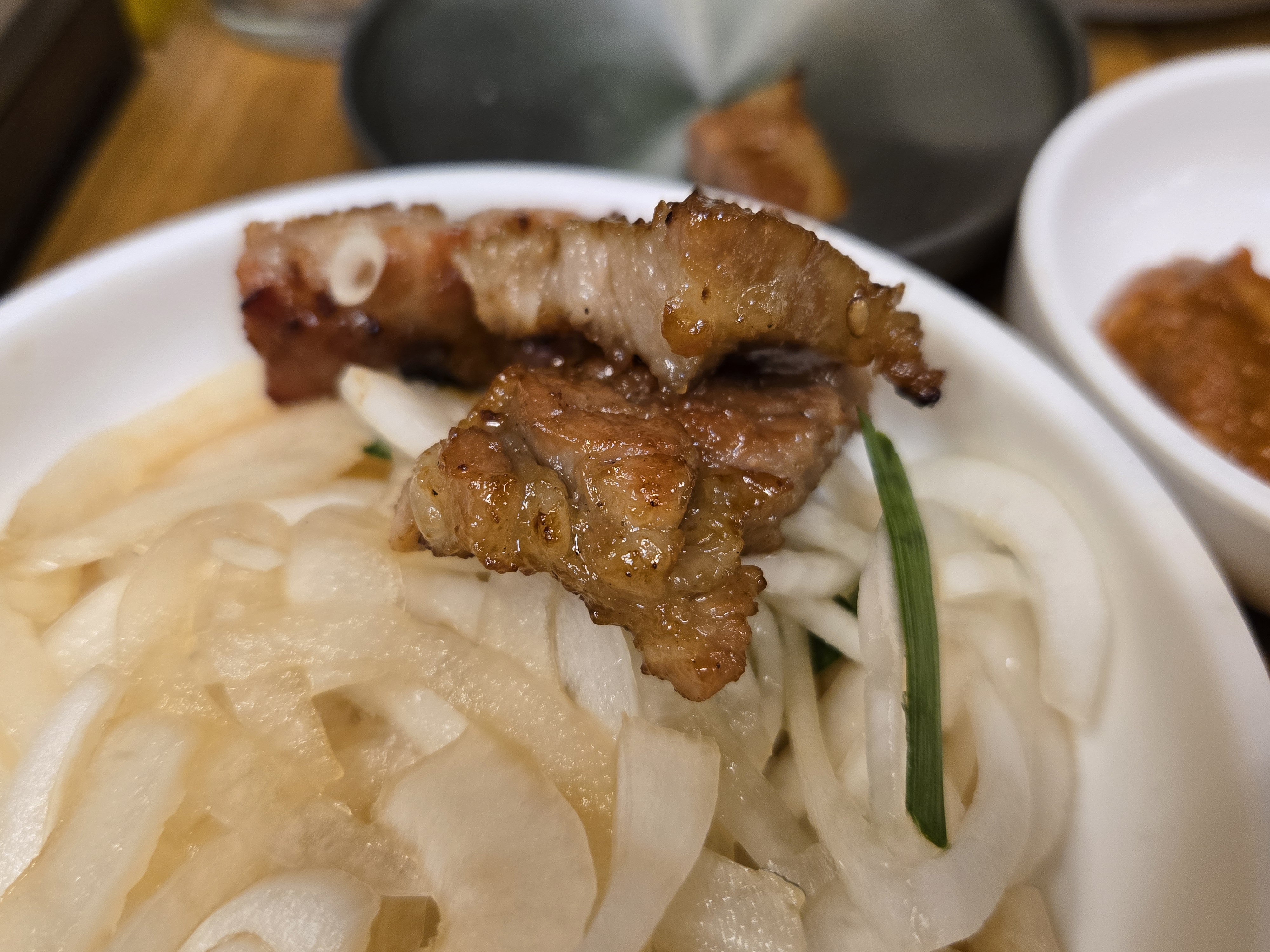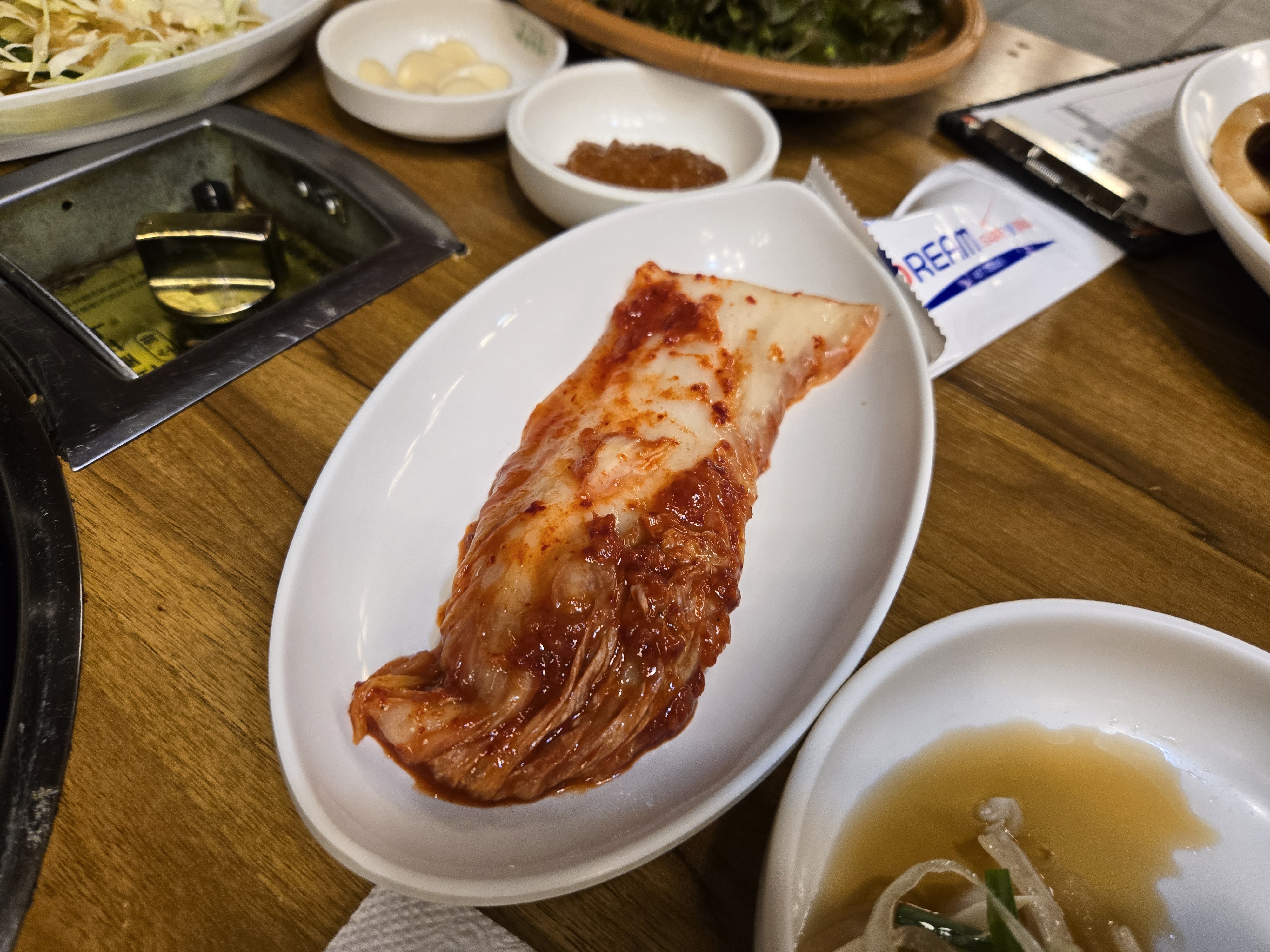 고기집에서 빠질 수 없는 양파절이와 배추김치까지 있습니다.