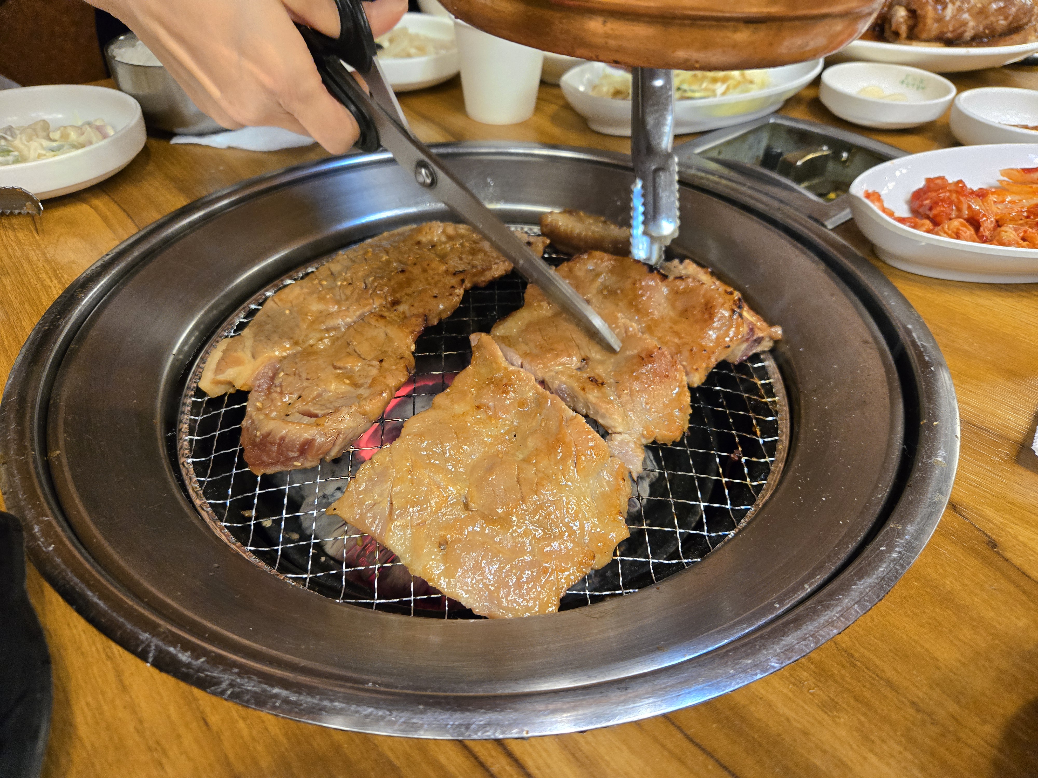 태릉맥갈비 직원분이 판이 타기 전에 금방 갈아주셔서, 자칫하면 잘 타는 양념갈비를 안 태우고 잘 구울 수 있었네요.
