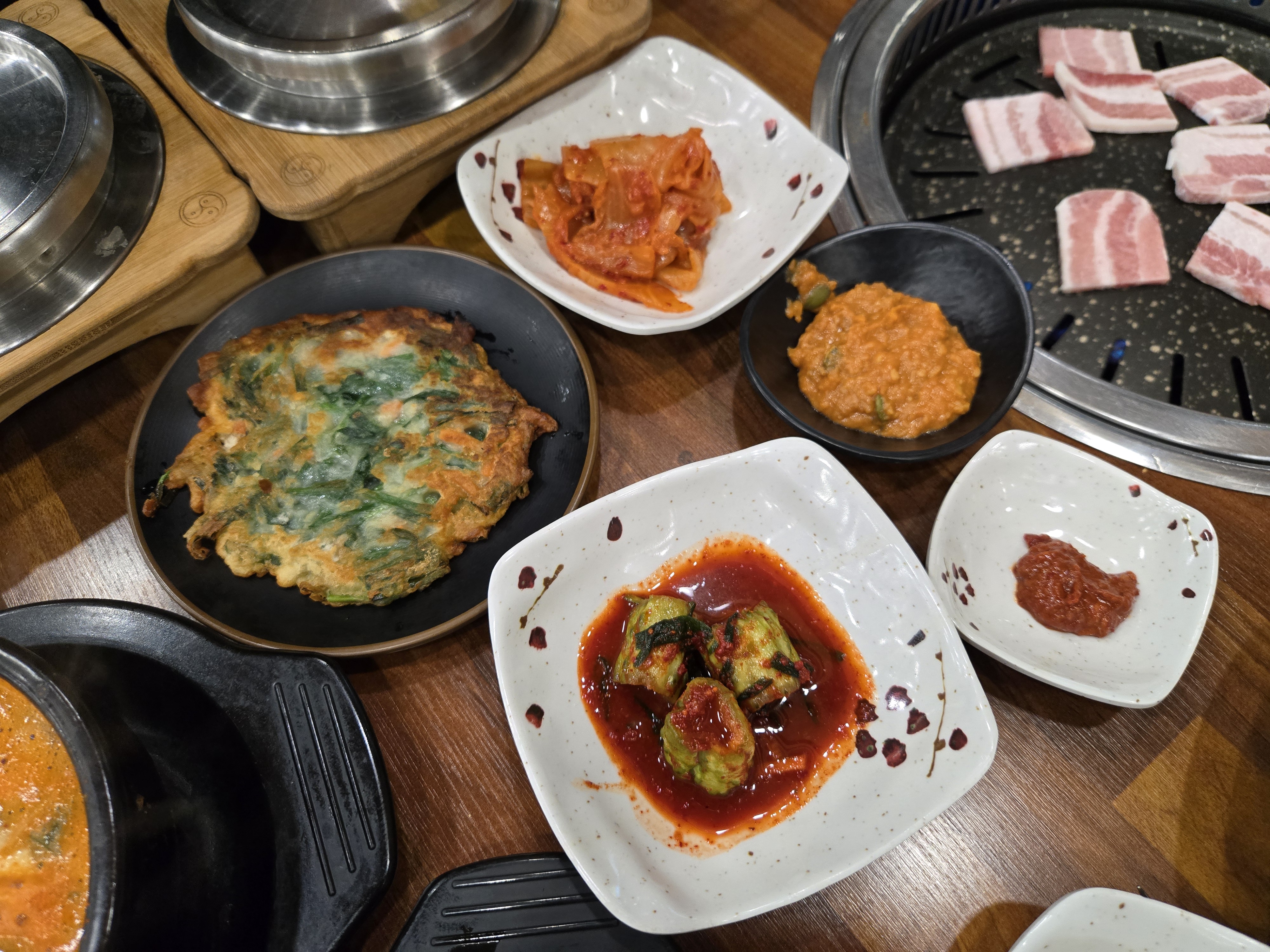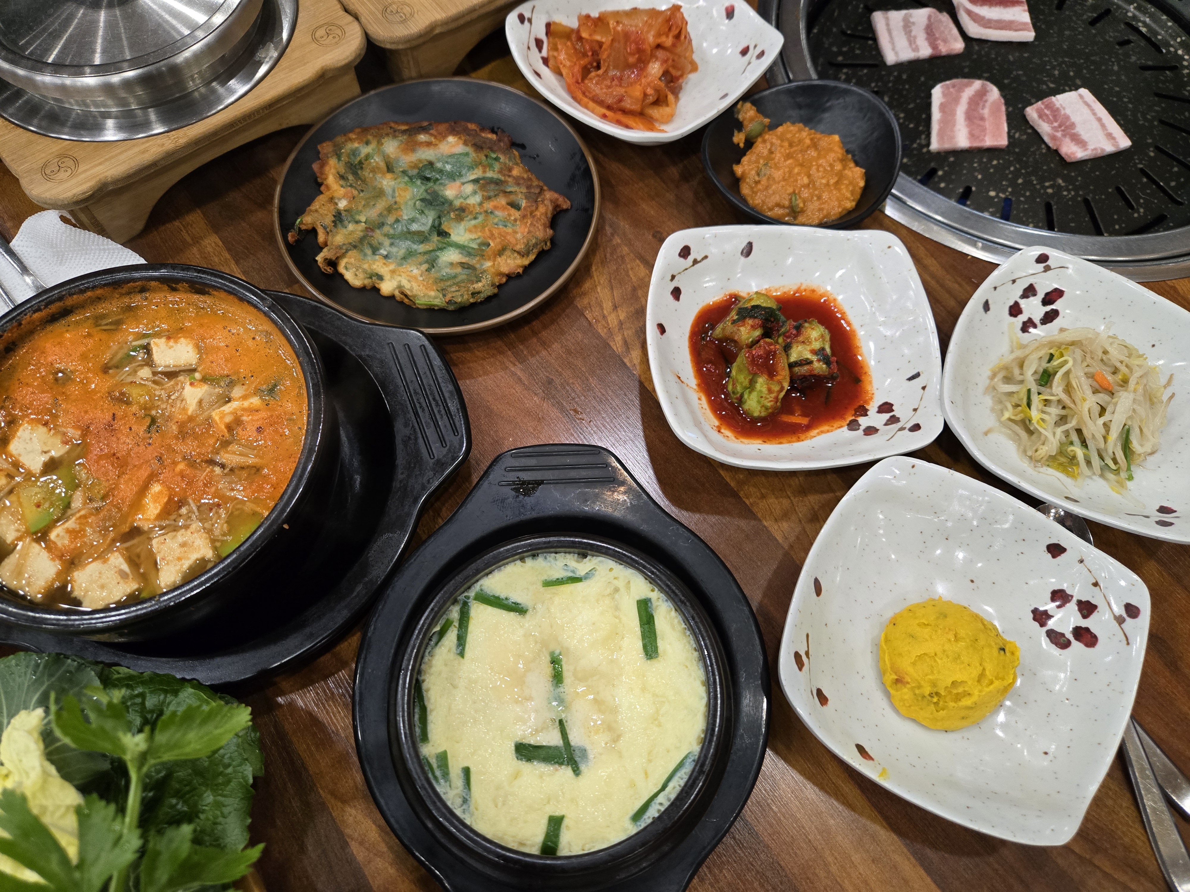 된장찌개와 계란찜, 전과 오이김치, 단호박샐러드, 볶음김치, 쌈장, 숙주나물, 나물, 젓갈, 고추장아찌,