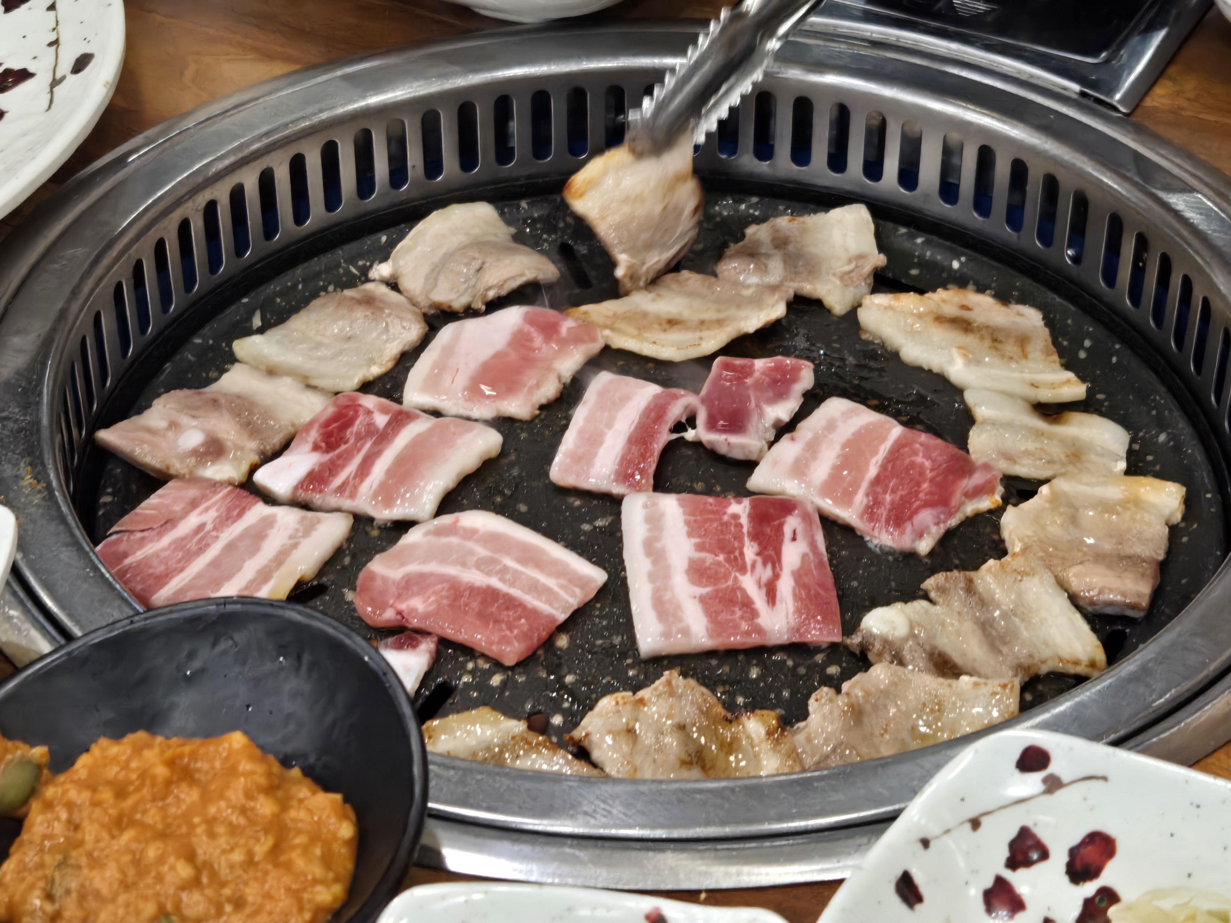 냉동삼겹한정식의 삼겹살은 불판에 구워서 먹었는데요~