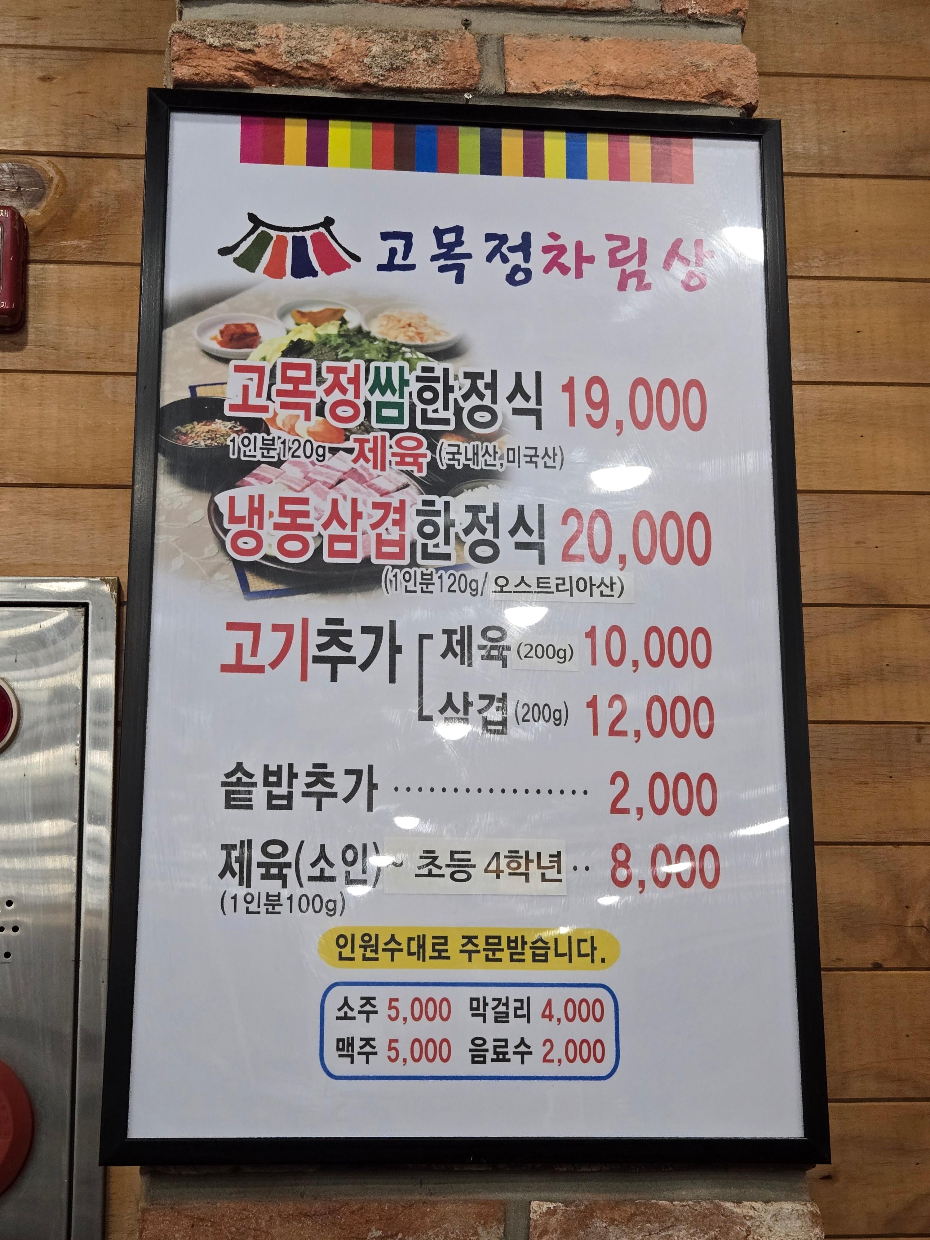 인천 을왕리 한식집 고목정쌈밥집의 메뉴판입니다.