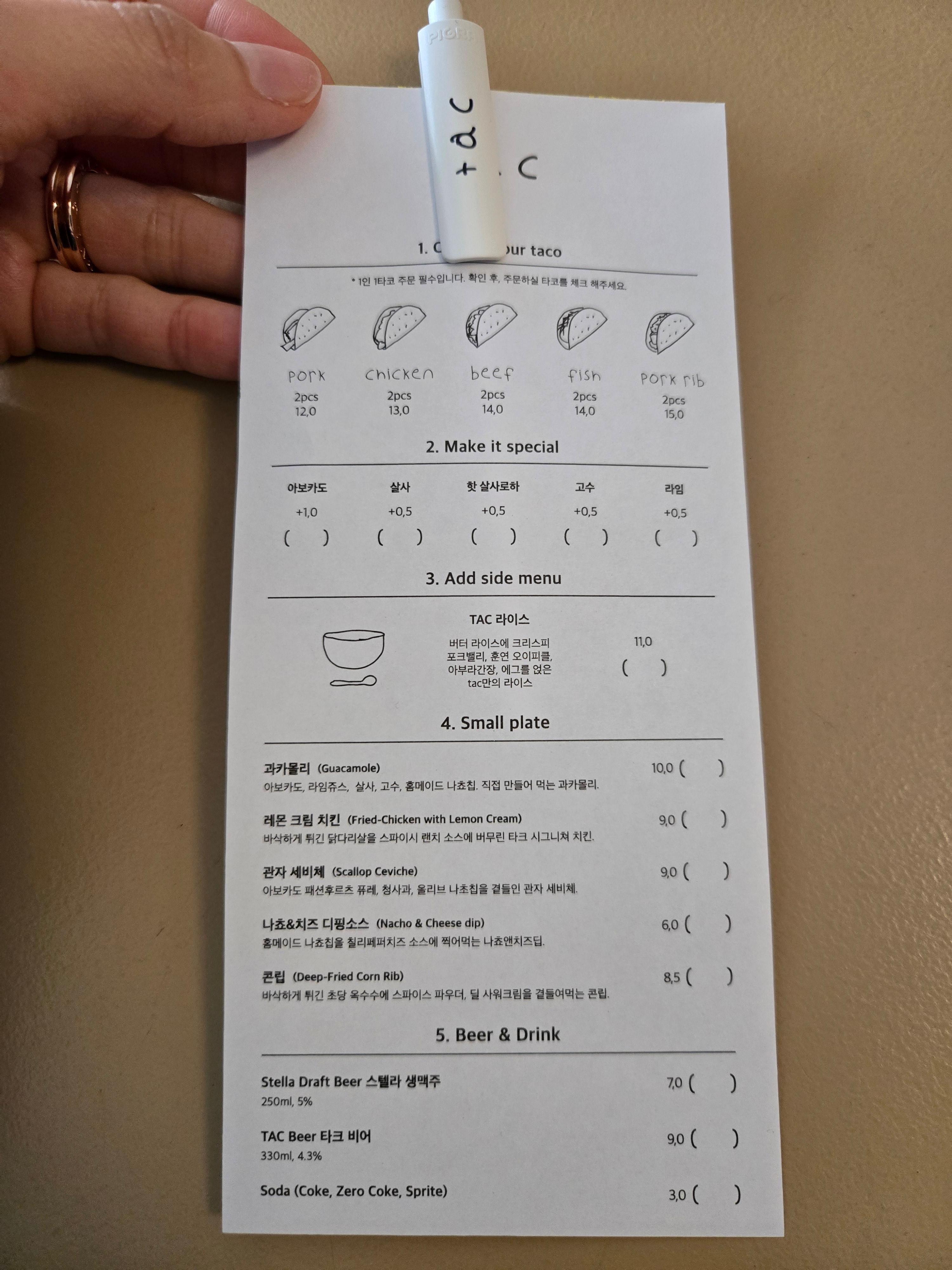 한남동 타코 맛집 타크의 메뉴판이자 주문서인데요~