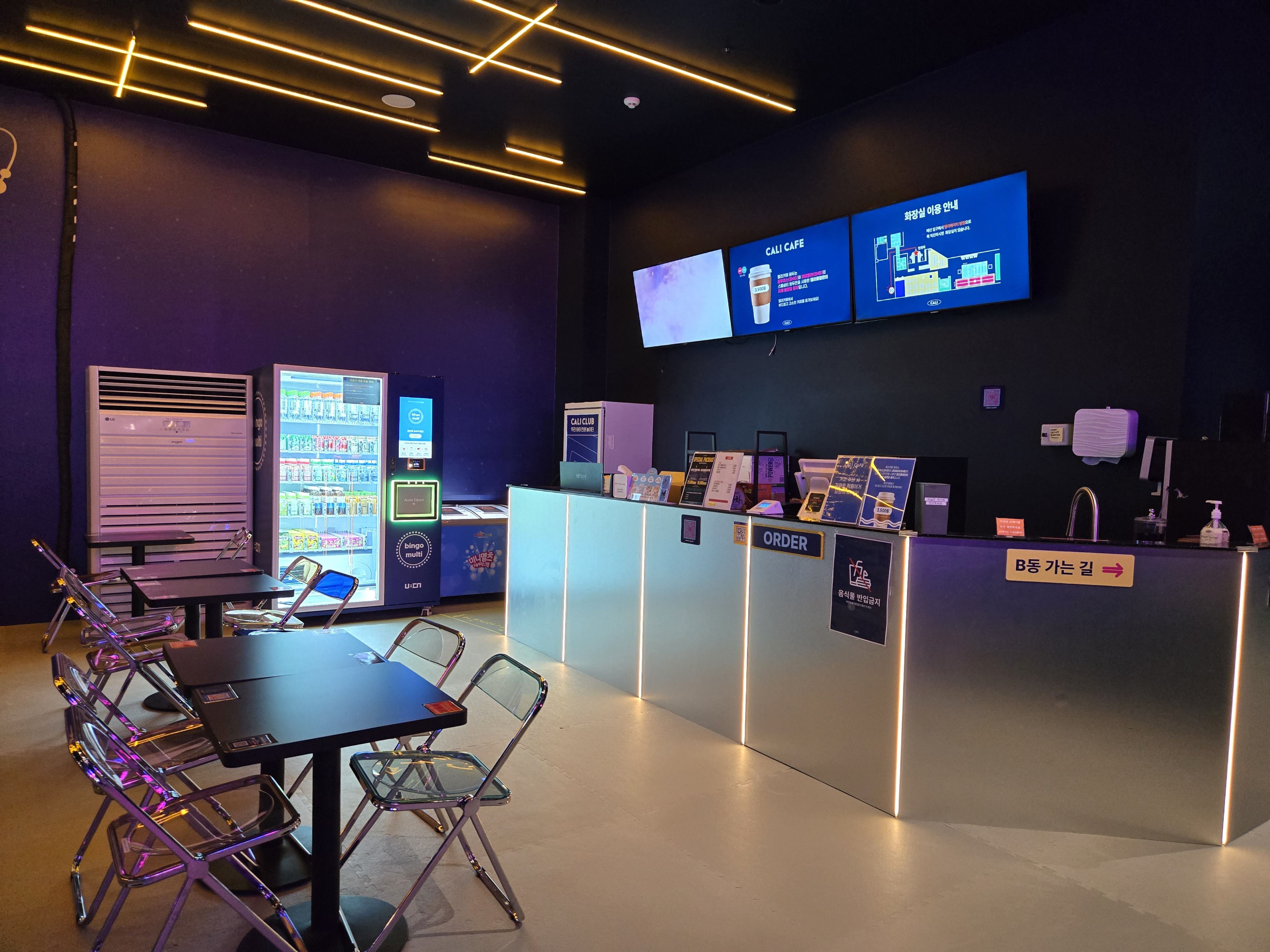들어가자마자 입구에는 카페와 간식이 파는 공간이 있고, 그 옆으로 정수기와 손 씻는 곳도 있습니다.