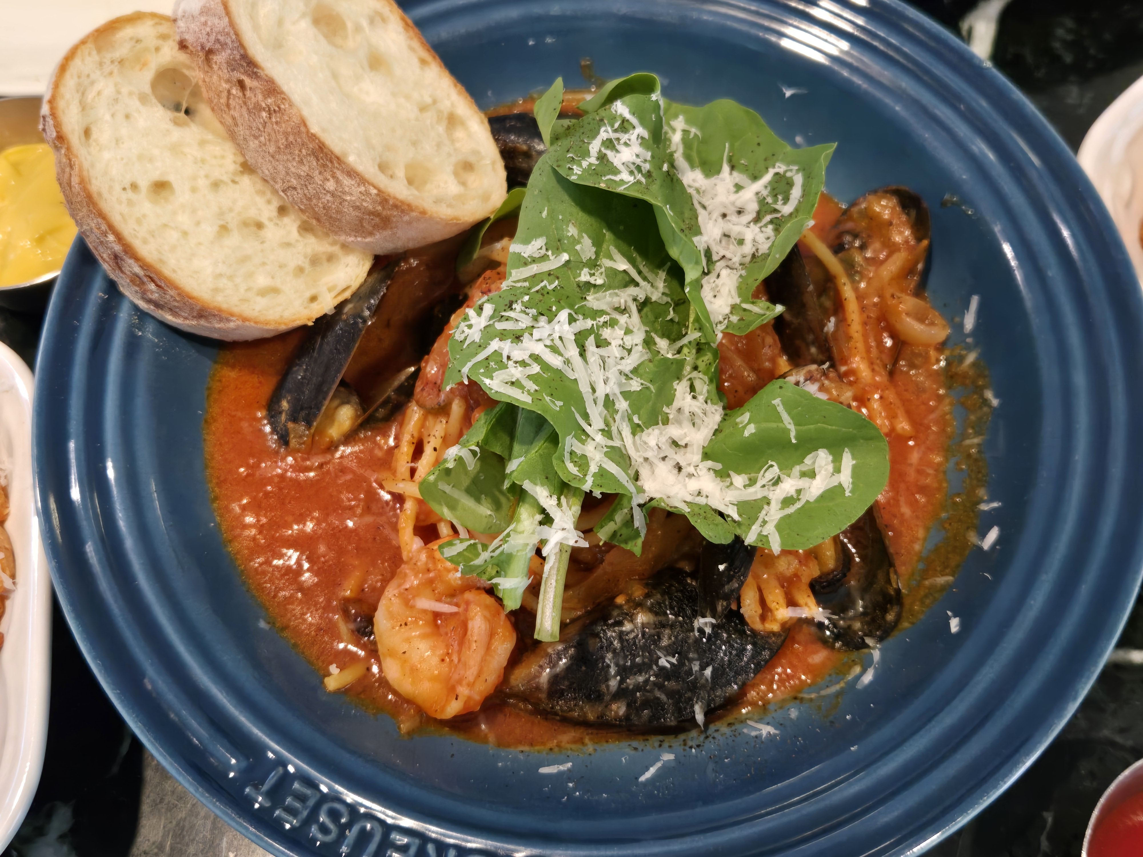 토마토 소스와 모듬 해산물(갑오징어+새우+그린홍합)과 루꼴라로 맛을 낸 파스타인데요~