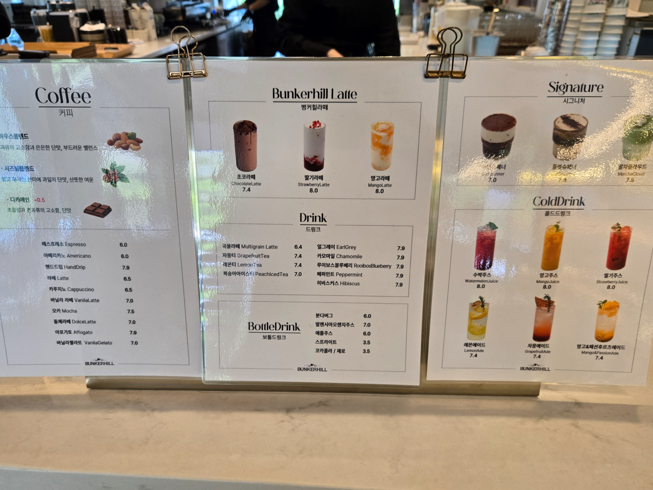 파주 벙커힐 카페의 음료는 커피, 라떼, 드링크, 보틀드링크, 시그니처, 콜드드링크의 메뉴가 있었습니다.