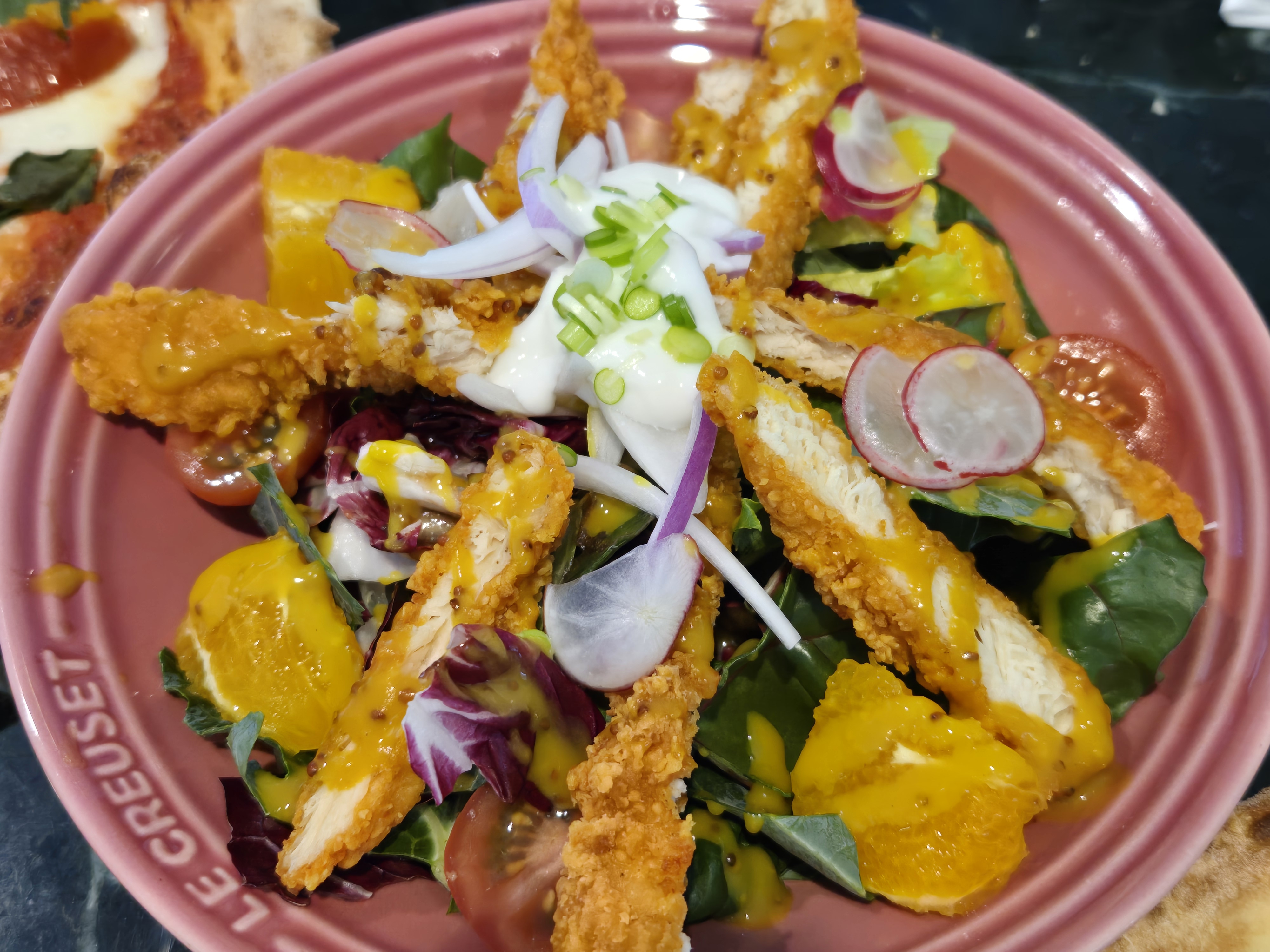 닭안심 치킨텐더와 오렌지, 방울토마토, 레디쉬, 허니머스터드, 적양파와 사워크림이 들어간 샐러드였습니다.