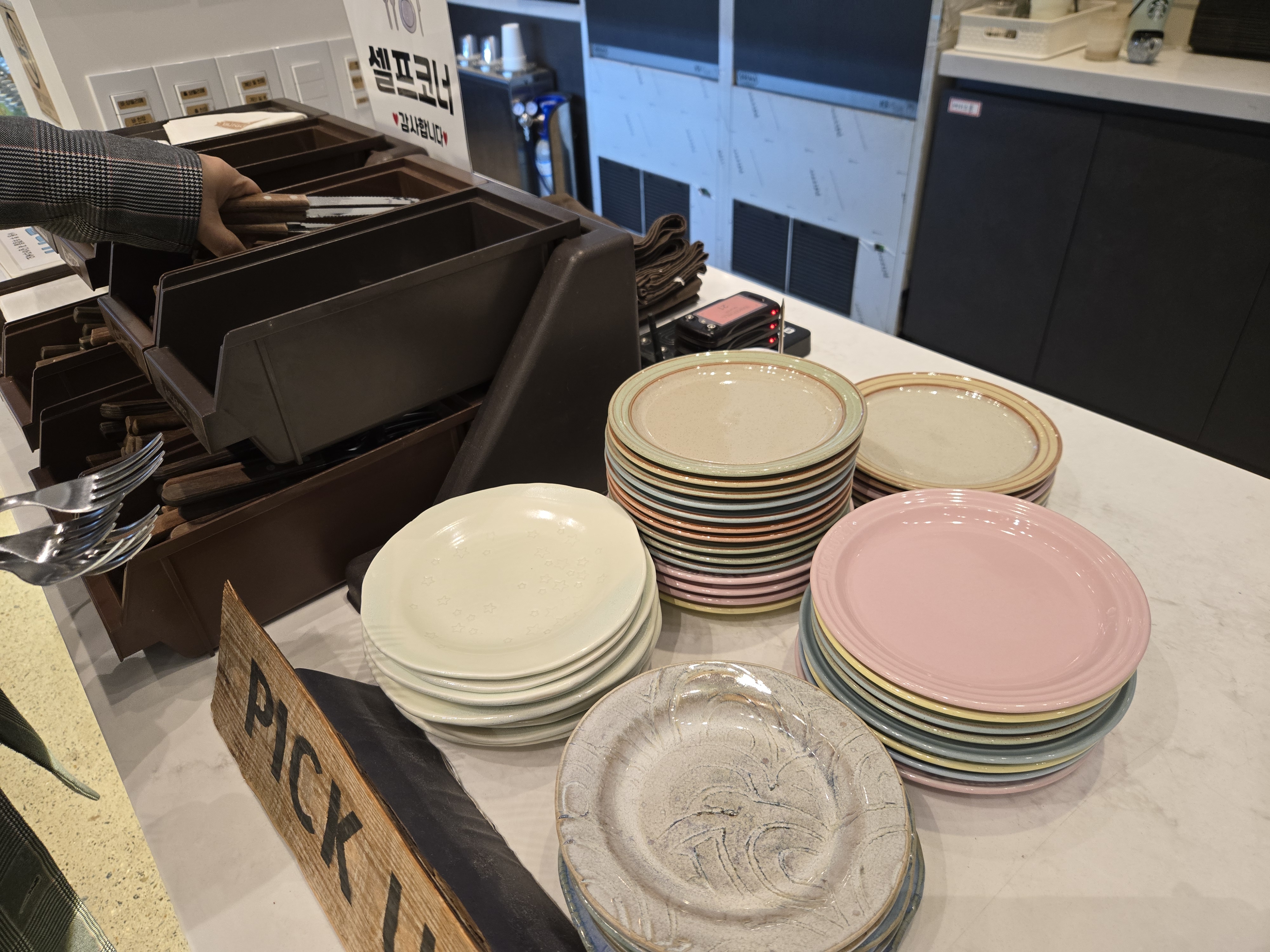 메뉴 주문을 하고 진동벨이 울리고 메뉴가 나오면 픽업대에서 셀프로 앞접시와 포크, 나이프, 냅킨 등을 가져가면 됩니다~