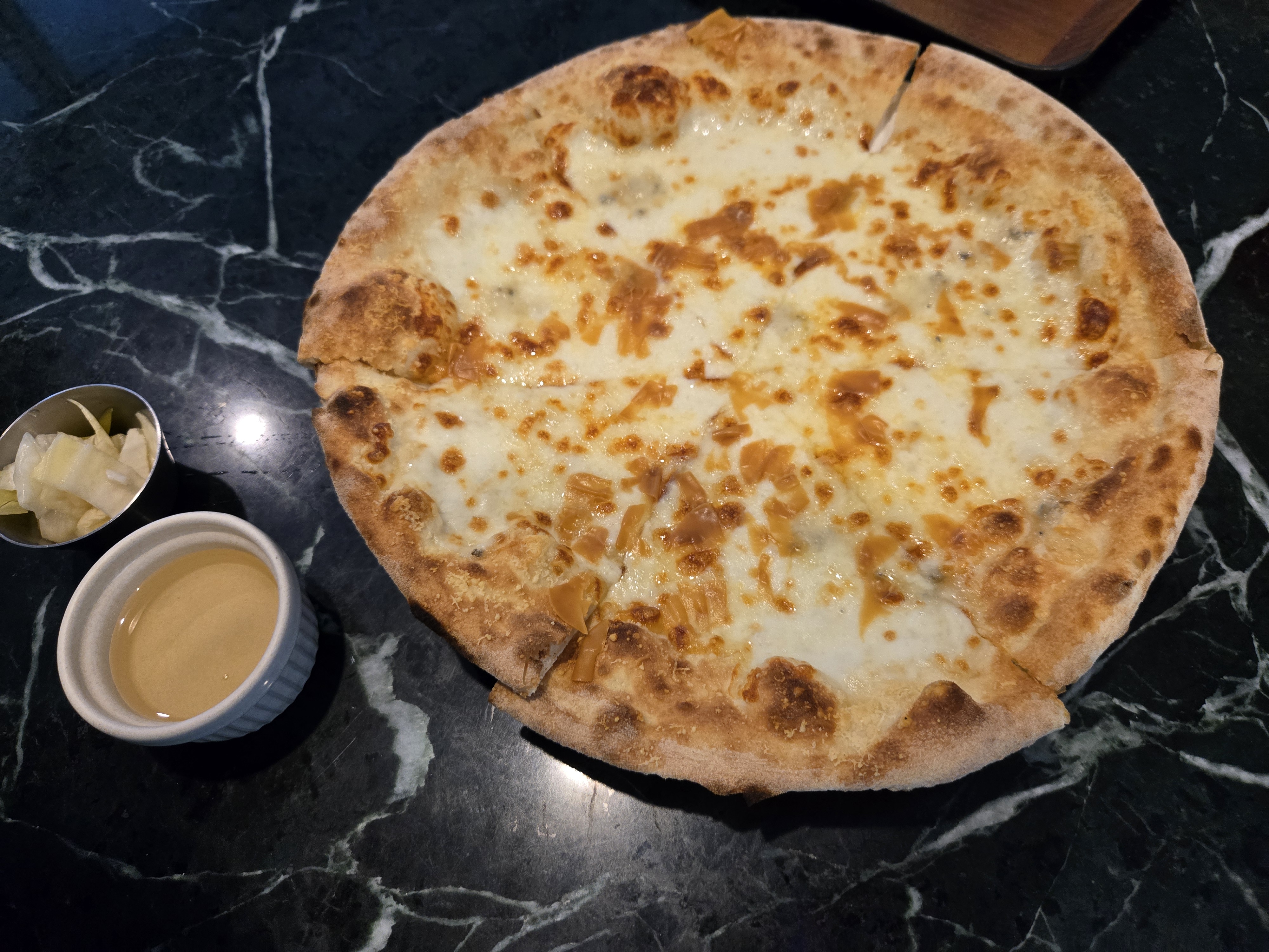 고르곤졸라 치즈, 그라나파다노, 브라운치즈, 모짜렐라 치즈를 올려 만든 피자를 꿀에 찍어먹으니 꿀맛이었습니다 ㅎㅎ