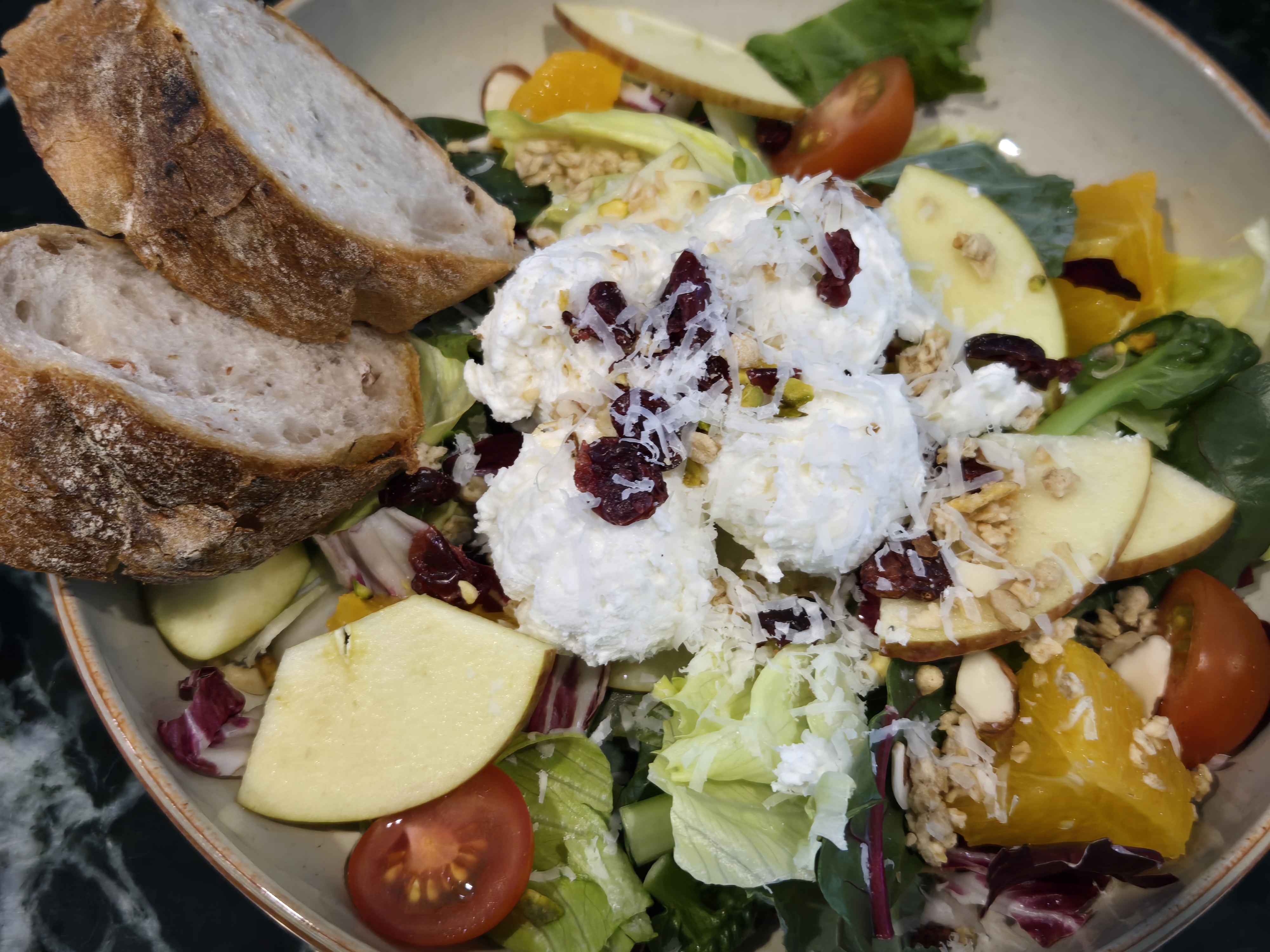 리코타치즈와 제철과일, 오렌지, 방울토마토, 크랜베리, 그래놀라, 캐슈넛, 그라나파다노, 화이트 드레싱의
