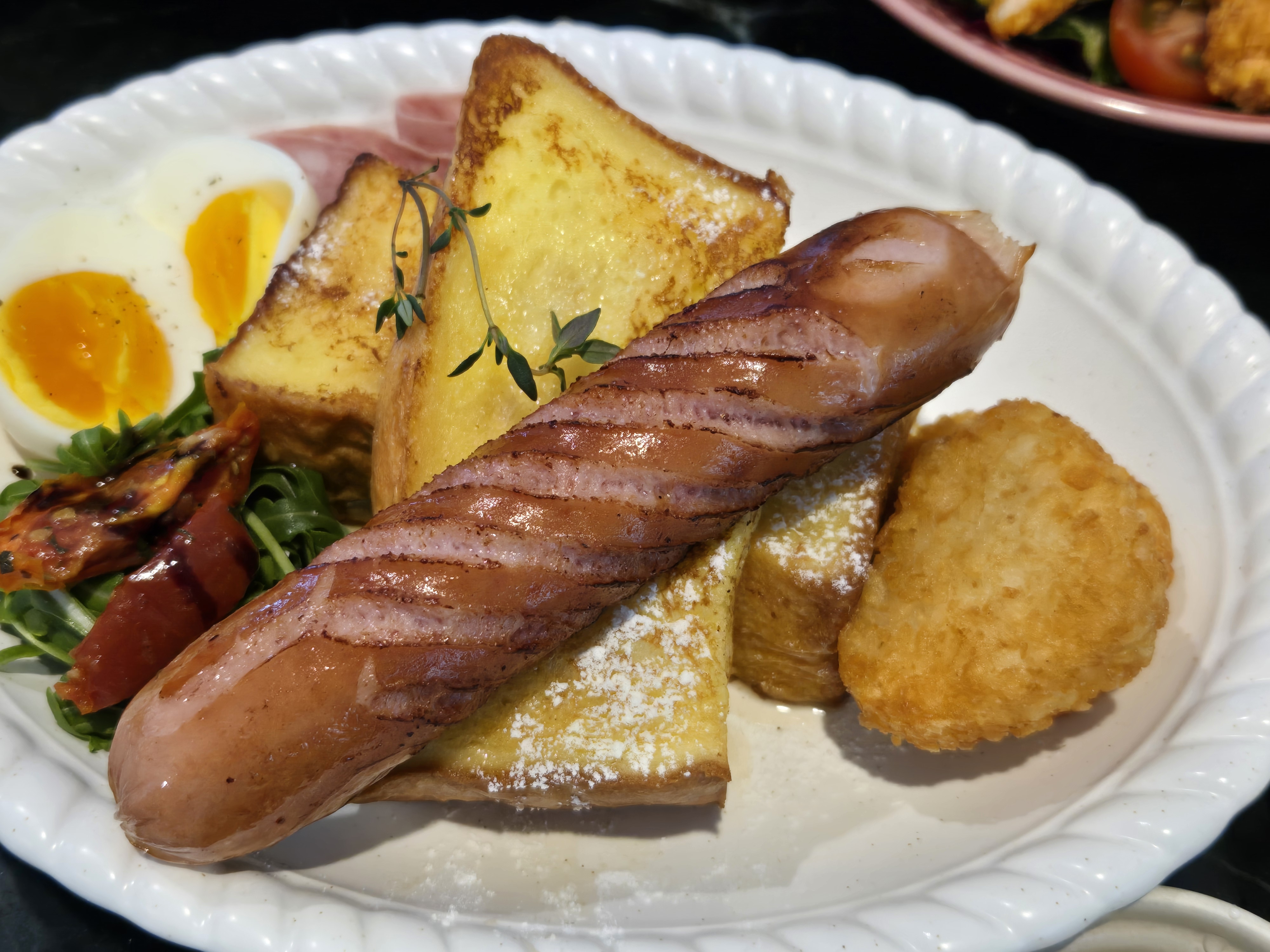 프렌치 토스트는 프렌치 토스트와 소세지, 모짜렐라, 루꼴라, 썬드라이토마토, 해쉬브라운과 반숙란이 들어있었습니다.
