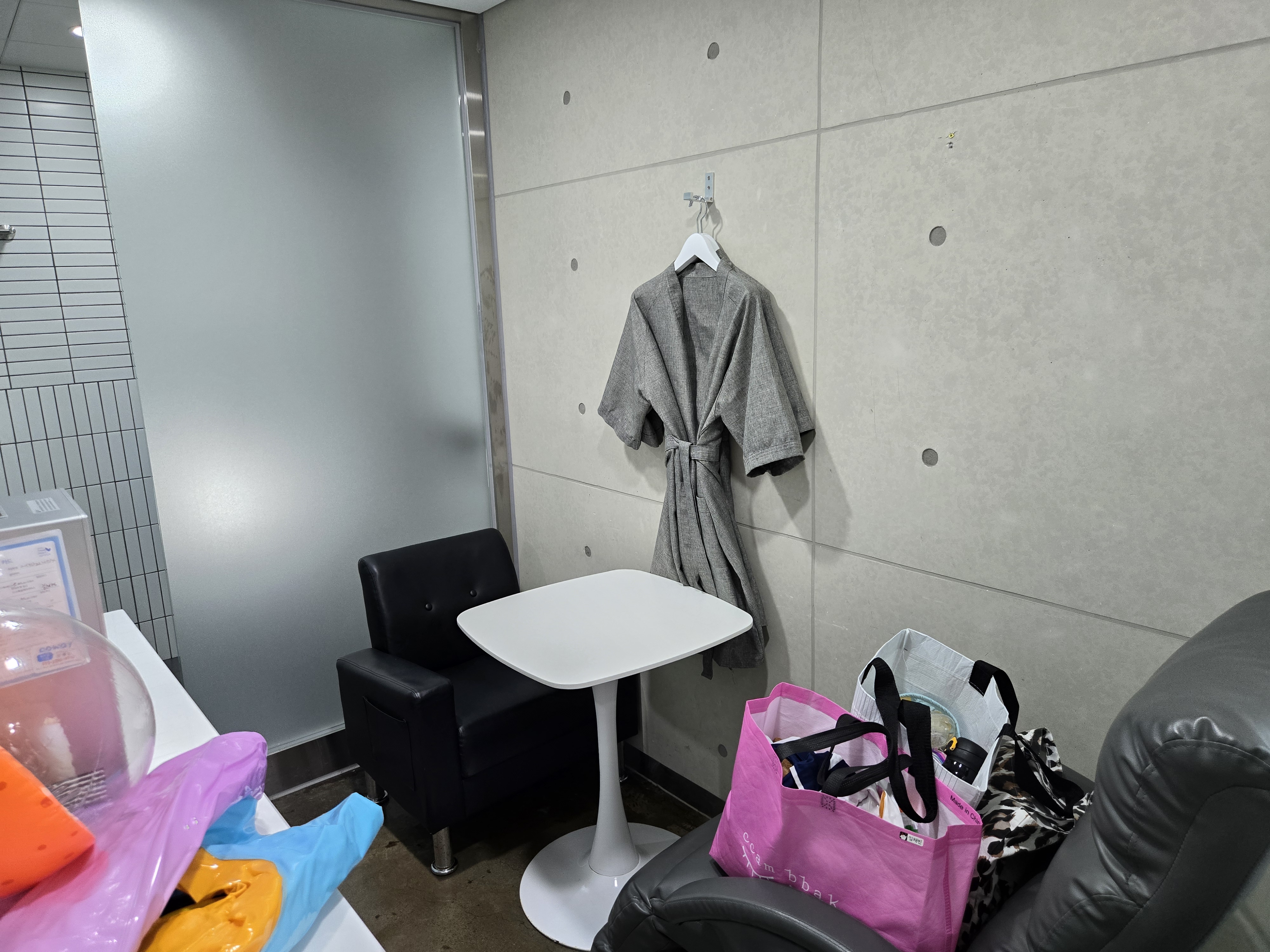 가평 수영장카페의 데이룸 안에는 테이블과 의자2개 그리고 샤워가운 2개가 걸려있었구요~
