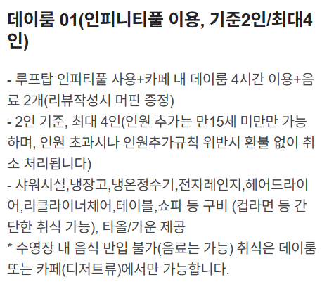 디온카페의 데이룸은 인피니티풀 사용과 카페 내 데이룸 4시간 이용 그리고 음료 2개가 제공되었습니다.