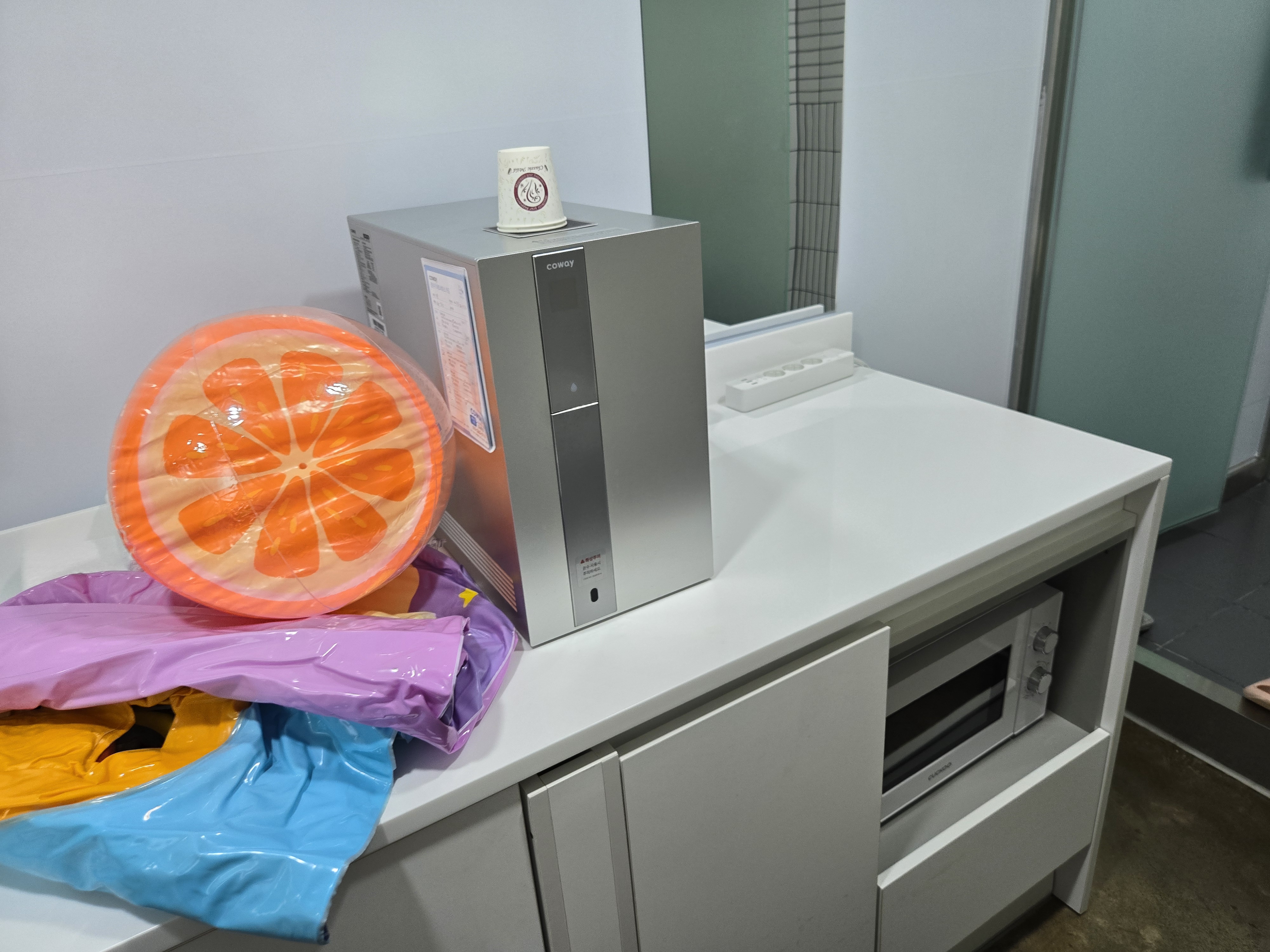 북한강 근처 디온카페 데이룸에는 정수기와 전자레인지, 작은 냉장고도 있었습니다.